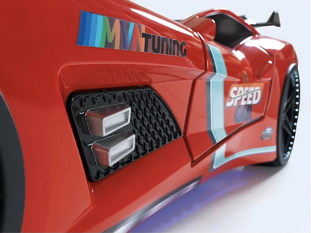 Lit voiture TURBO V8 avec LED et bruitages – 90x190-Rouge
