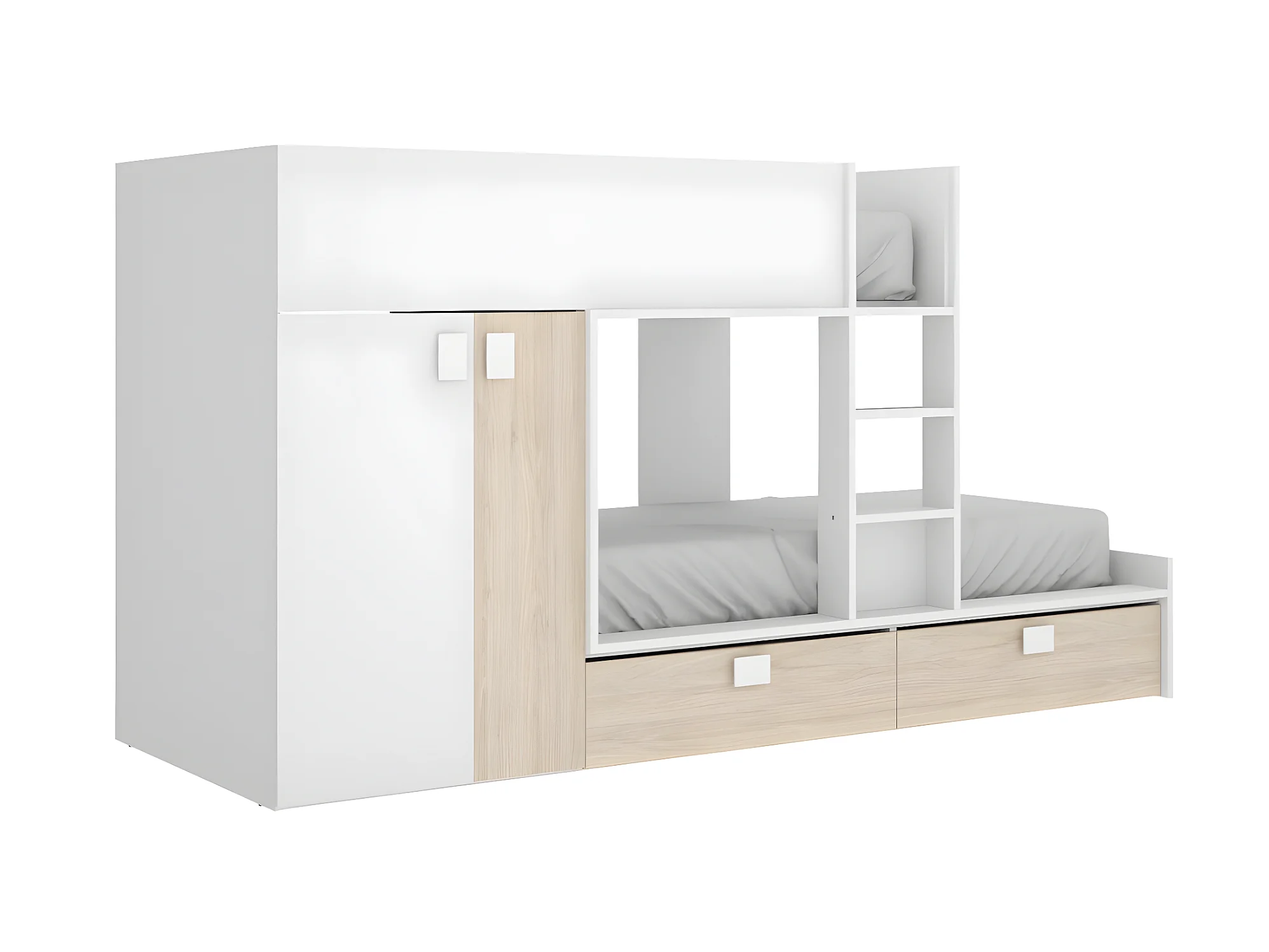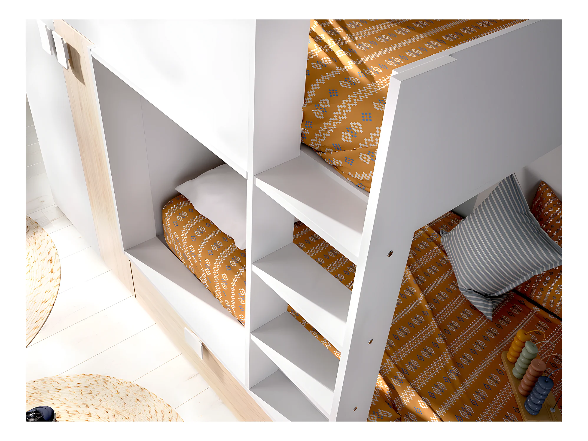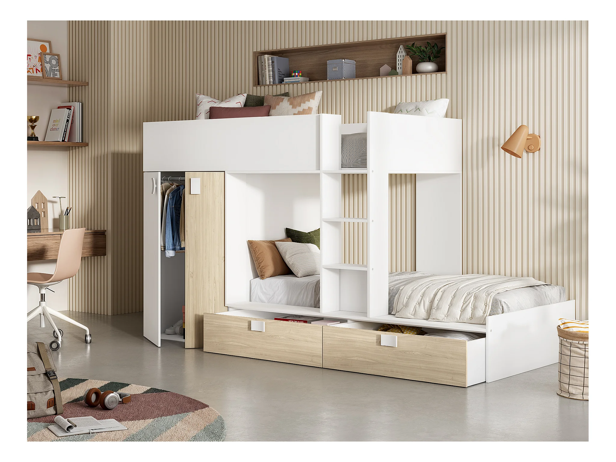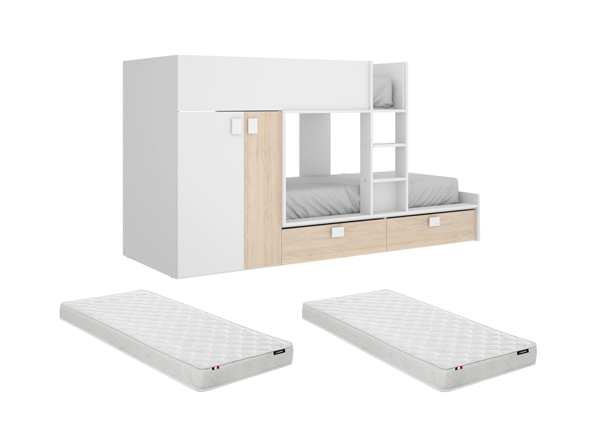 Lits Superposés 2 x 90 x 190 cm - Armoire intégrée - Blanc et naturel + matelas - JUANITO