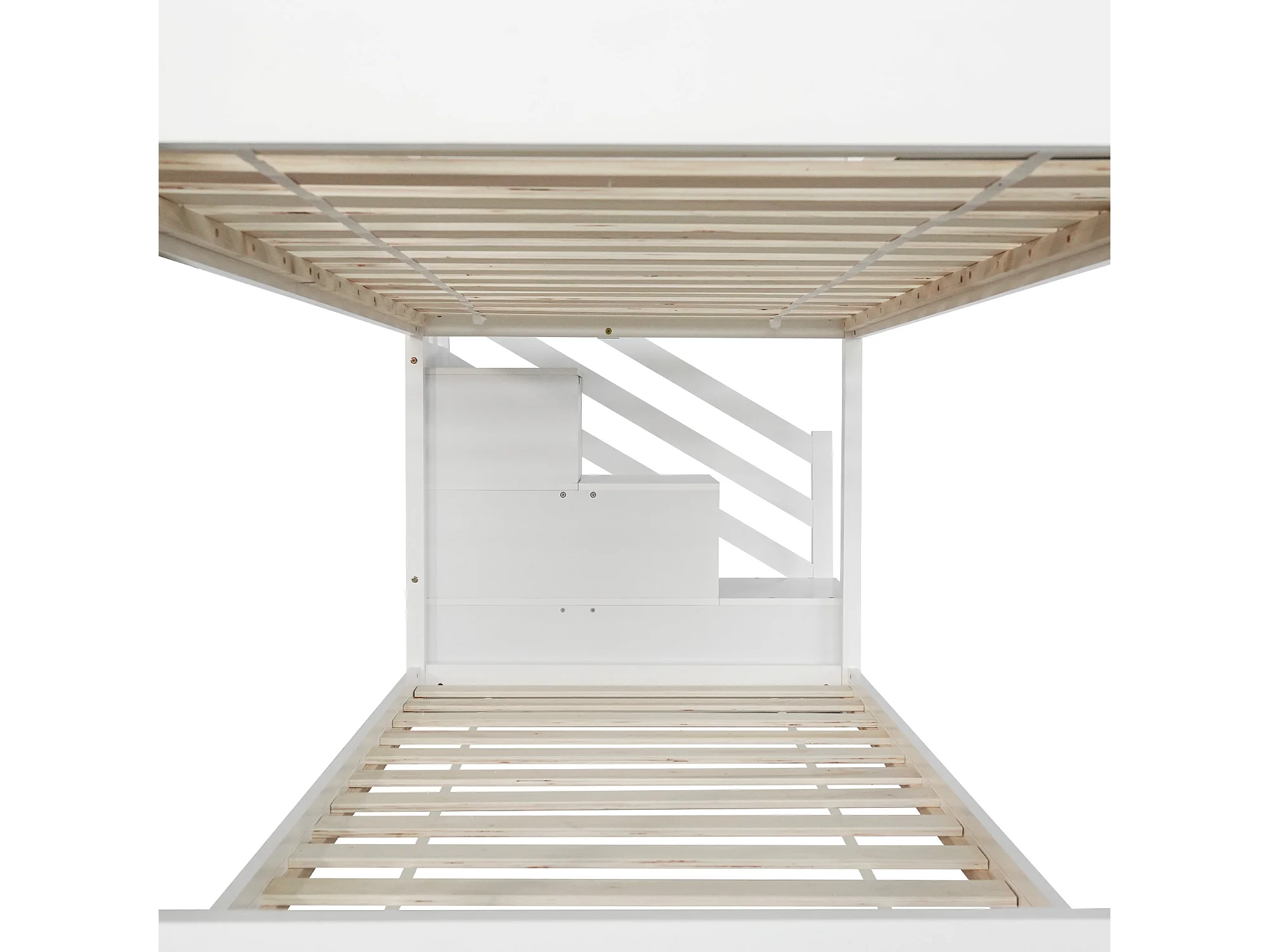 Lit superposé enfant 90x200 cm - en bois massif - avec escalier de rangement et 2 tiroirs - Blanc
