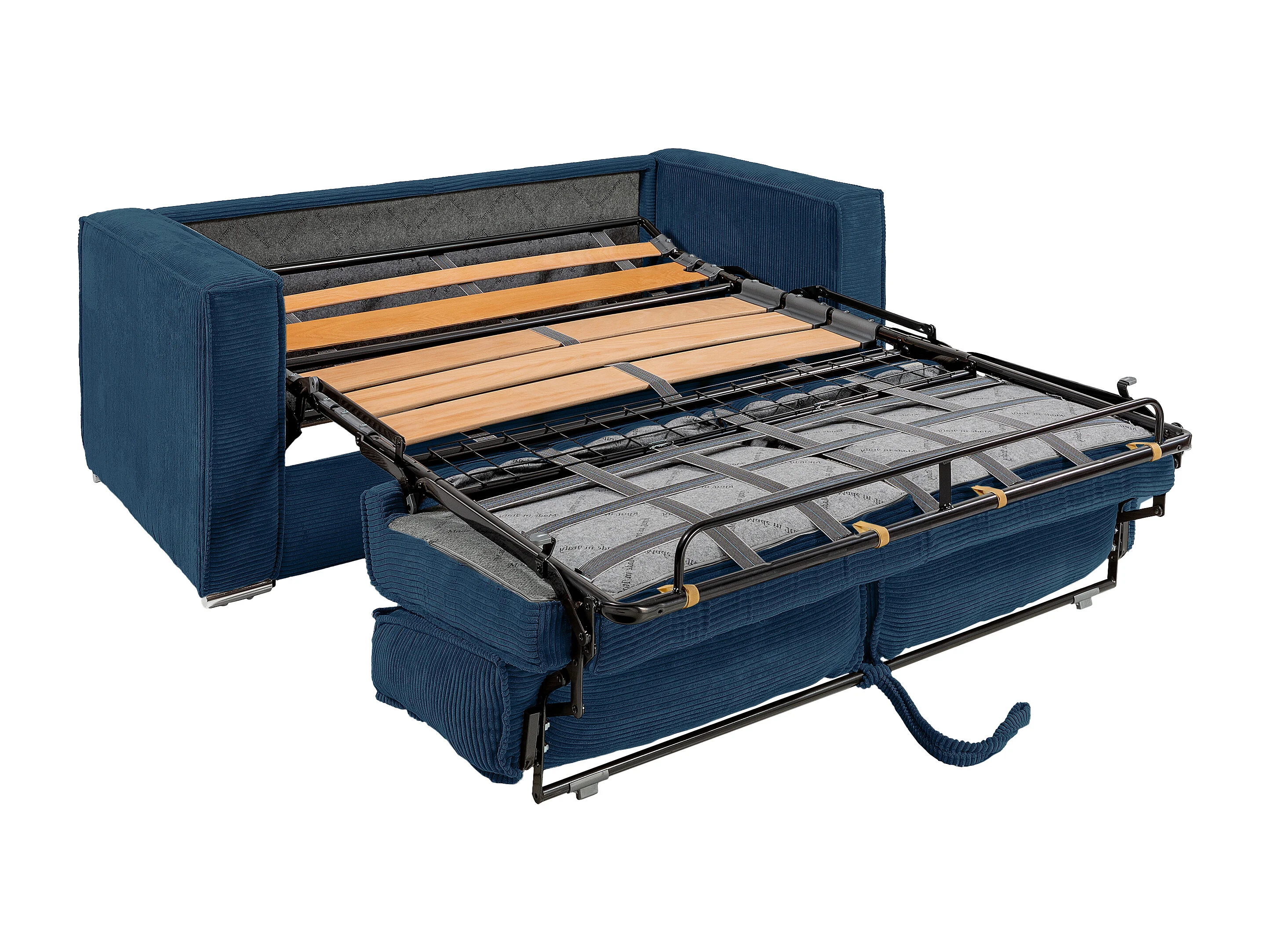 Canapé 4 places convertible express en velours côtelé bleu nuit avec assise mémoire de forme - Couchage à lattes larges 160 cm - Matelas 22 cm mémoire de forme LORETO