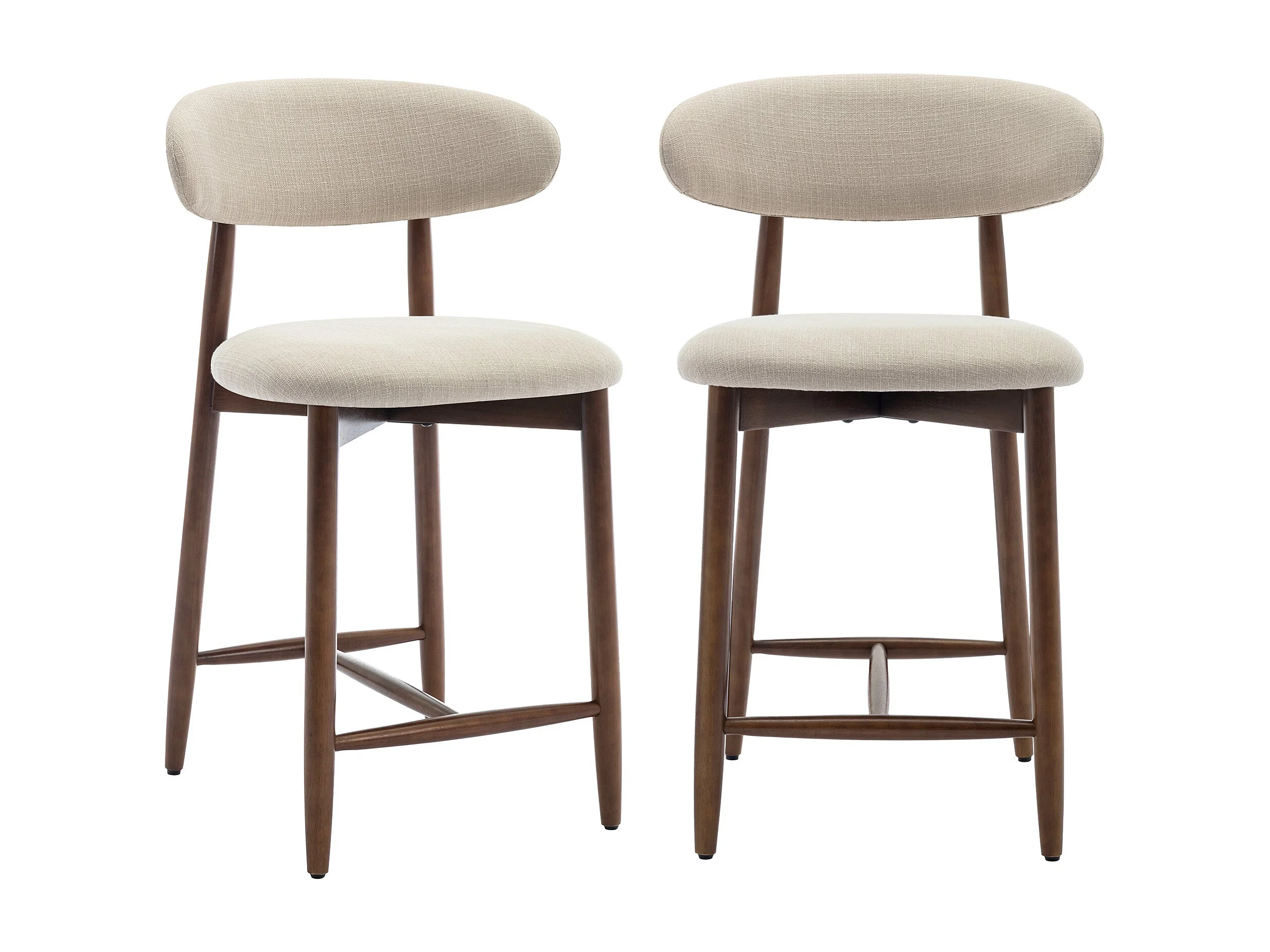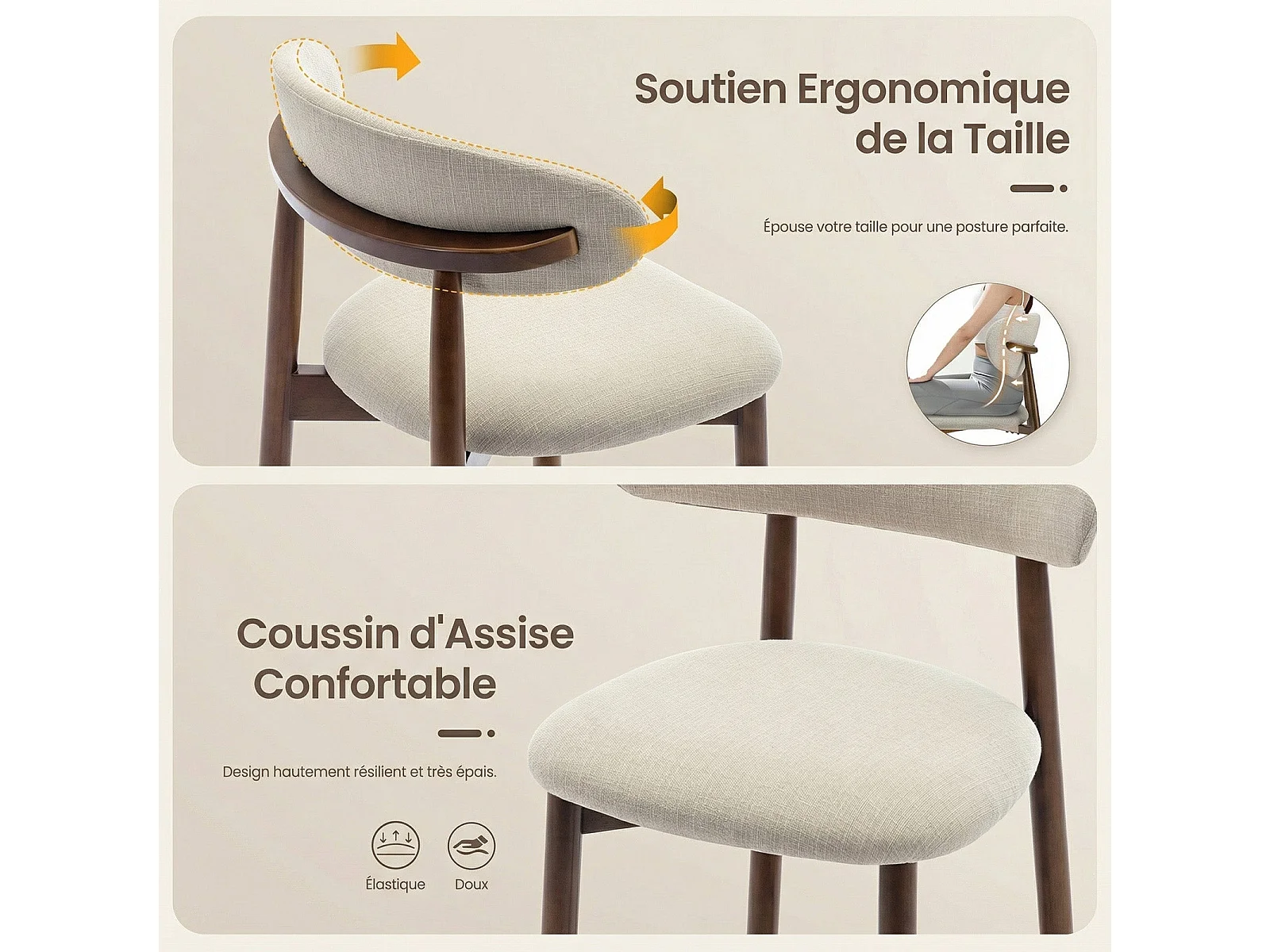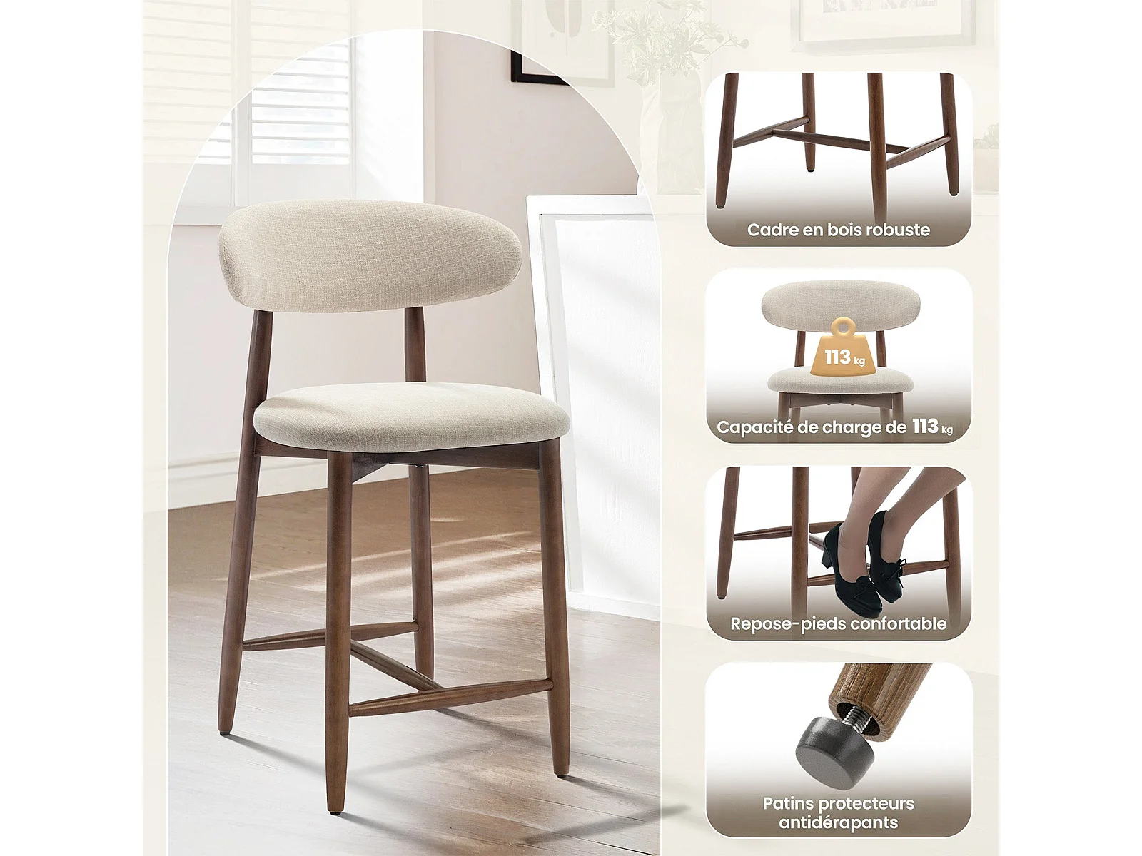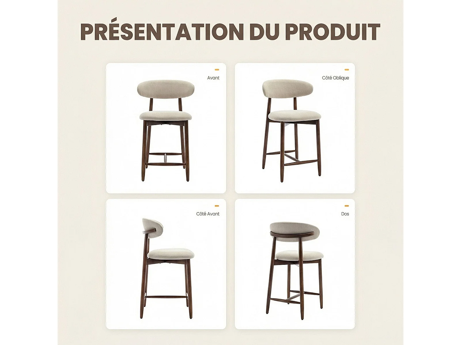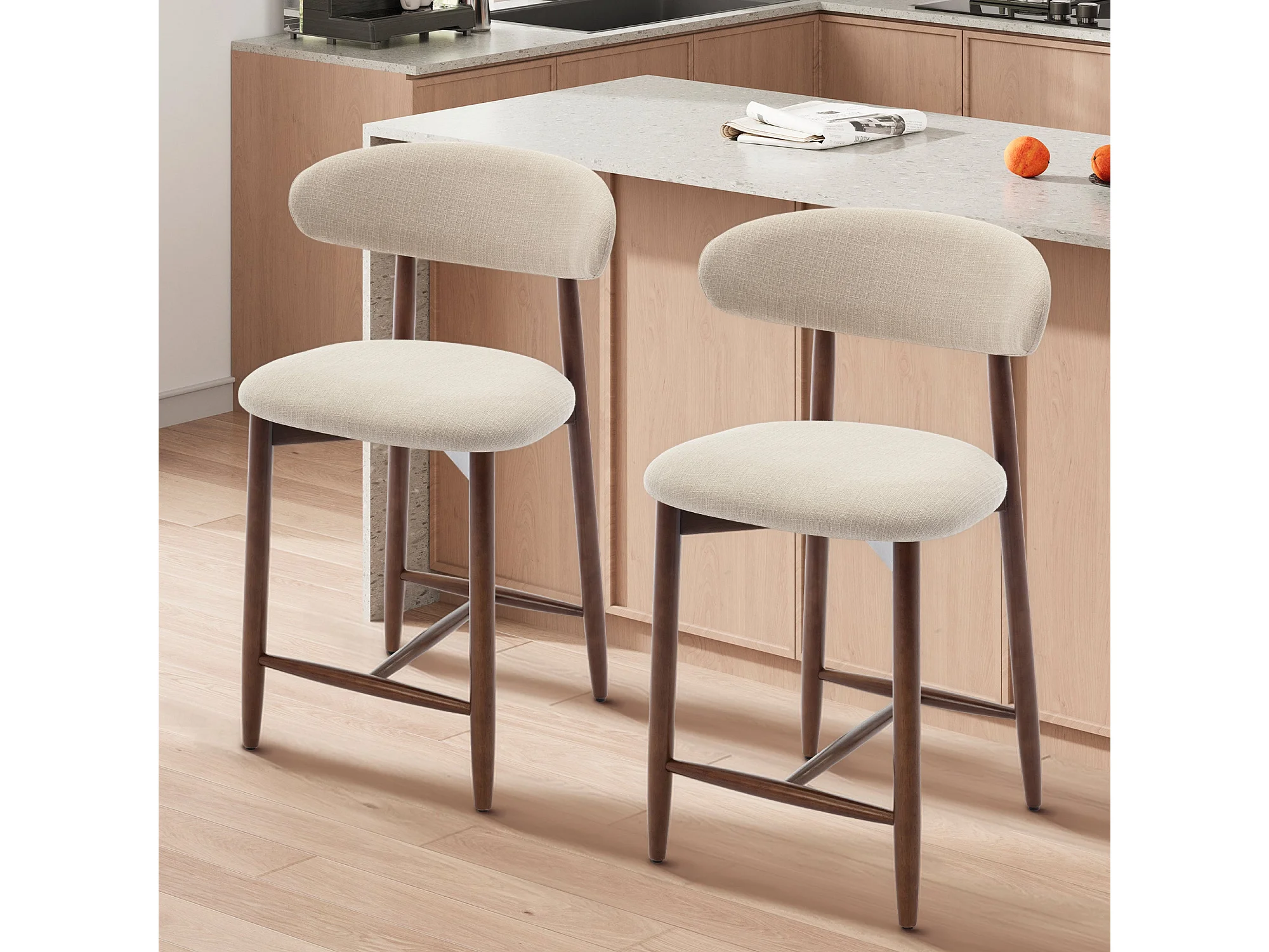 Lot de 2 chaises de bar – Tabourets modernes avec dossier haut, assise confortable en tissu, pour îlot de cuisine ou salle à manger-structure en bois-Beige