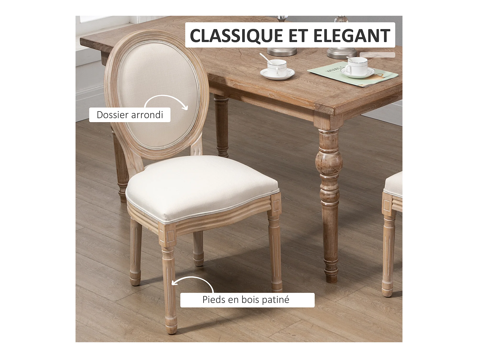 Lot de 2 chaises de salle à manger - chaise de salon médaillon style Louis XVI - bois massif sculpté, patiné - aspect lin beige