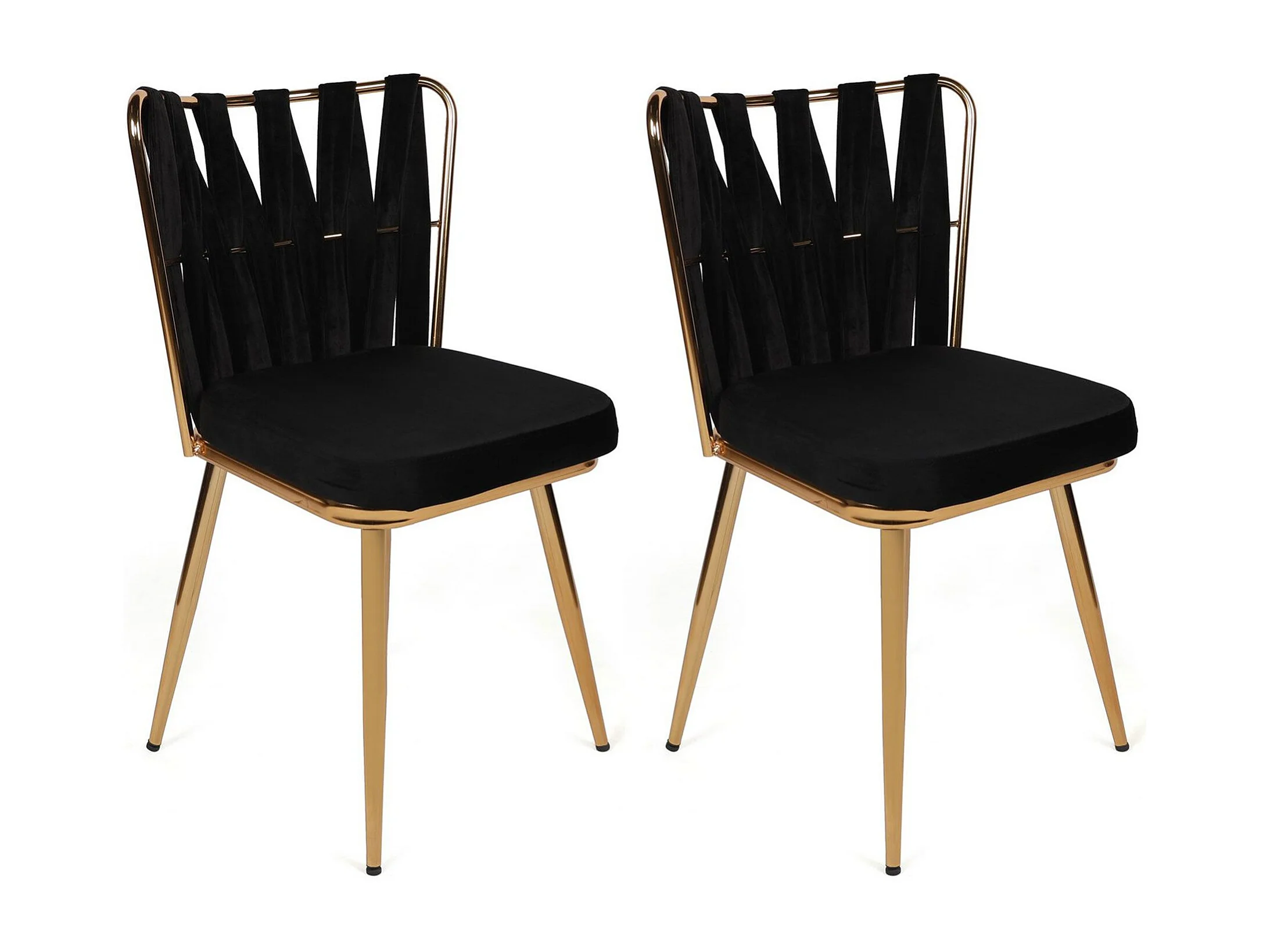 Lot de 2 chaises rembourrées en velours – Dossier tissé à la main, Pieds en métal doré, Moderne pour salle à manger et salon, Noir