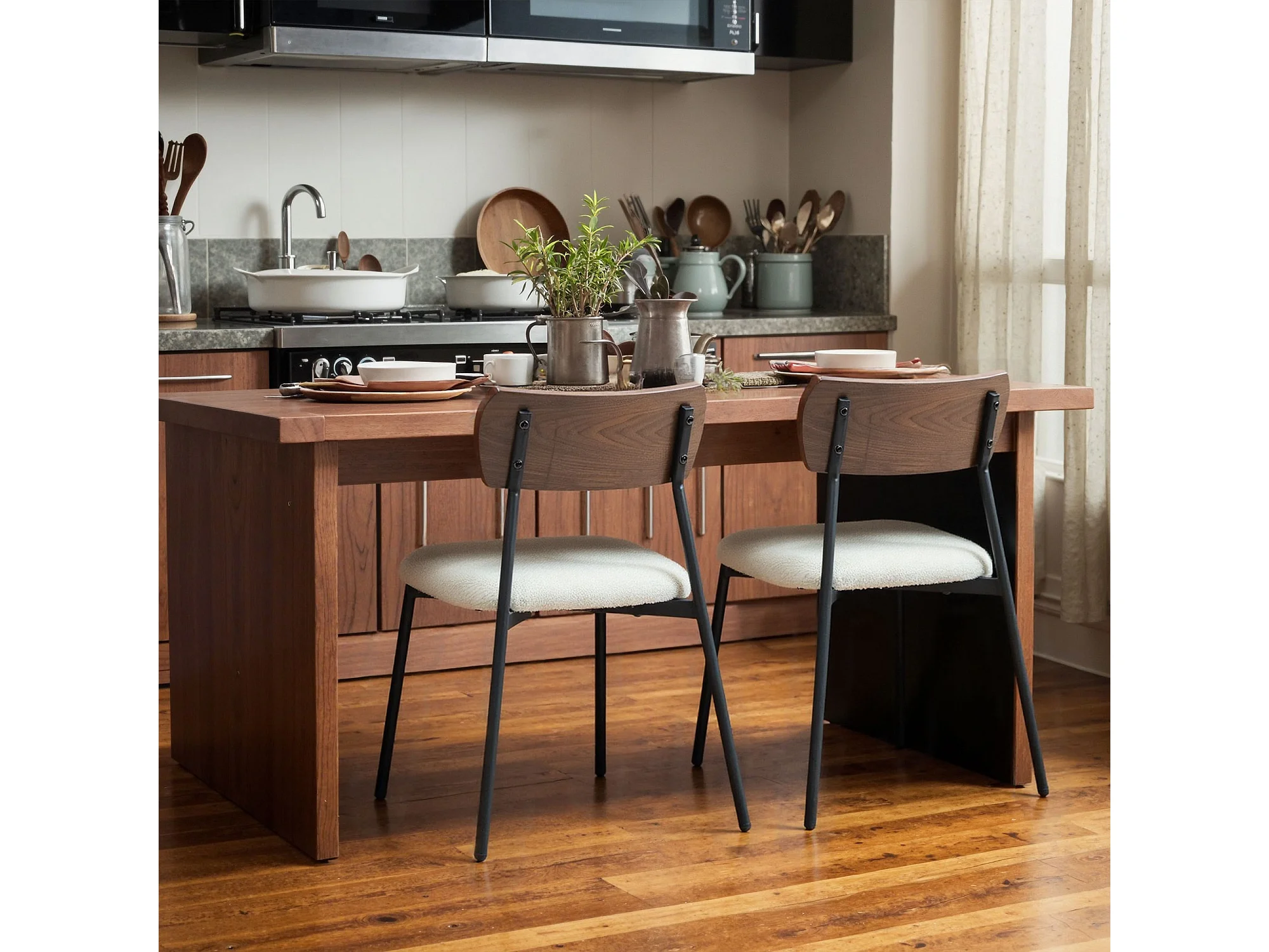 Lot de 2 chaises style vintage piètement structure métal noir dossier aspect bois assise effet laine bouclée blanc crème