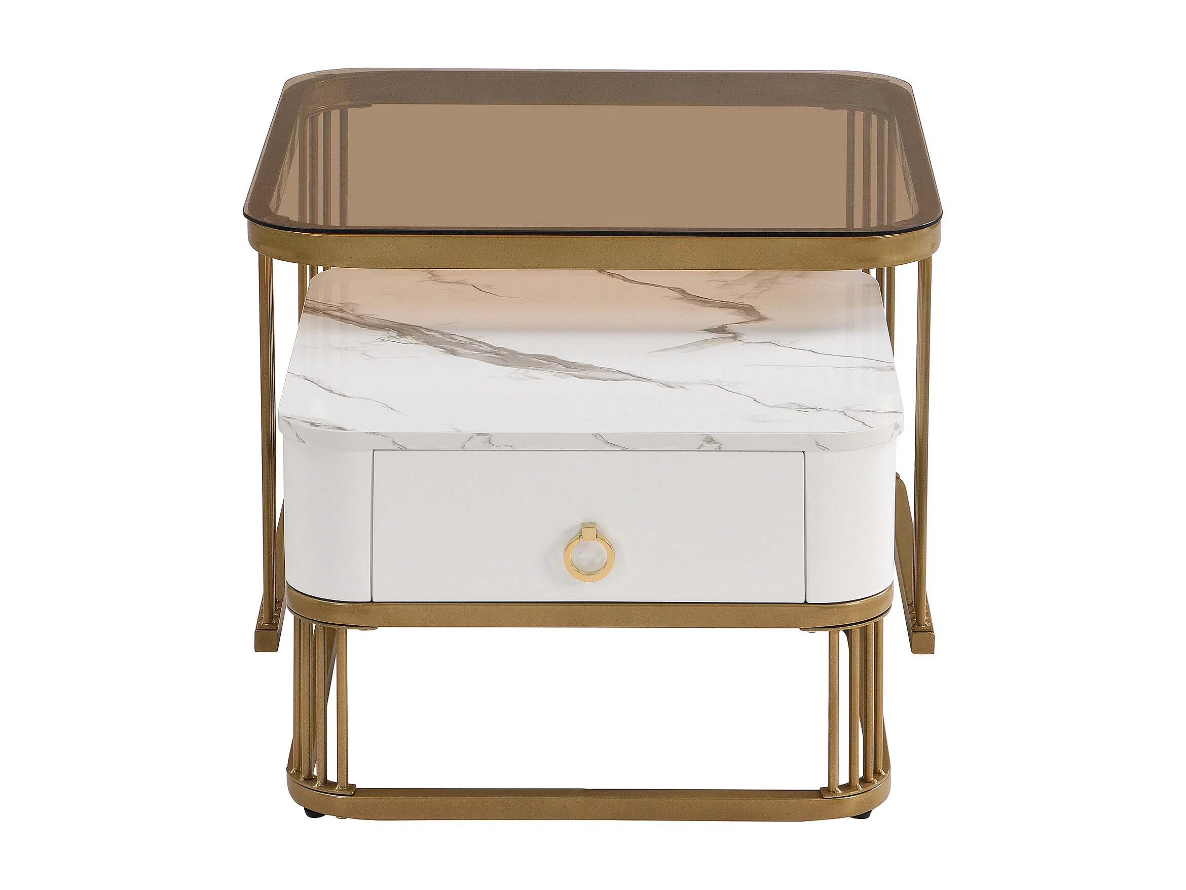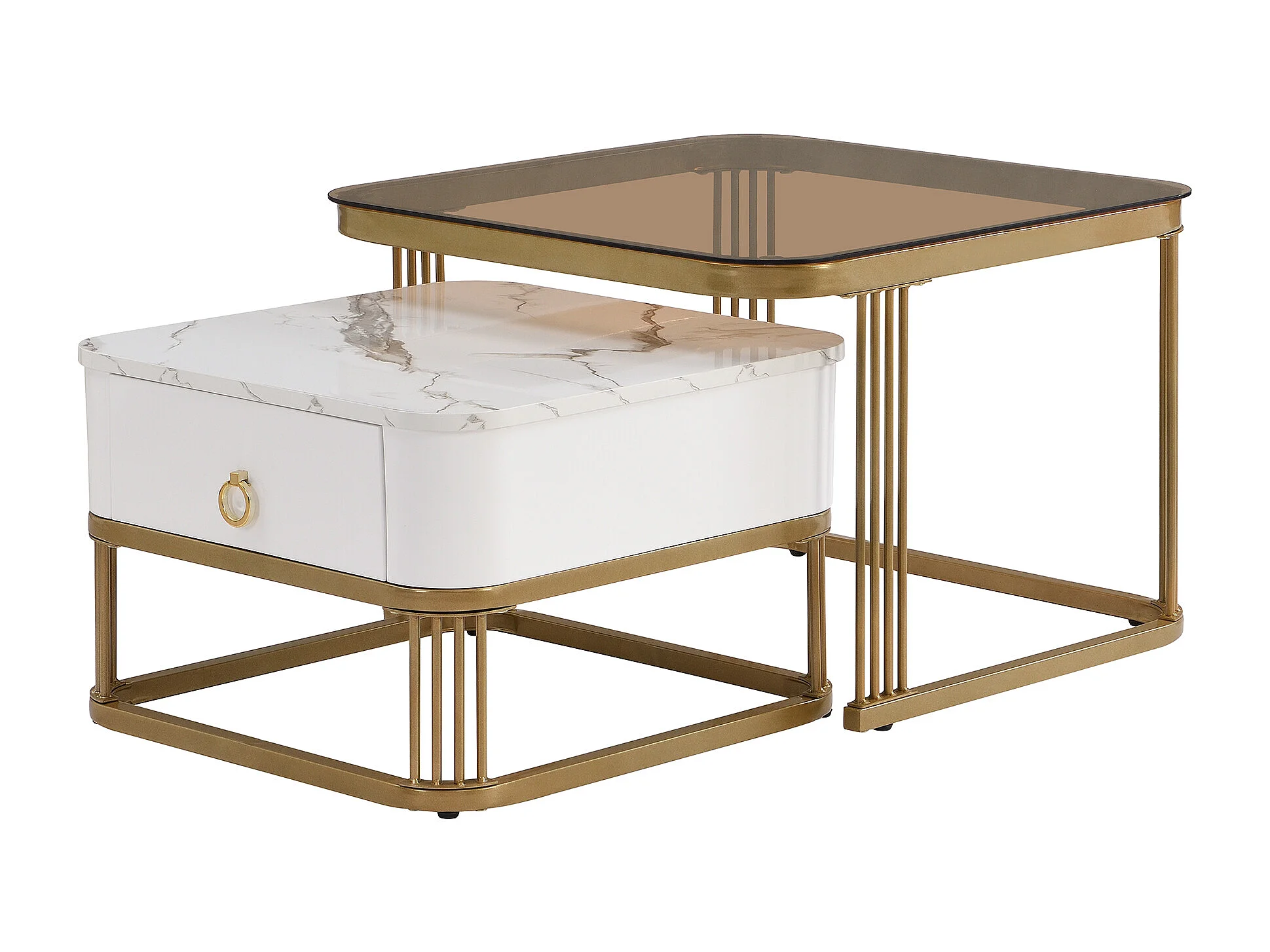 Lot de 2 table basse gigogne avec tiroir, plateaux en marbre brillant et verre, pieds doré