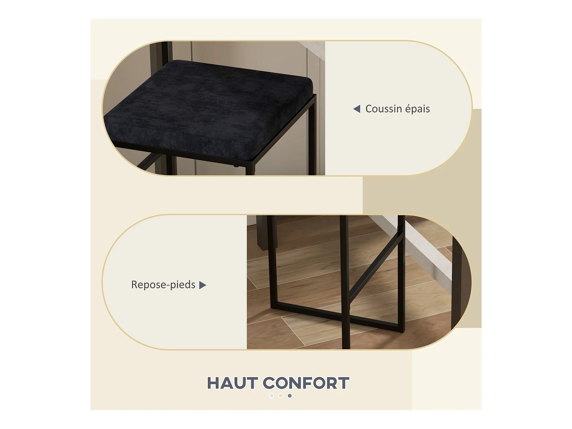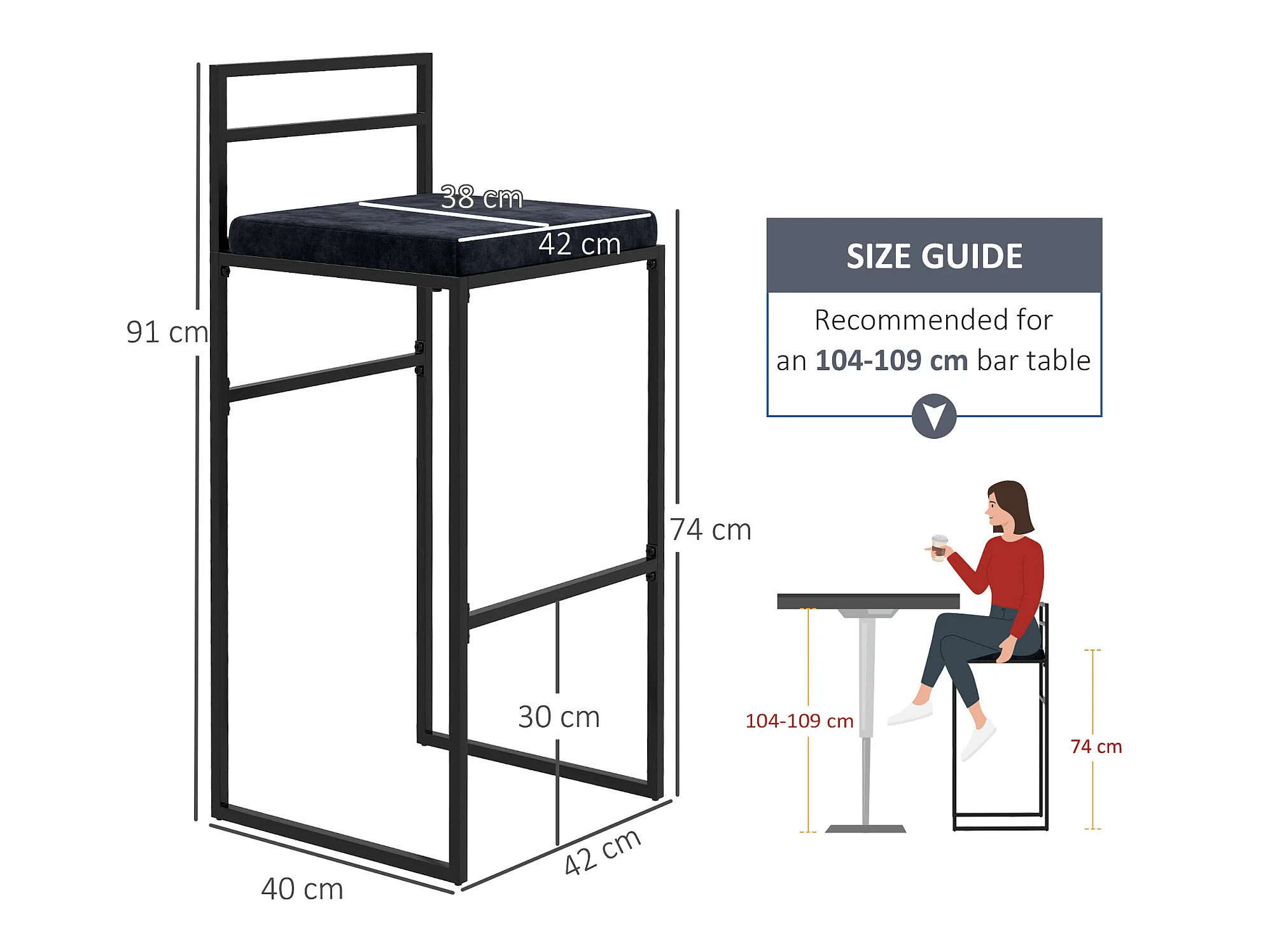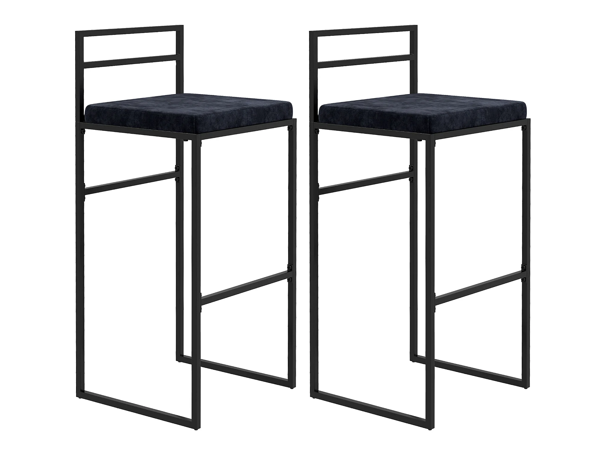 Lot de 2 tabourets de bar design - coussin, repose-pied, dossier intégrés - acier velours noir