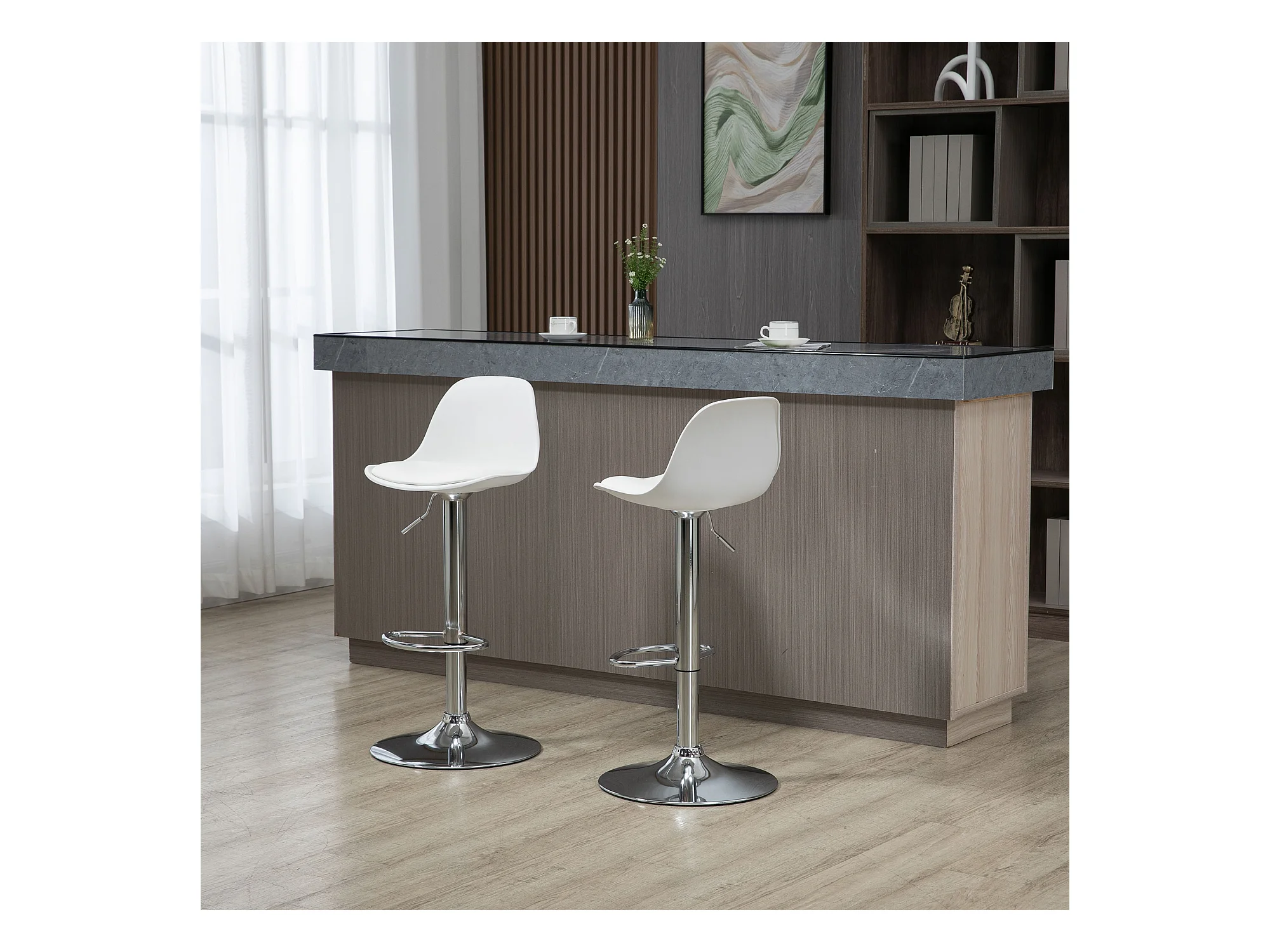 Lot de 2 tabourets de bar pivotantes en simili blanc, hauteur réglable, pied en métal argenté