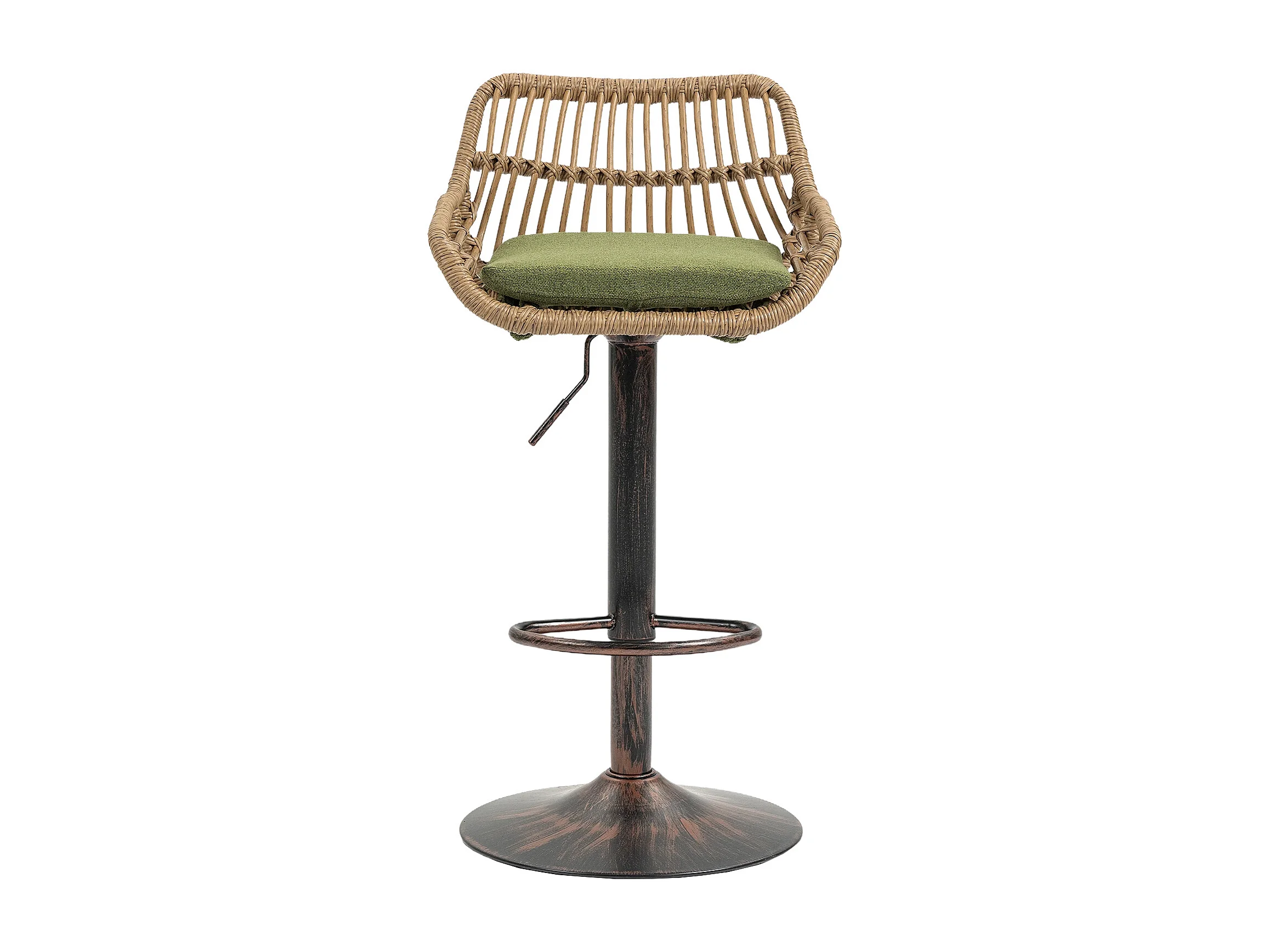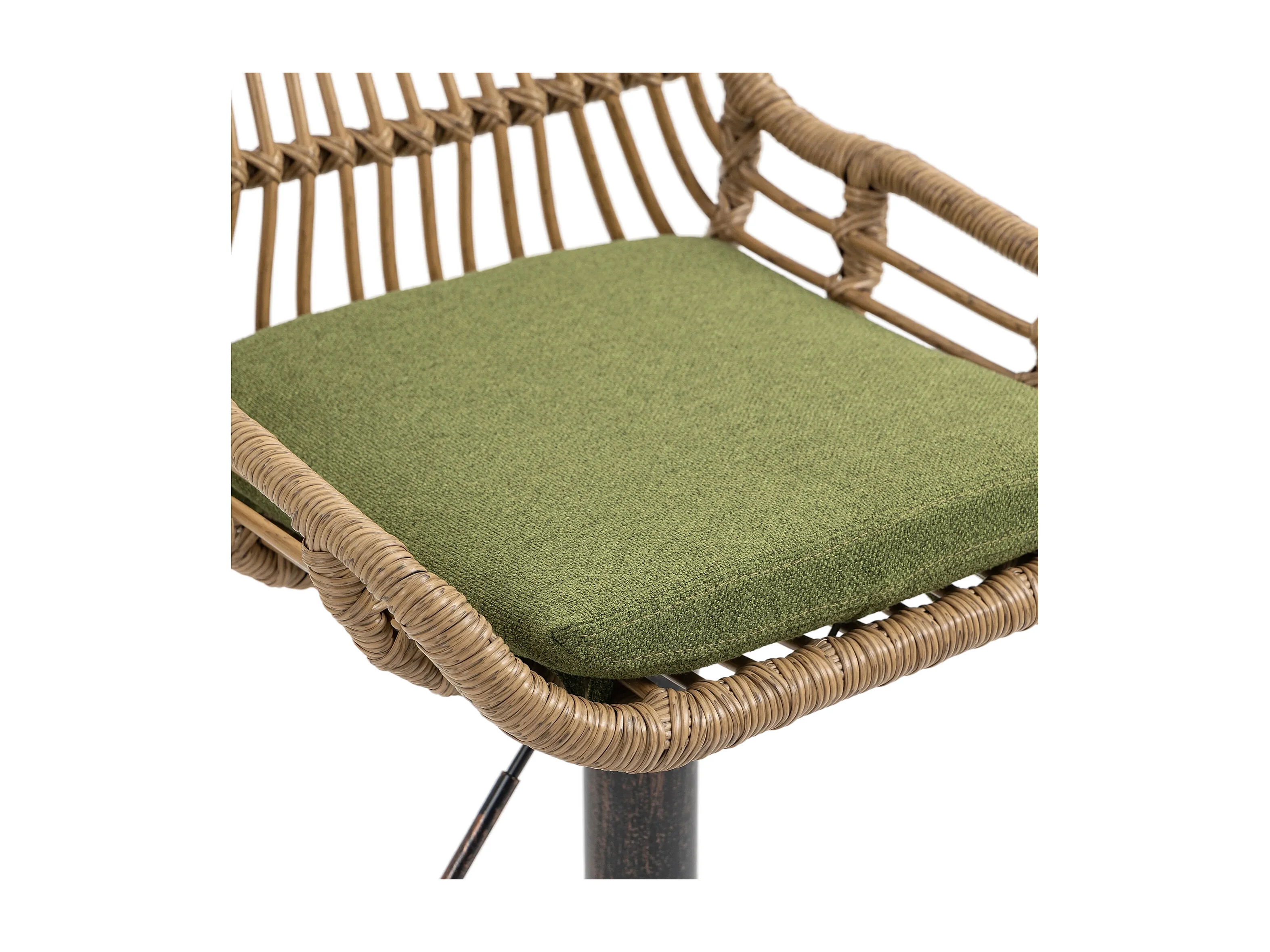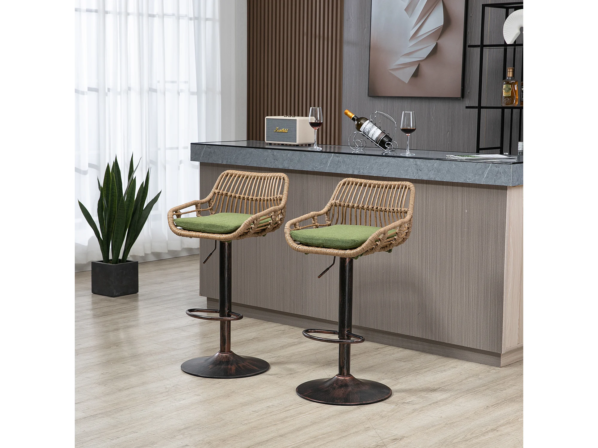 Lot de 2 tabourets réglables - Cadre en métal et dossier en rotin - Coussin vert en lin