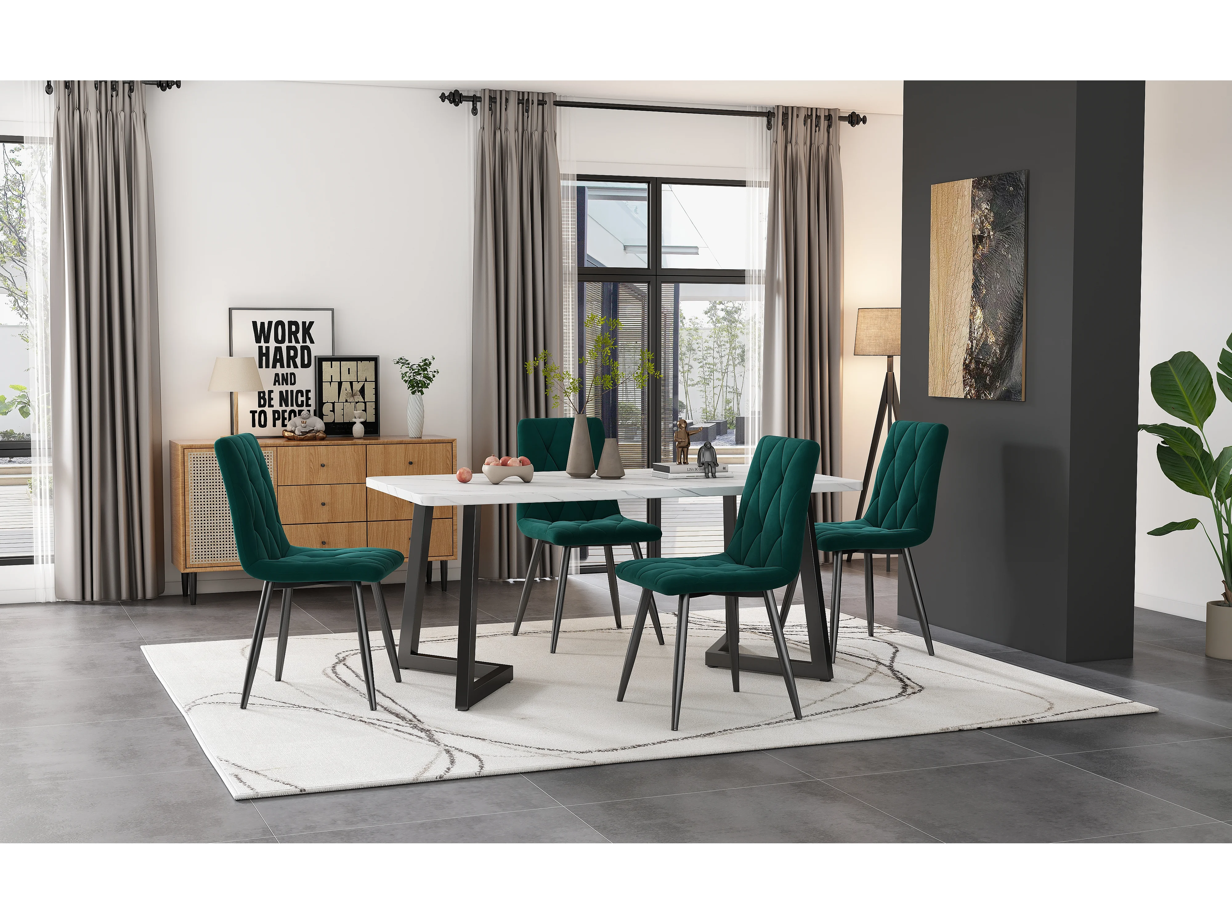 Lot de 4 chaises de salle à manger, dossier avec motif chevrons, pieds en métal noir, velours vert foncé