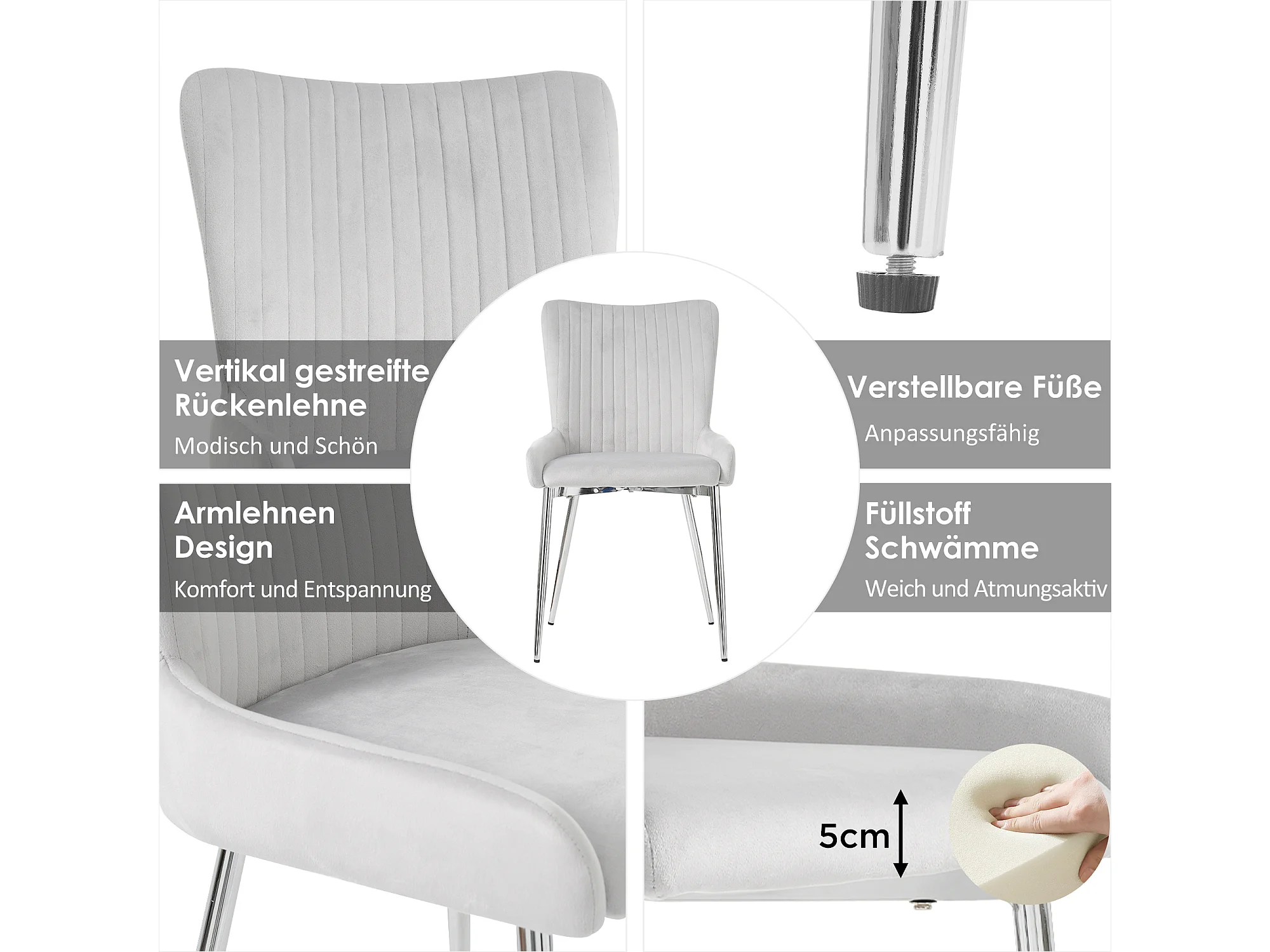 Lot de 4 chaises velours - 85 x 58 x 47 cm - chaise salon de luxe - quatre pieds en métal argenté - gris