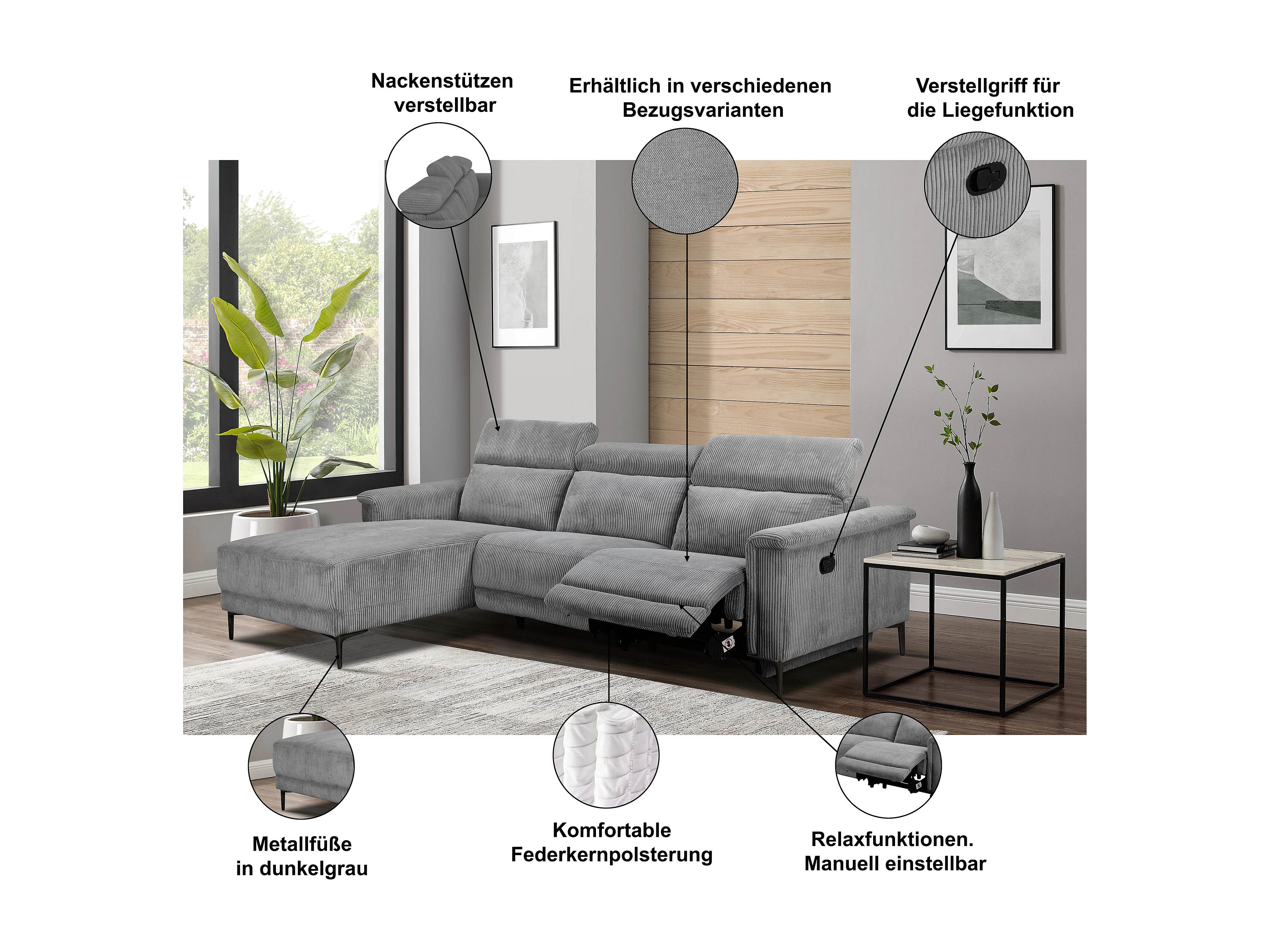 Lund | Canapé chaise longue avec un fauteuil inclinable à manuelleuel en tissu anthracite