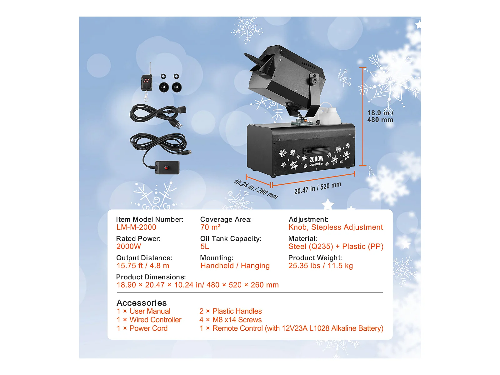 Machine à Neige SucceBuy, 2000 W avec Télécommande Sans Fil pour Événements, pour Noël, Mariages, Création d'un Monde Enneigé Magique