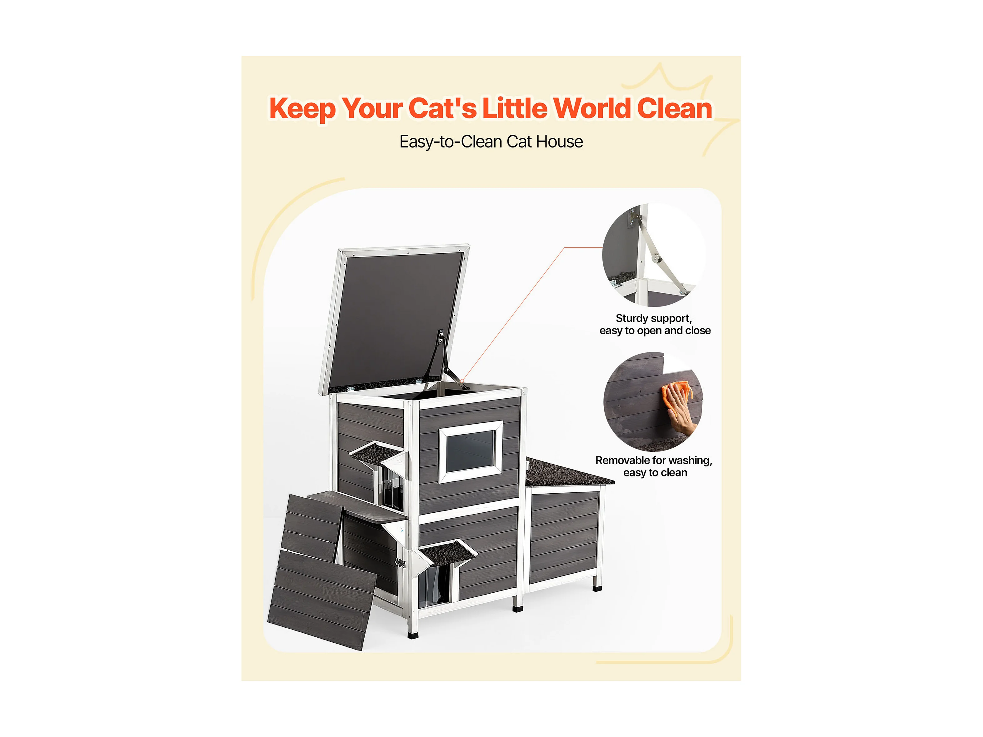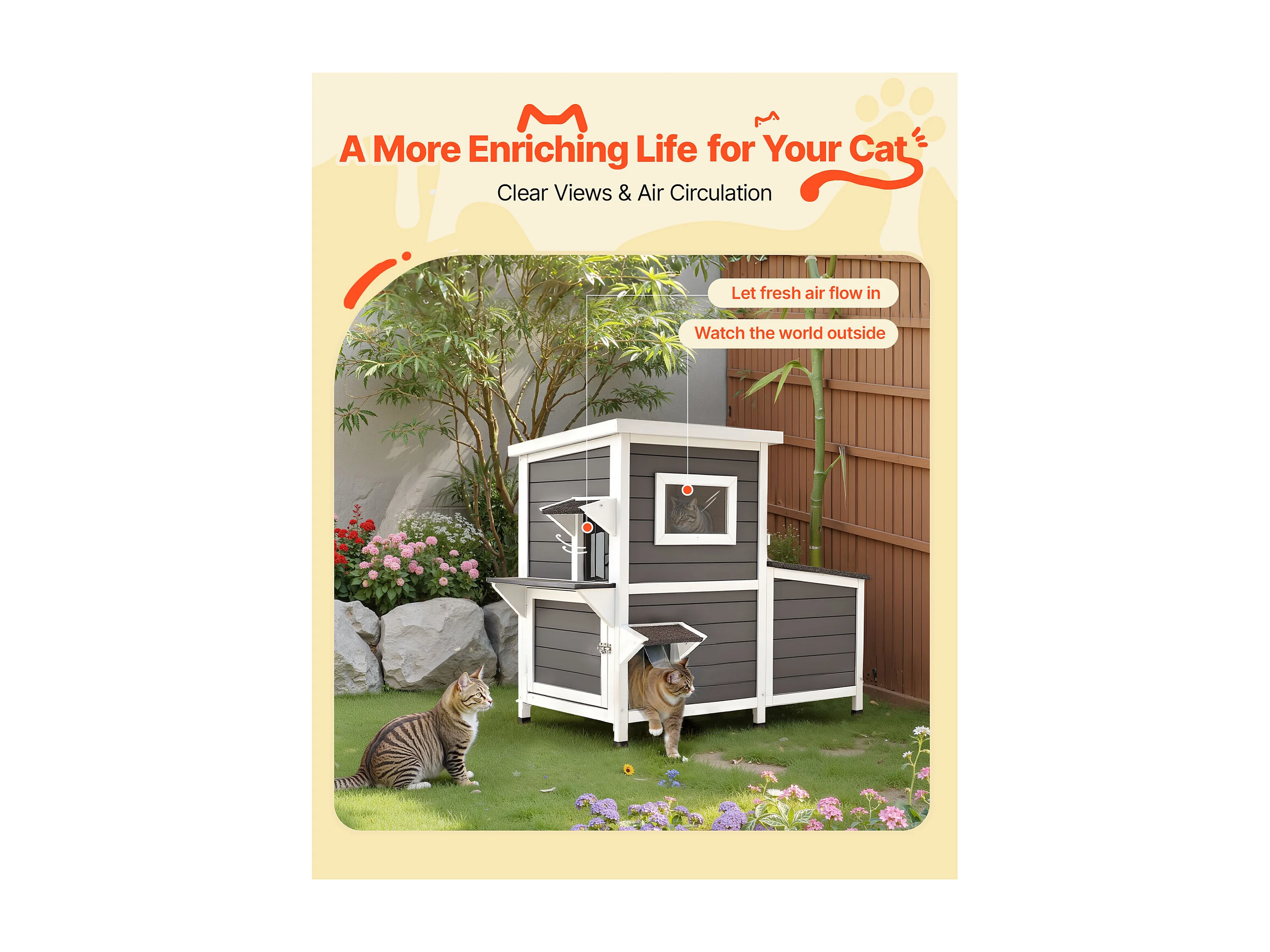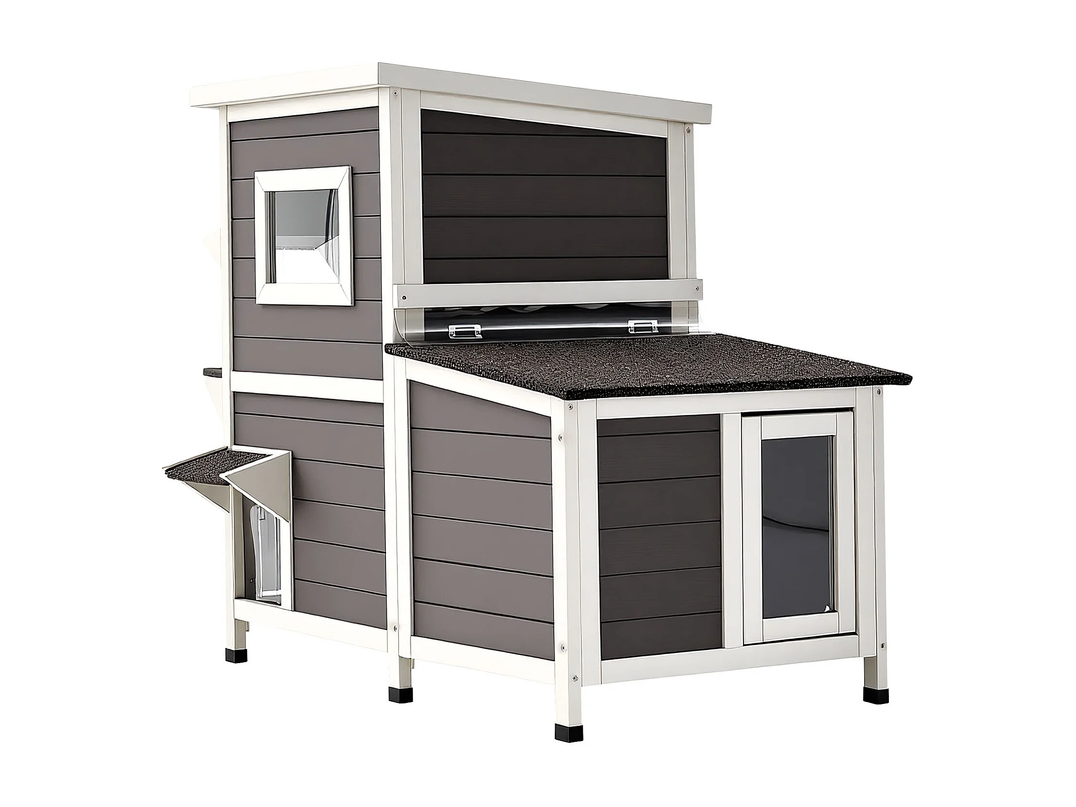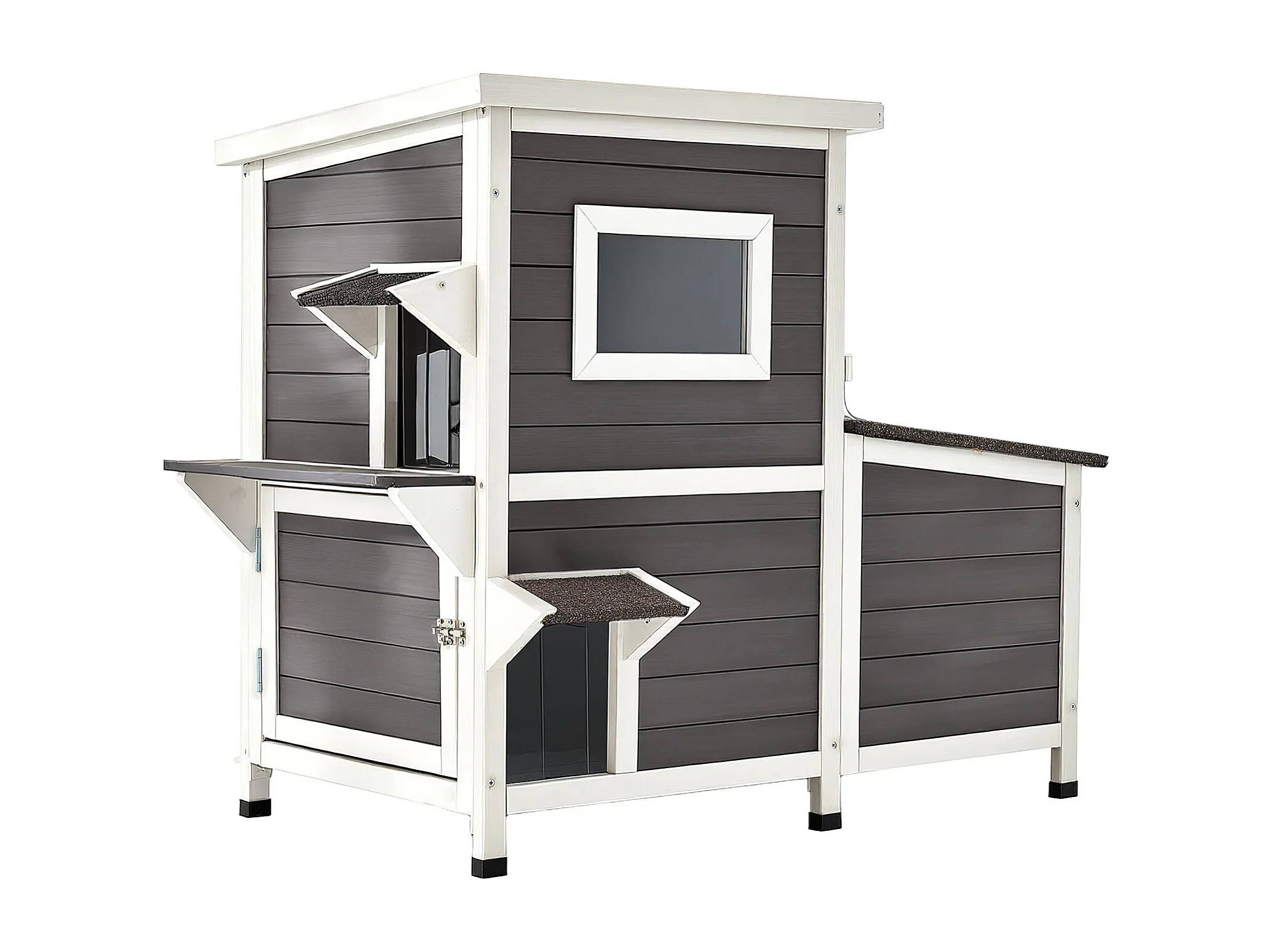 Maison Chat Surélevée SucceBuy, 107 x 63,3 x 86,3 cm, Niche Chat Extérieur 2 Étages, Abri en Bois avec Fenêtre Transparente, Porte à Rabat, Toit en Asphalte