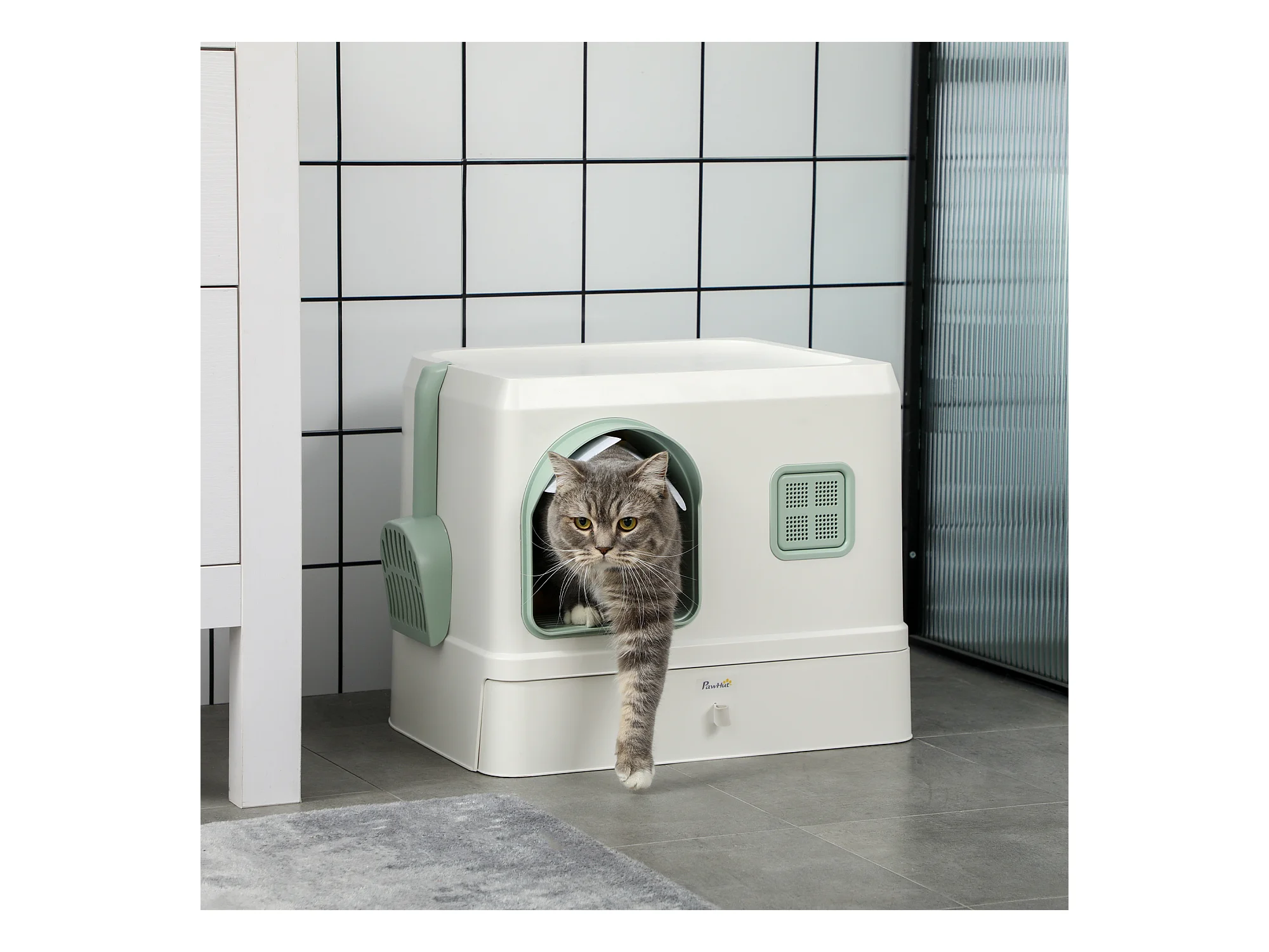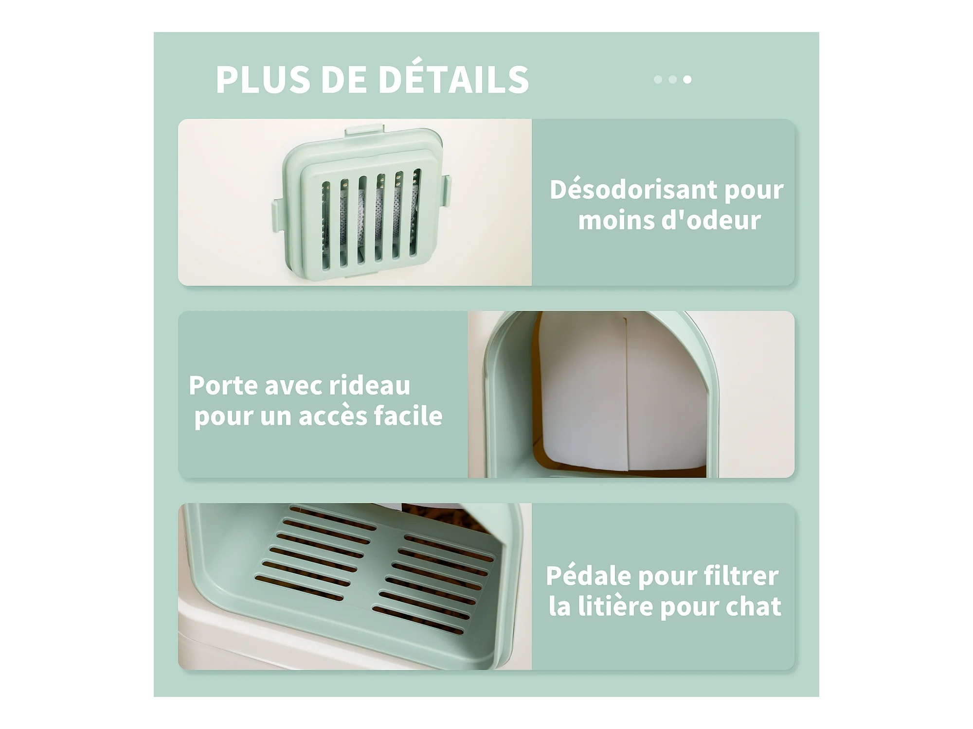 Maison de toilette chat design maisonnette - pelle, 2 désodorisants, plateau coulissant intégrés - blanc vert