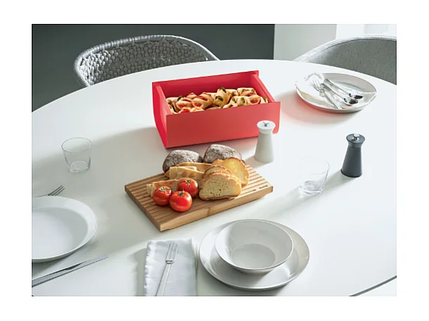 Mattina, Boîte à pain en métal rouge et planche à découper en bambou, Alessi
