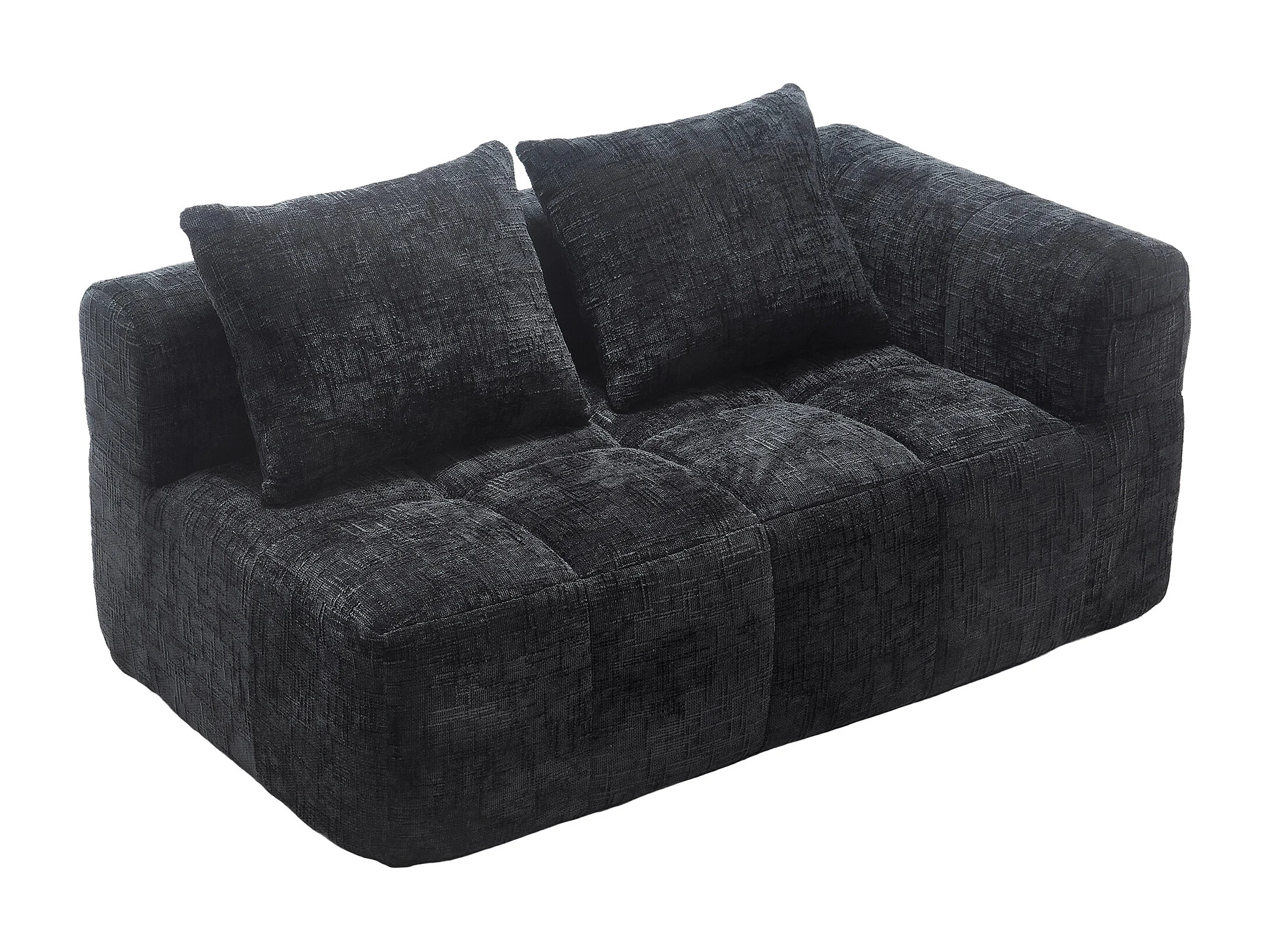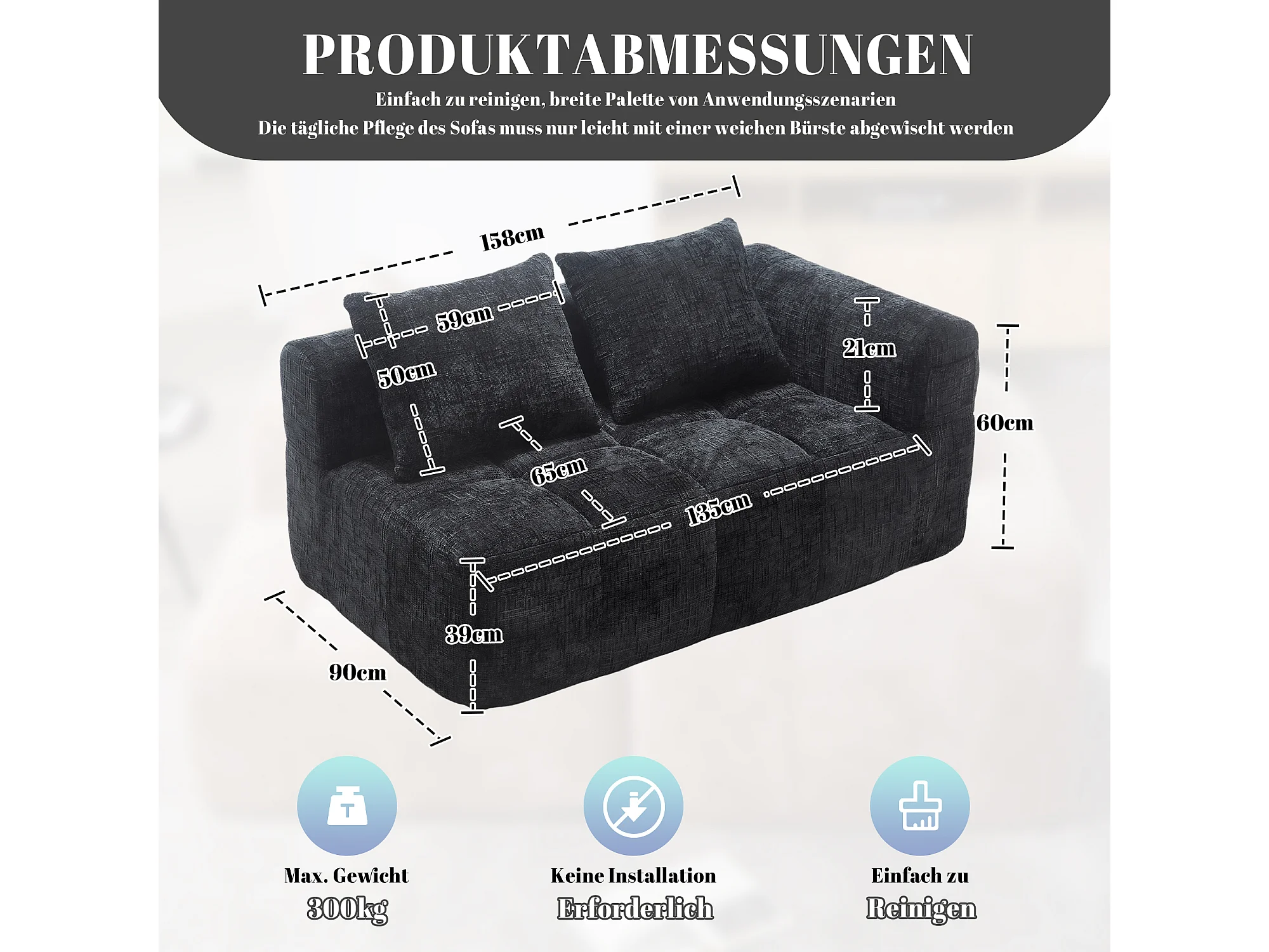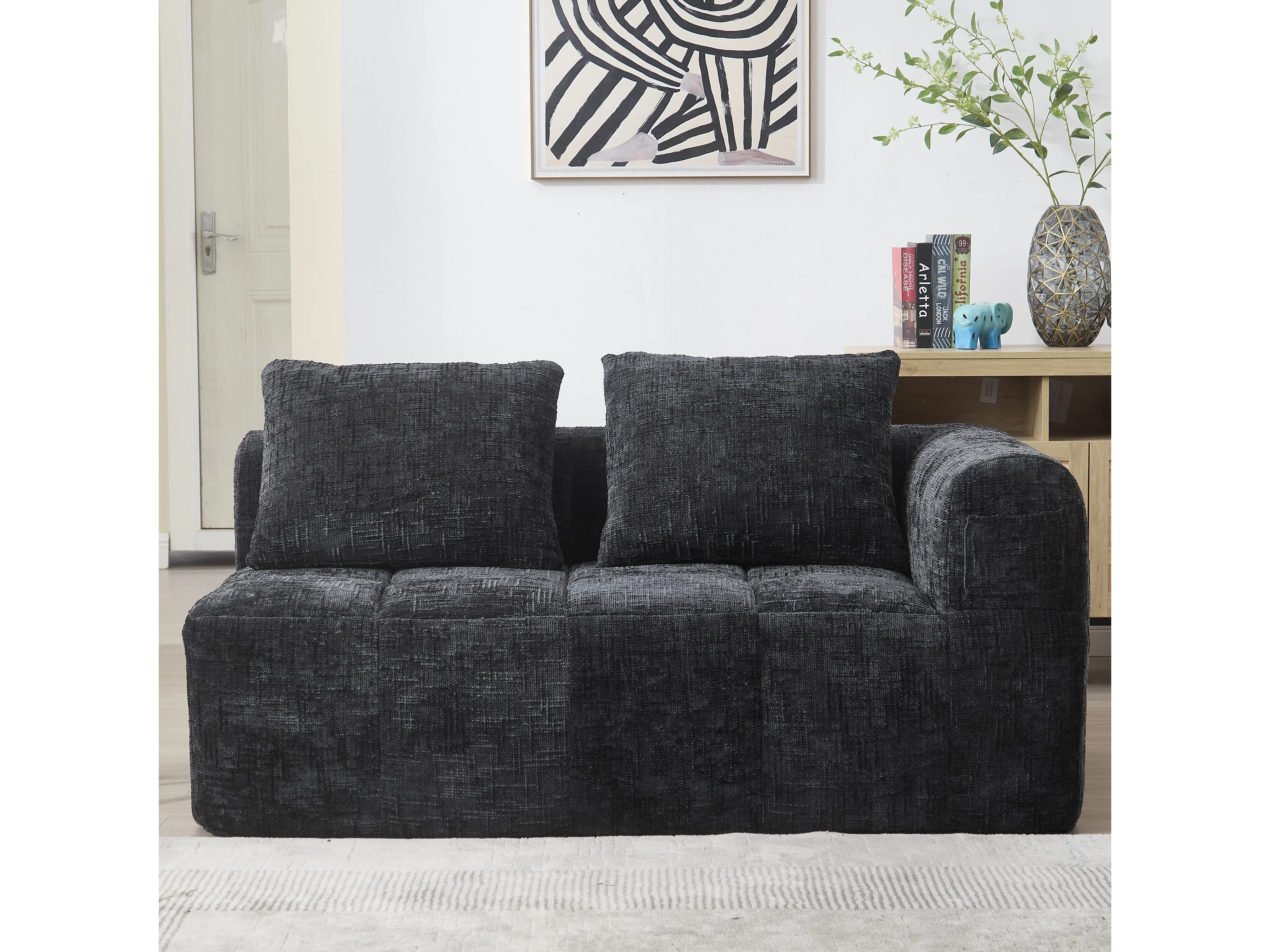 Méridienne gauche 2 places en chenille noir avec 2 coussins, Rembourrage Moelleux - 158x90x60cm