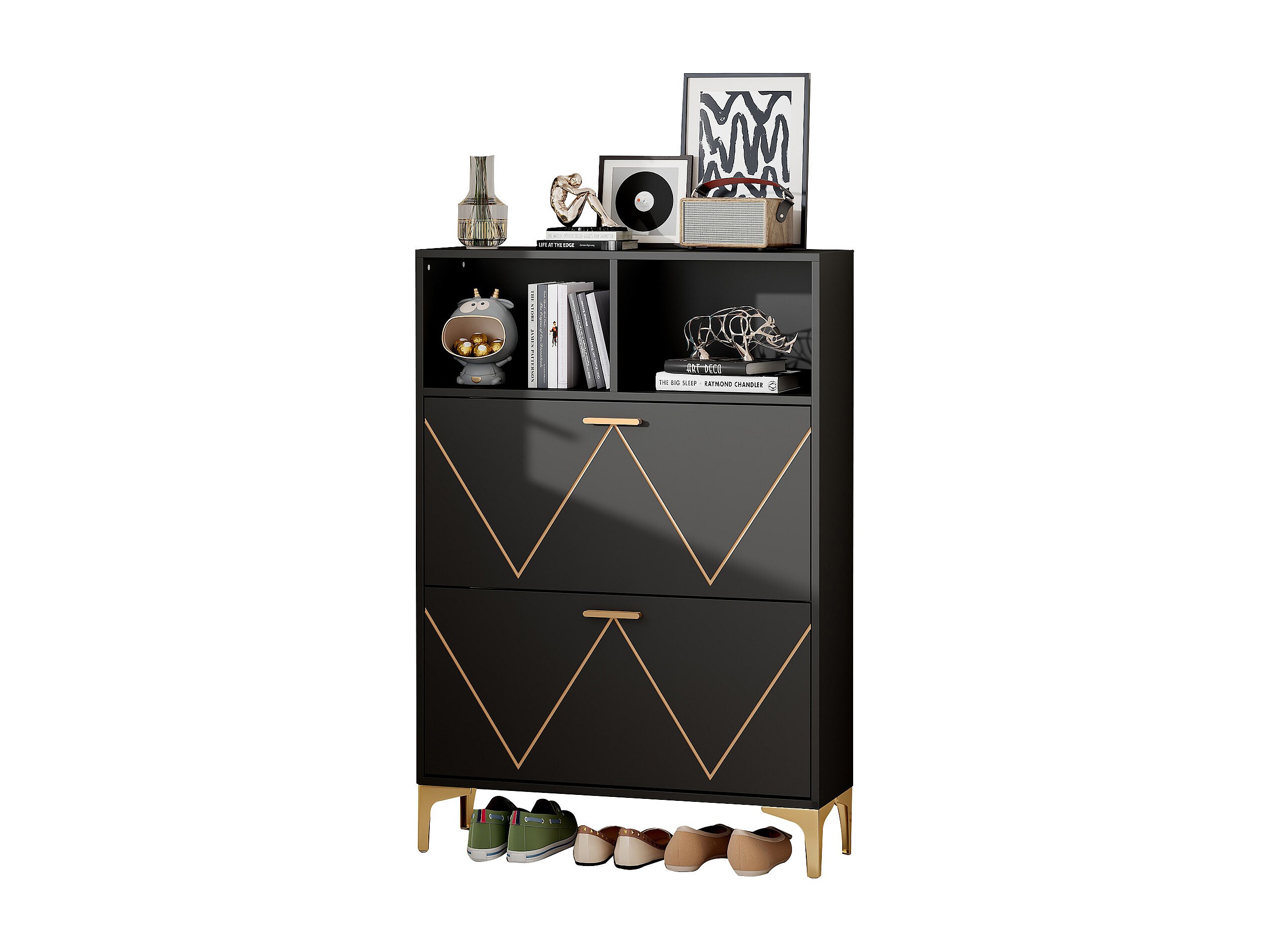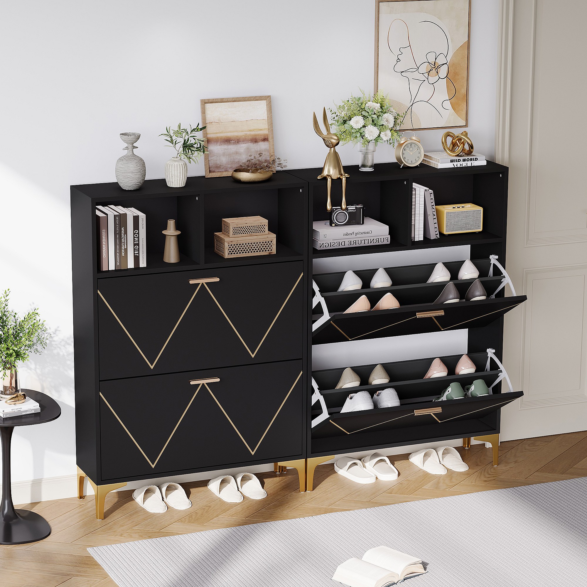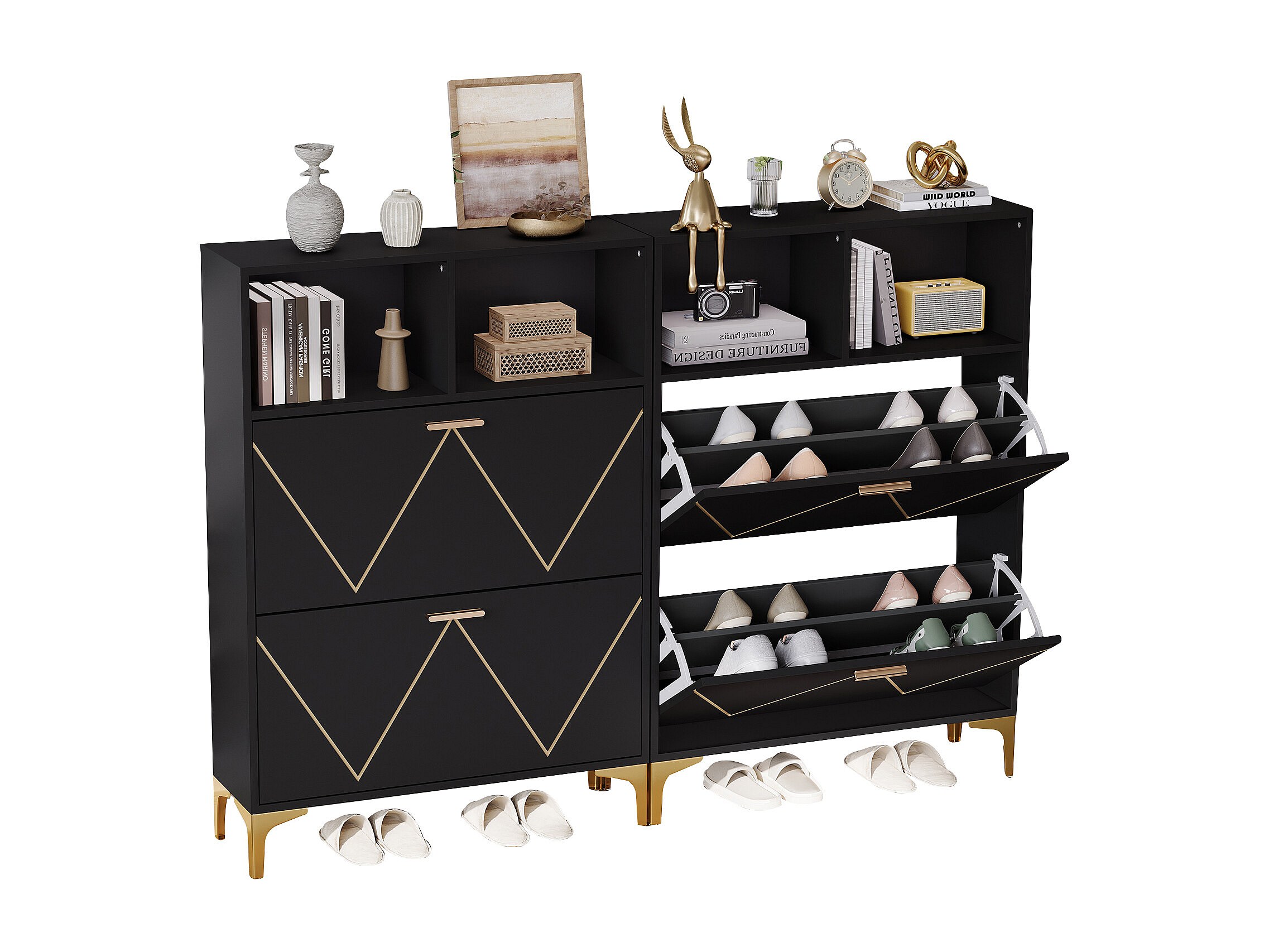 Meuble à chaussures 80x25x117cm - avec 4 portes abattantes - avec 4 étagères semi-ouvertes - MDF + Métal - Noir