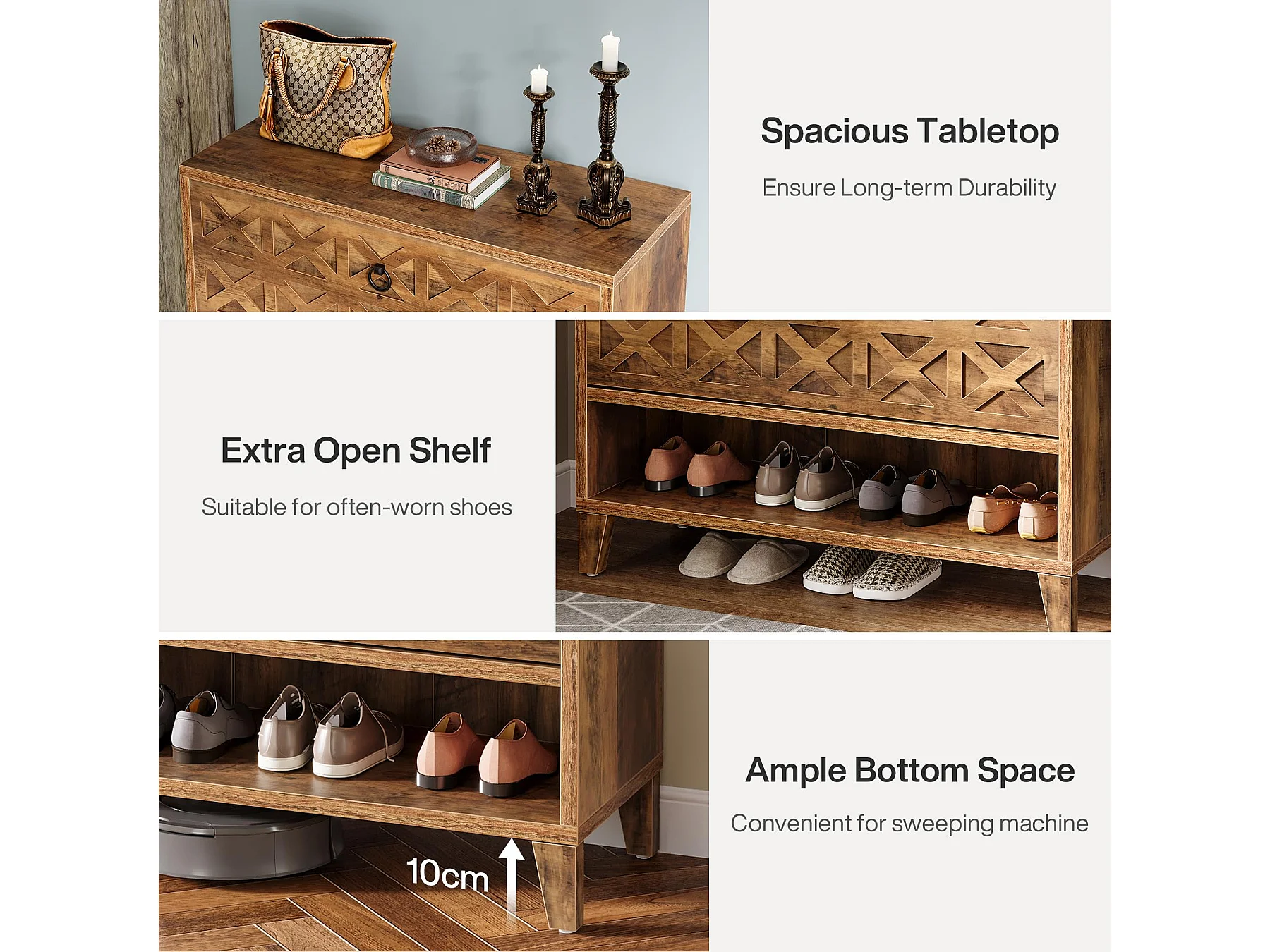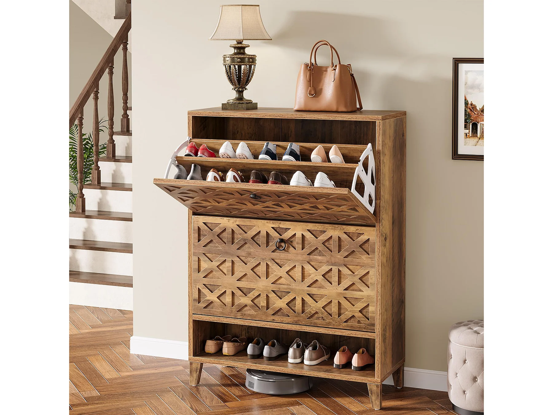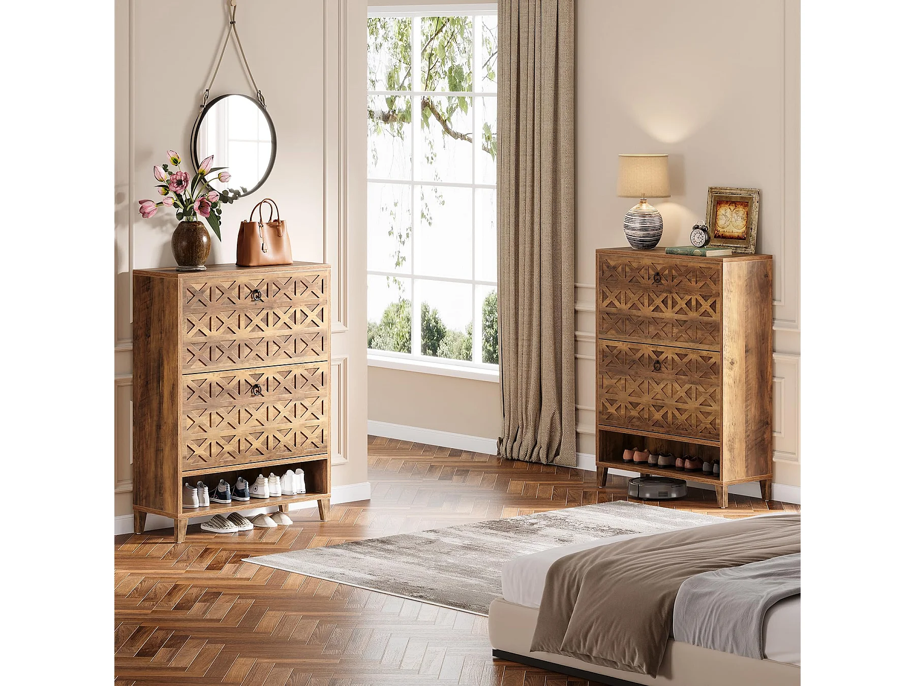 Meuble à chaussures d'entrée avec 2 tiroirs rabattables, meuble à chaussures étroit en bois avec panneau cannelé