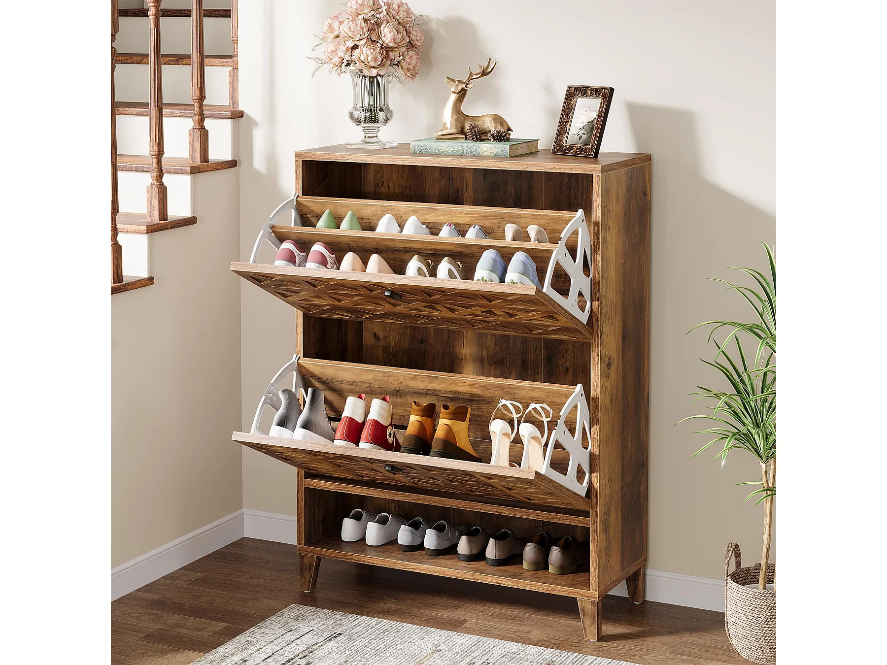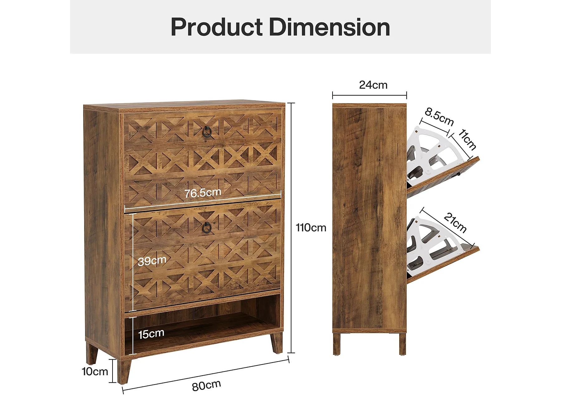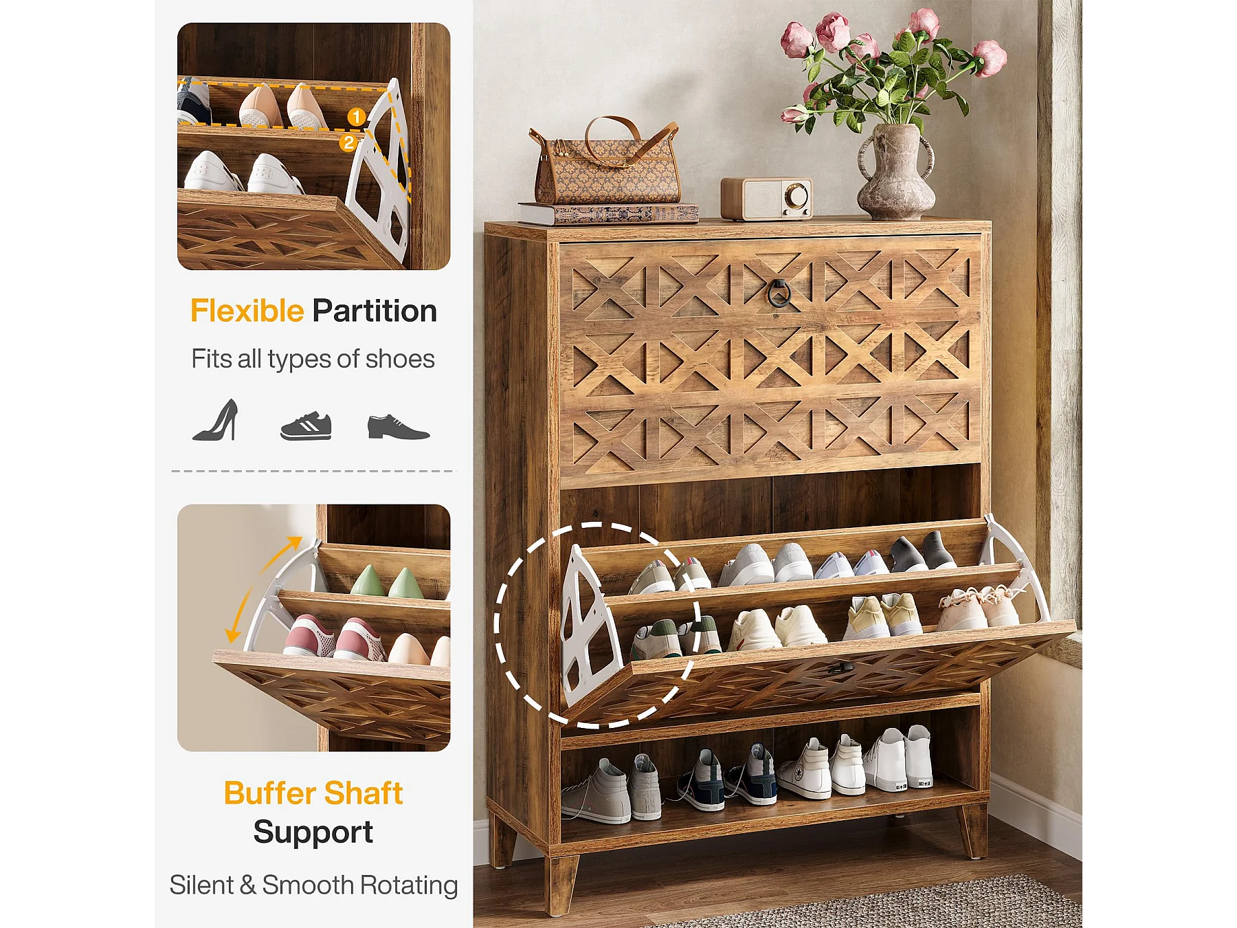 Meuble à chaussures d'entrée avec 2 tiroirs rabattables, meuble à chaussures étroit en bois avec panneau cannelé