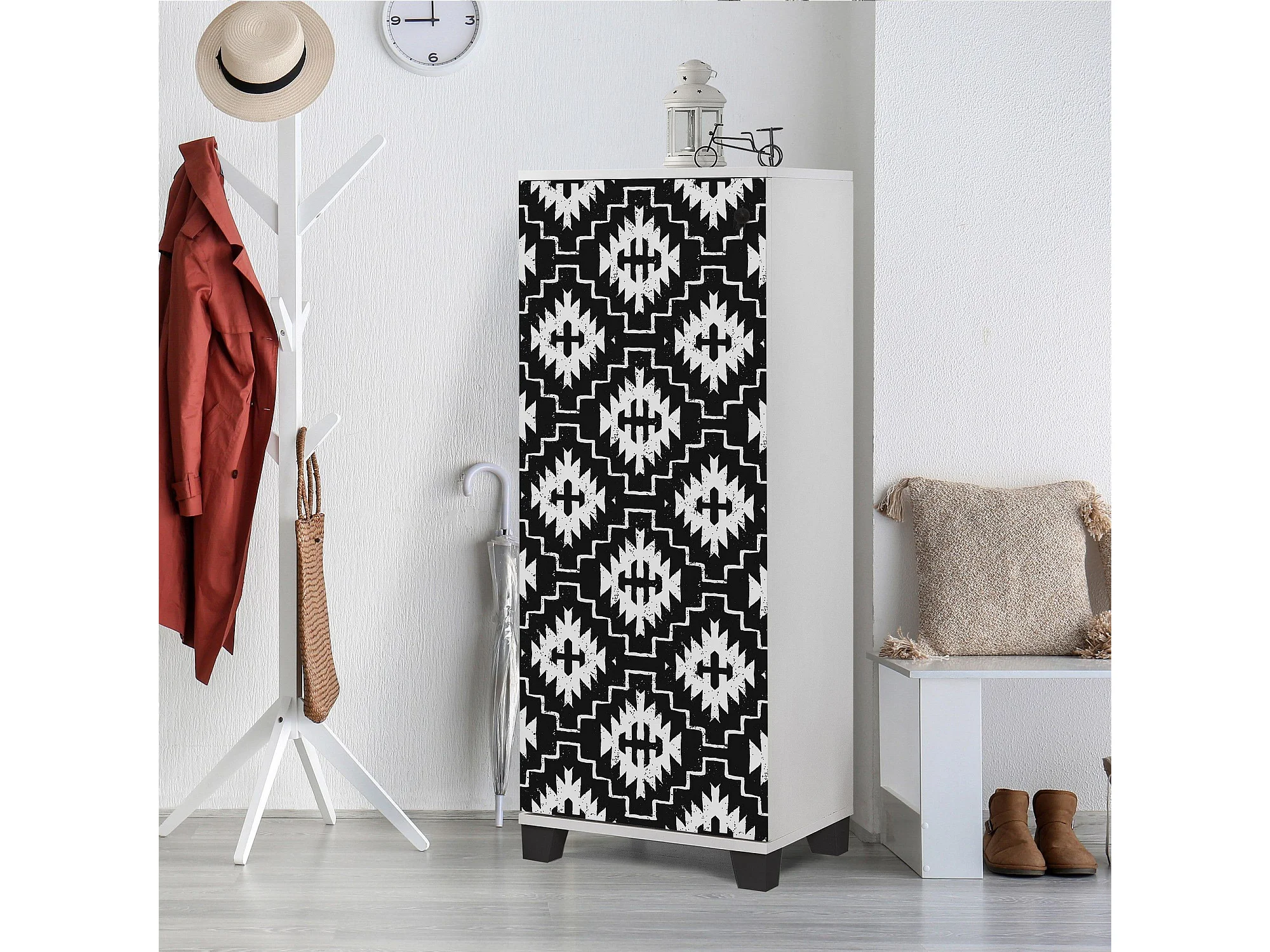 Meuble à chaussures Clades L50xH127cm Bois Motif Losanges berbères Noir et Blanc