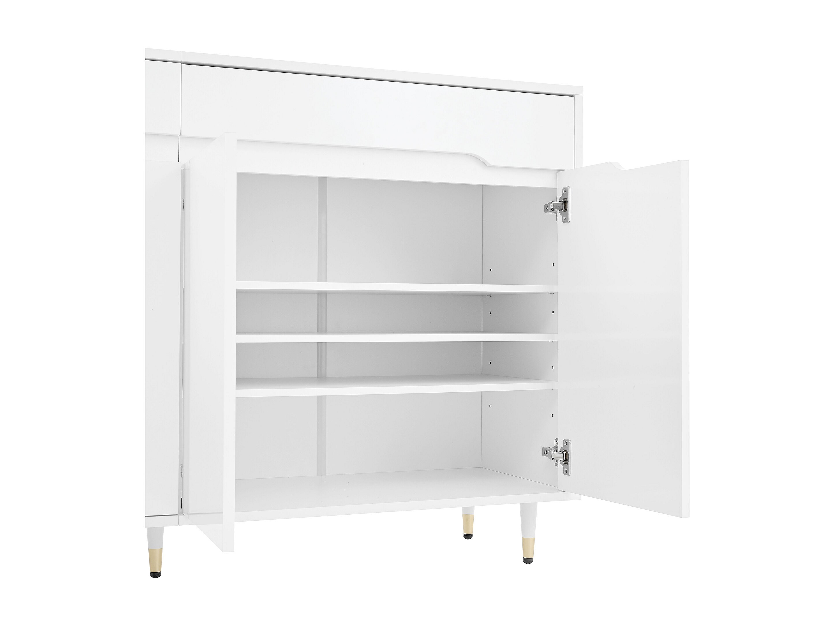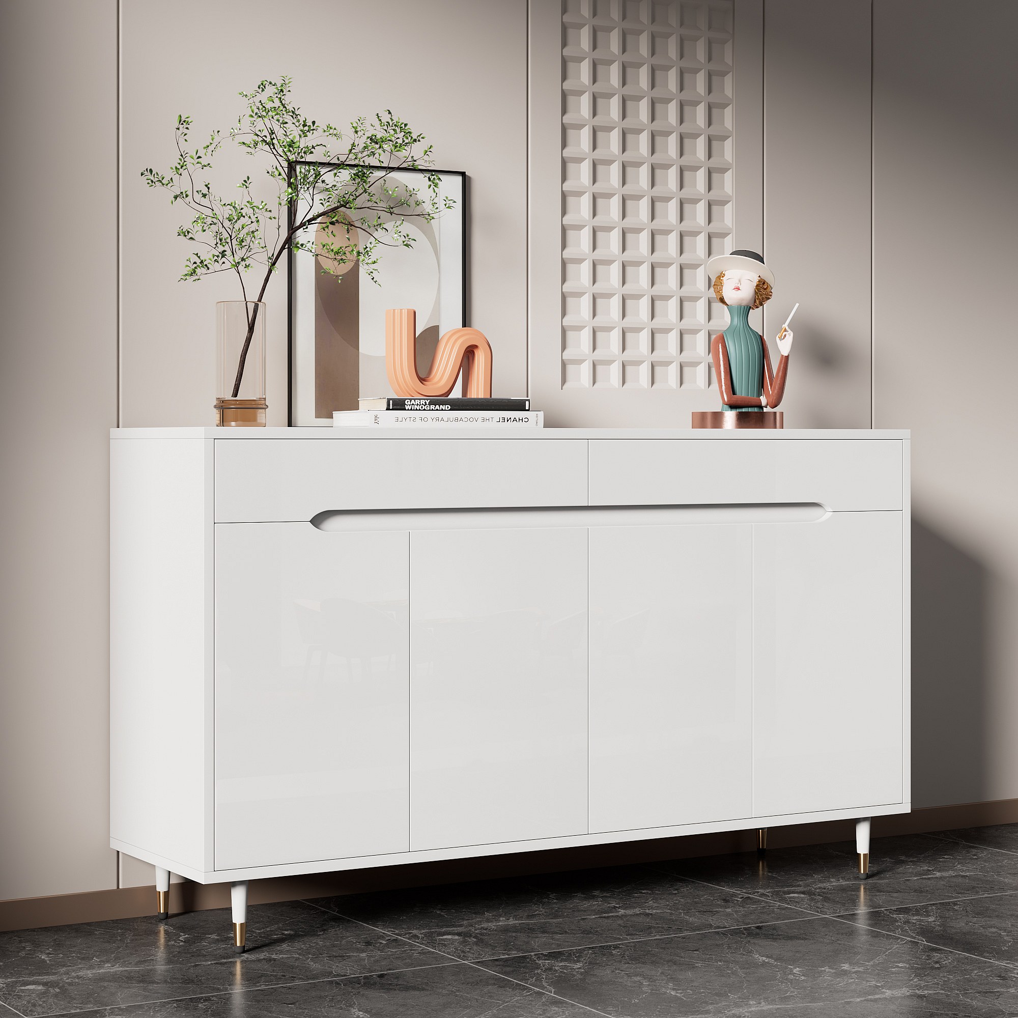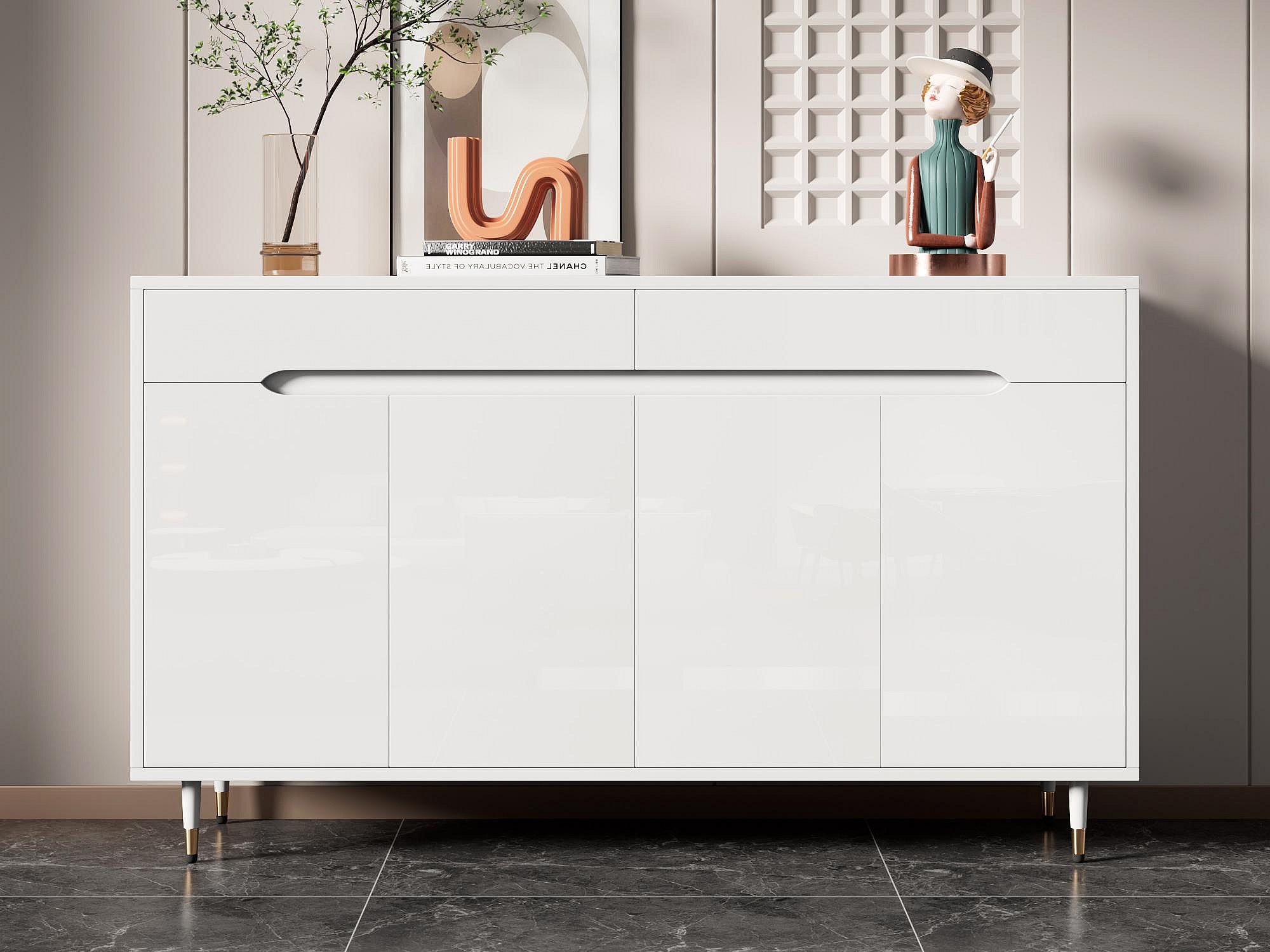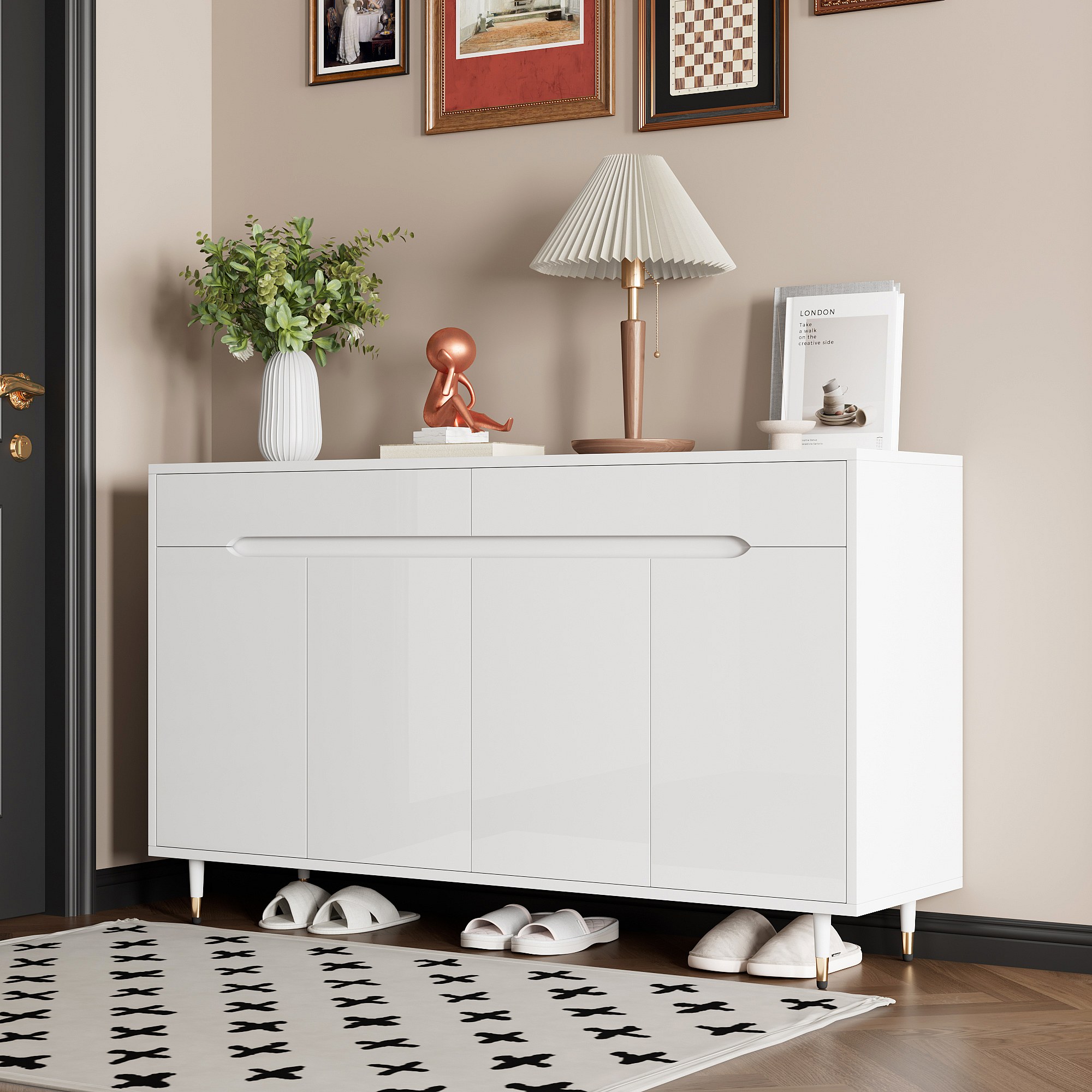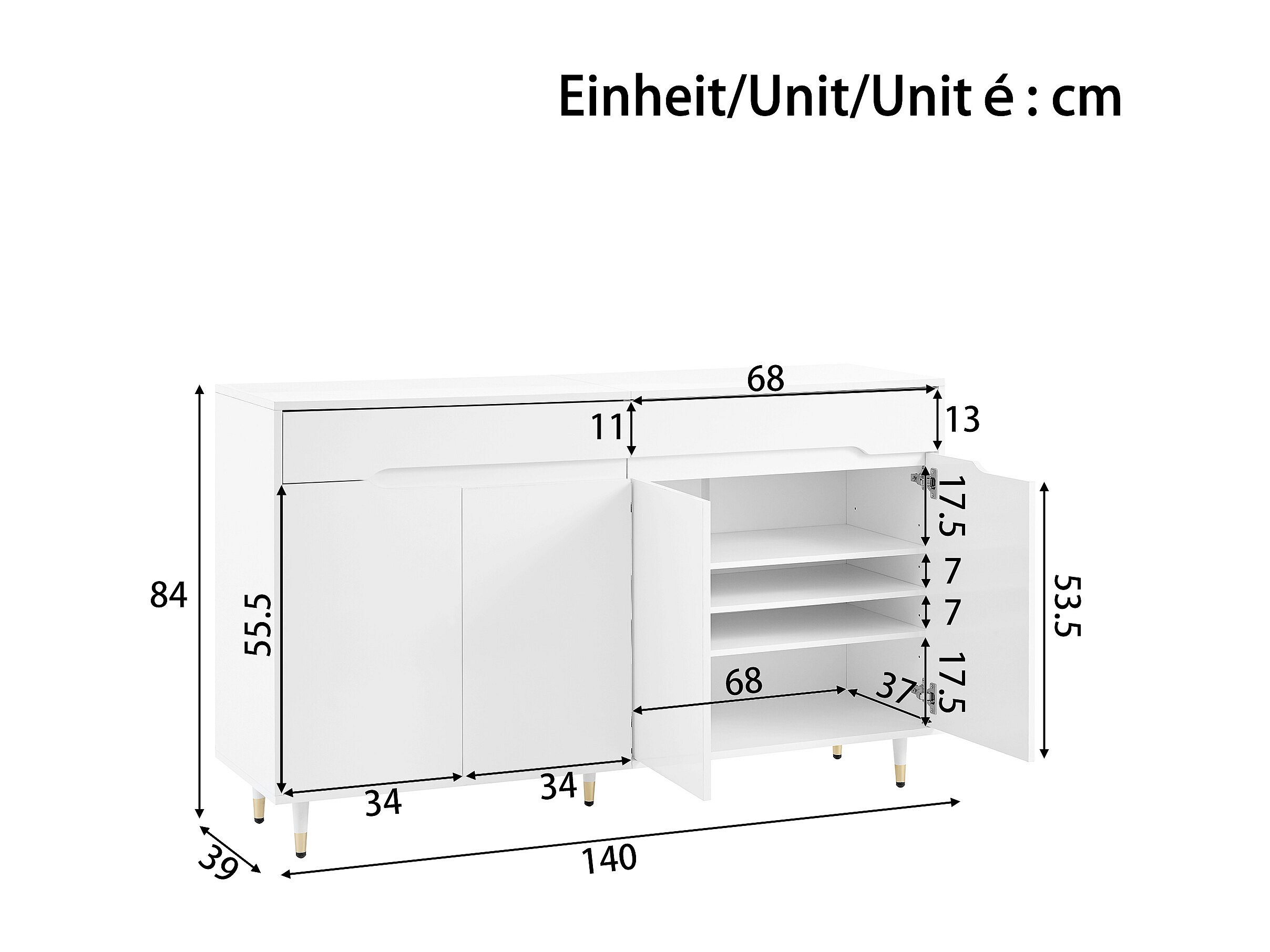 Meuble à chaussures moderne 140x39x84 cm - 2 portes et 2 tiroirs - Étagères réglables - Pieds dorés - Blanc