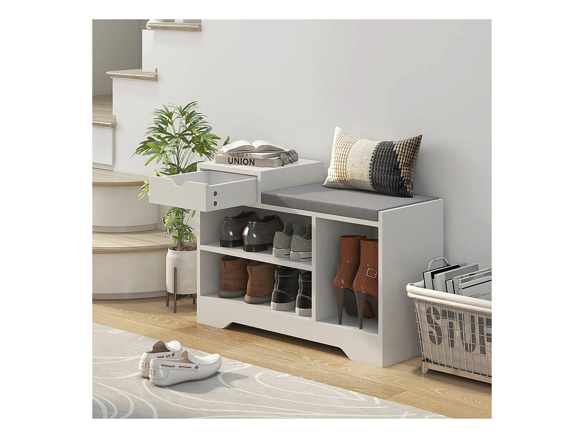 Meuble chaussures banc à chaussures tiroir 3 niches coussin gris inclus panneaux blanc