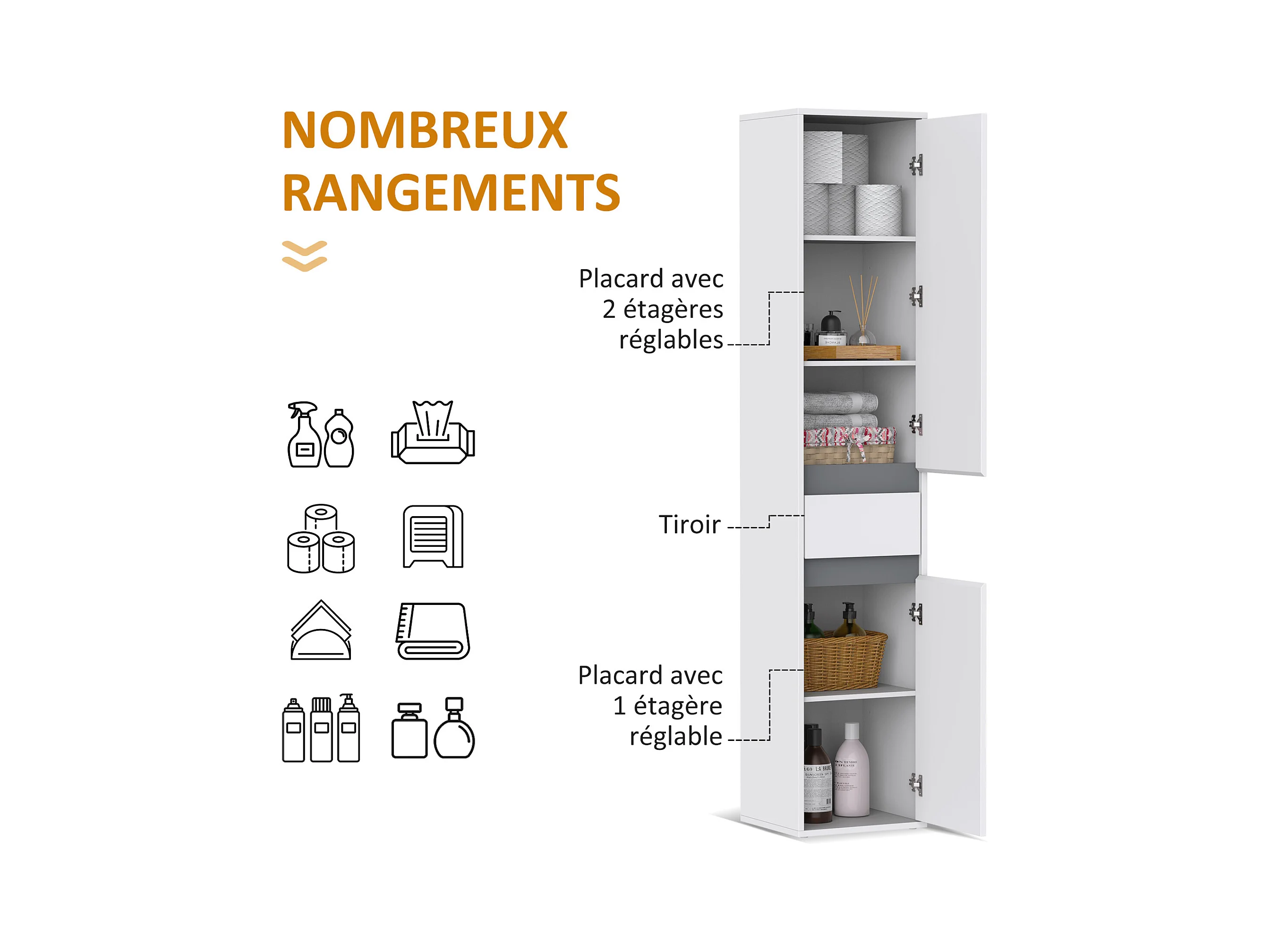 Meuble colonne rangement salle de bain style contemporain 2 placards 3 étagères et tiroir coulissant panneaux particules blanc