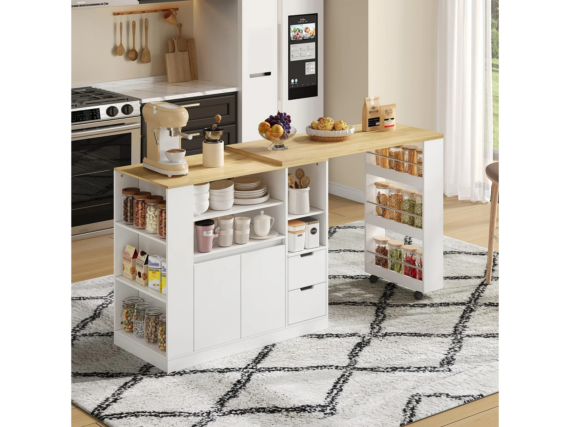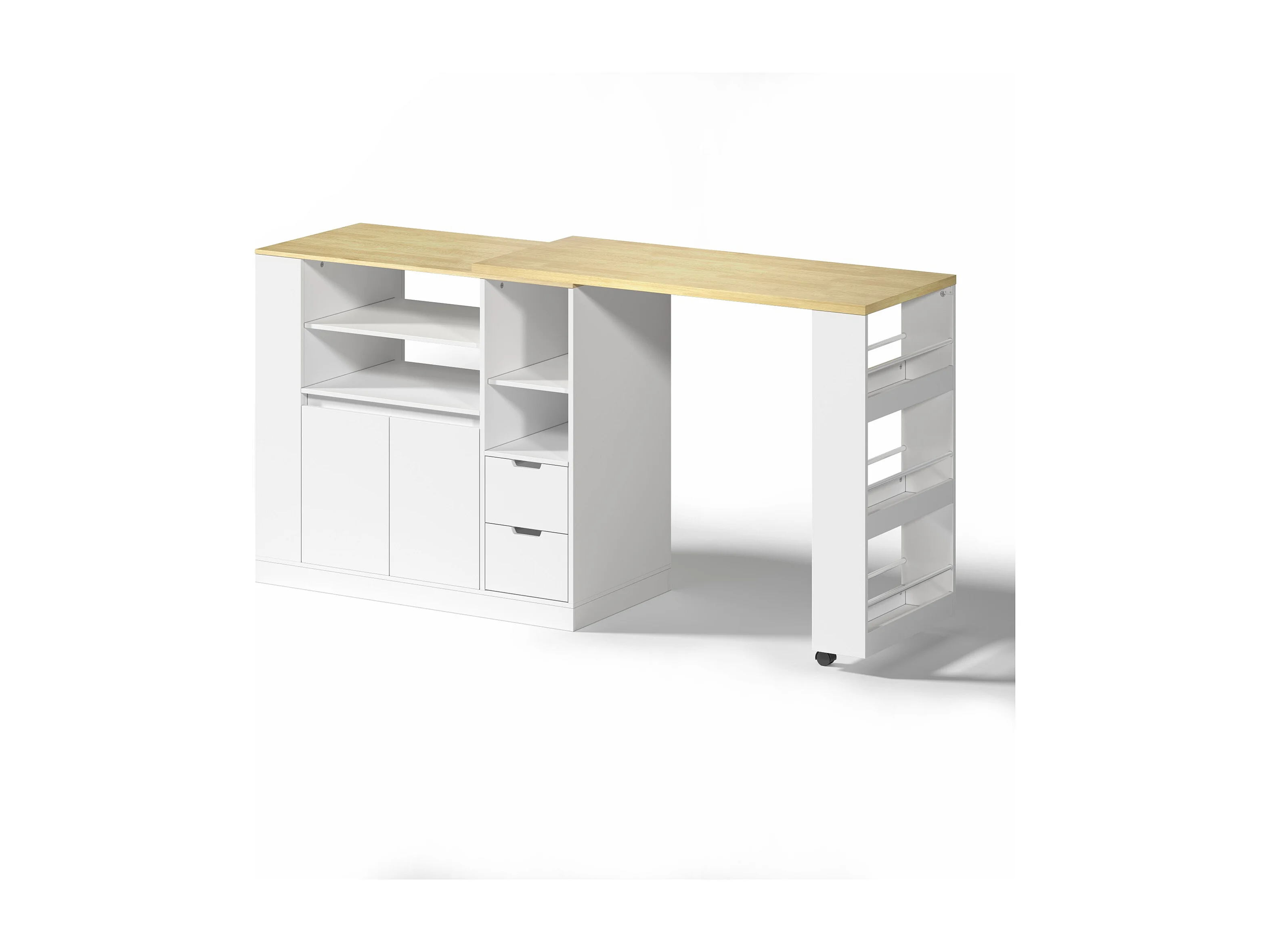 Meuble de bar de cuisine extensible et rotation - 115x50x92cm - avec 2 tiroirs et 2 portes - avec étagères latérales - Blanc