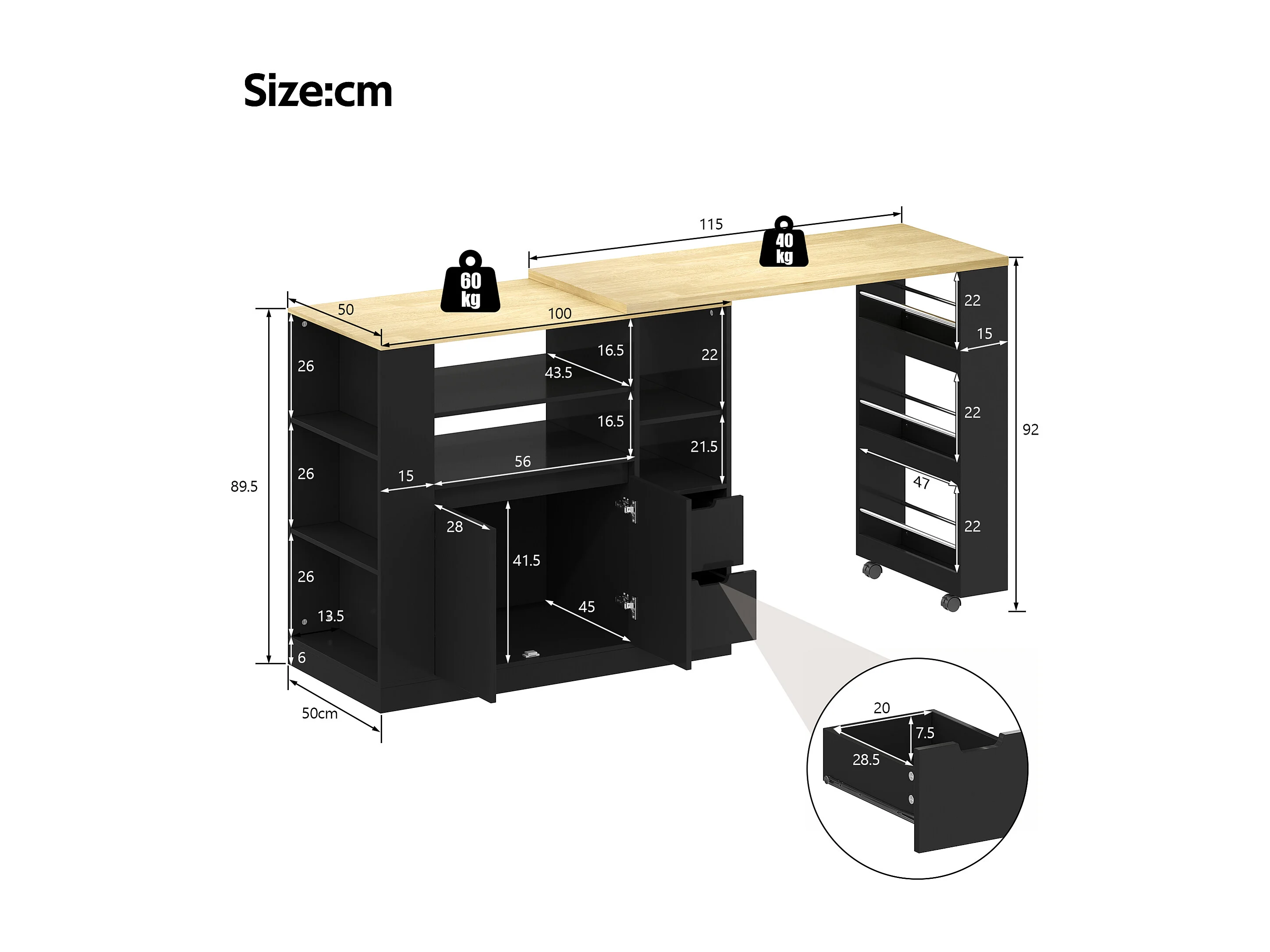 Meuble de bar de cuisine extensible et rotation - 115x50x92cm - avec 2 tiroirs et 2 portes - avec étagères latérales - Noir