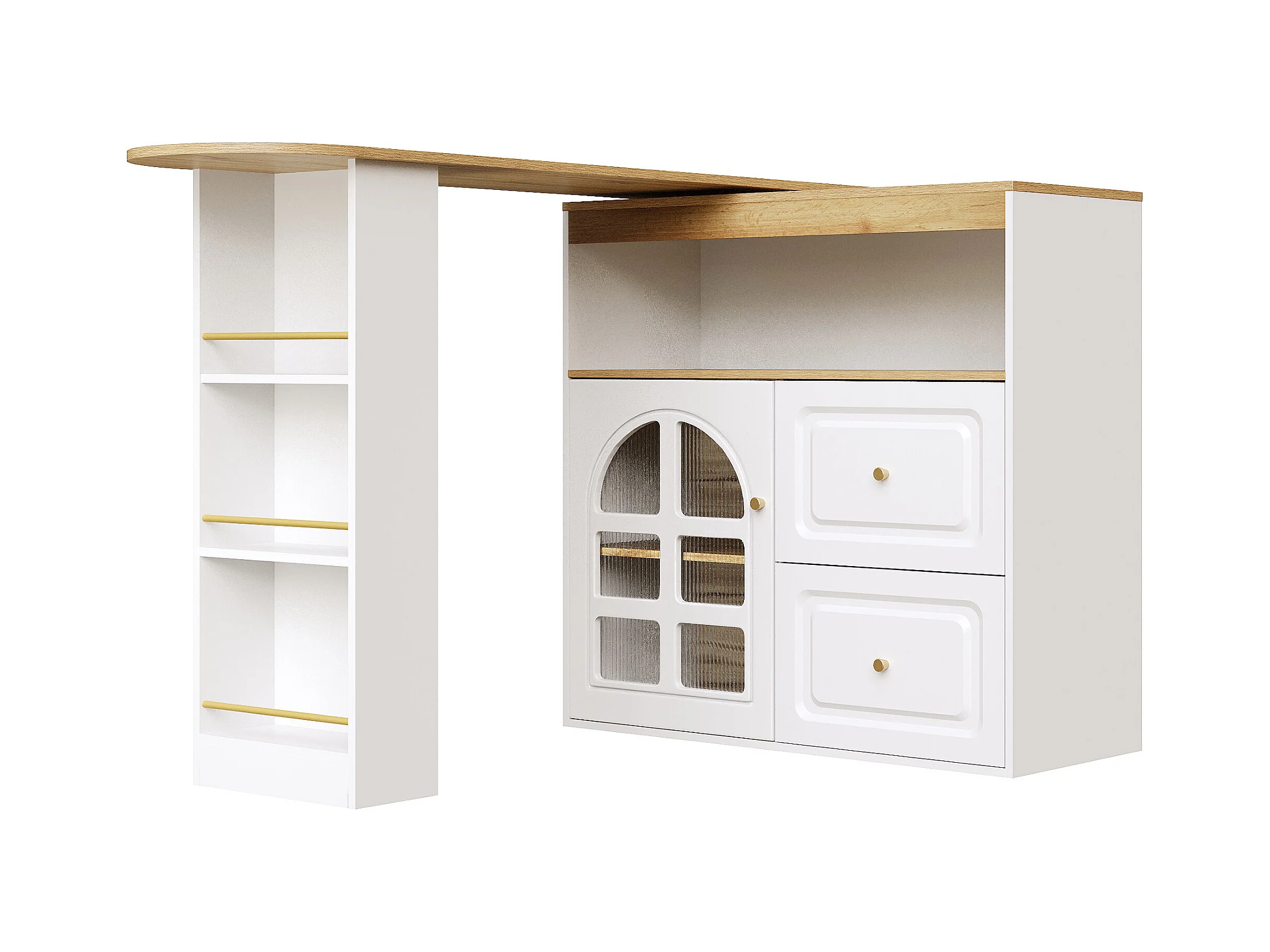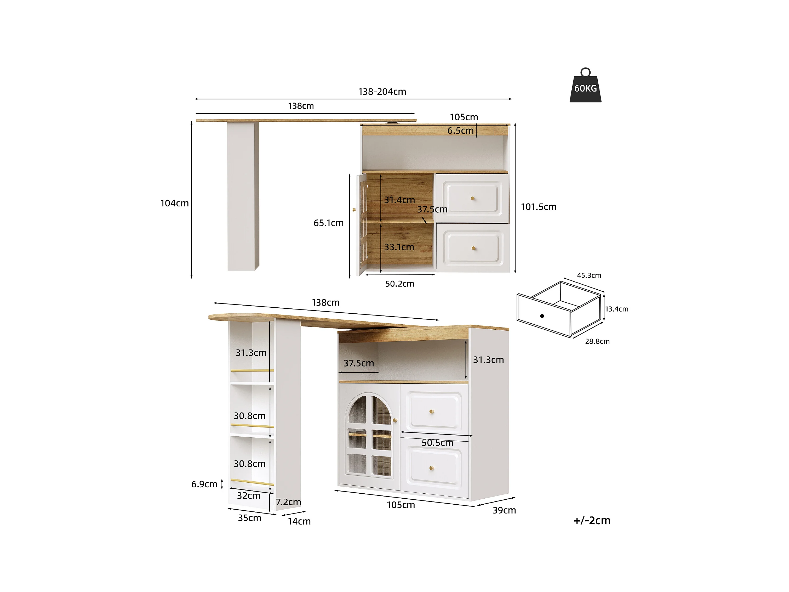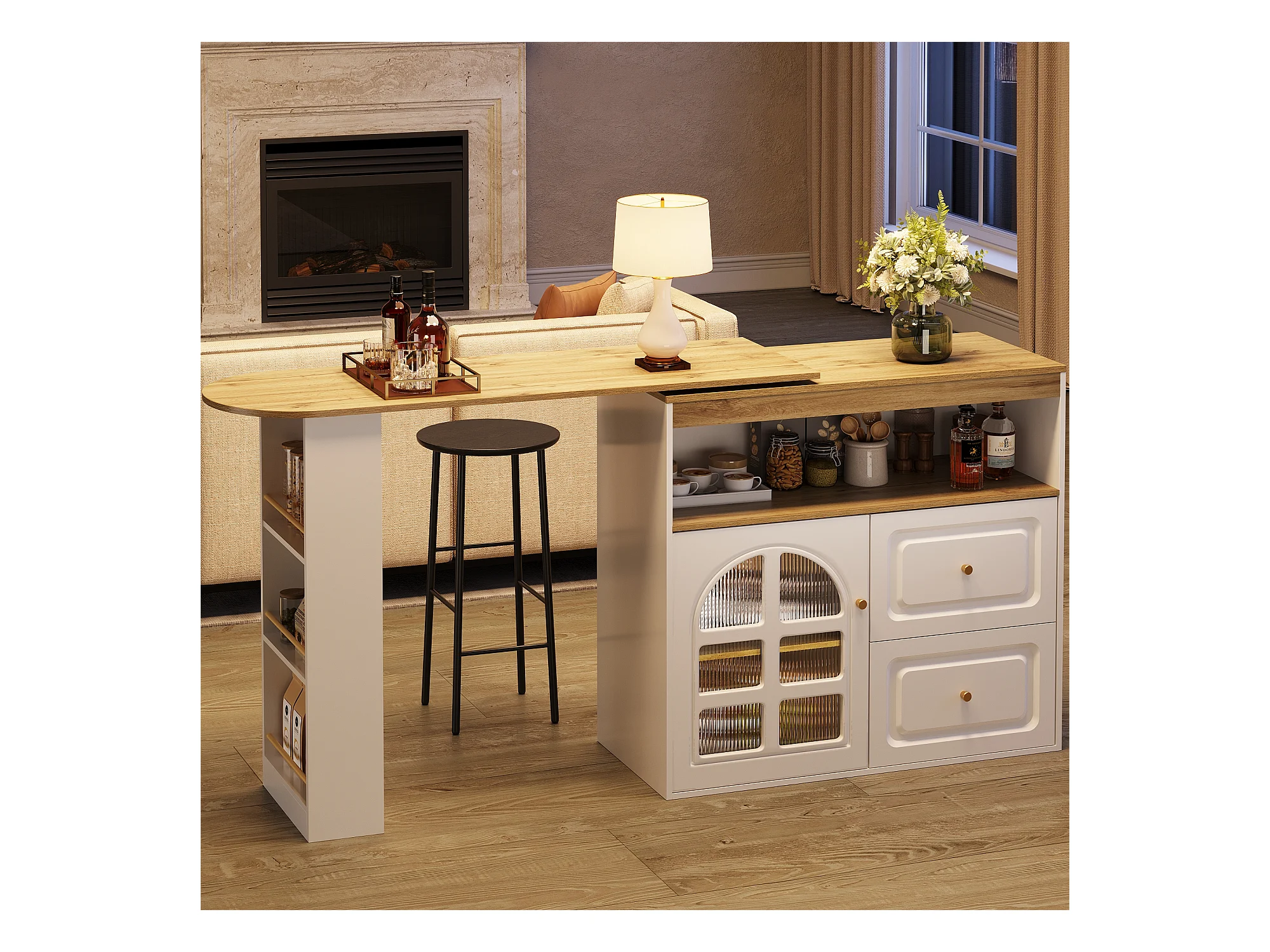 Meuble de bar de cuisine extensible - et rotation à 360° - 203x39x90cm - 6 tiroirs - avec étagères latérales - Blanc