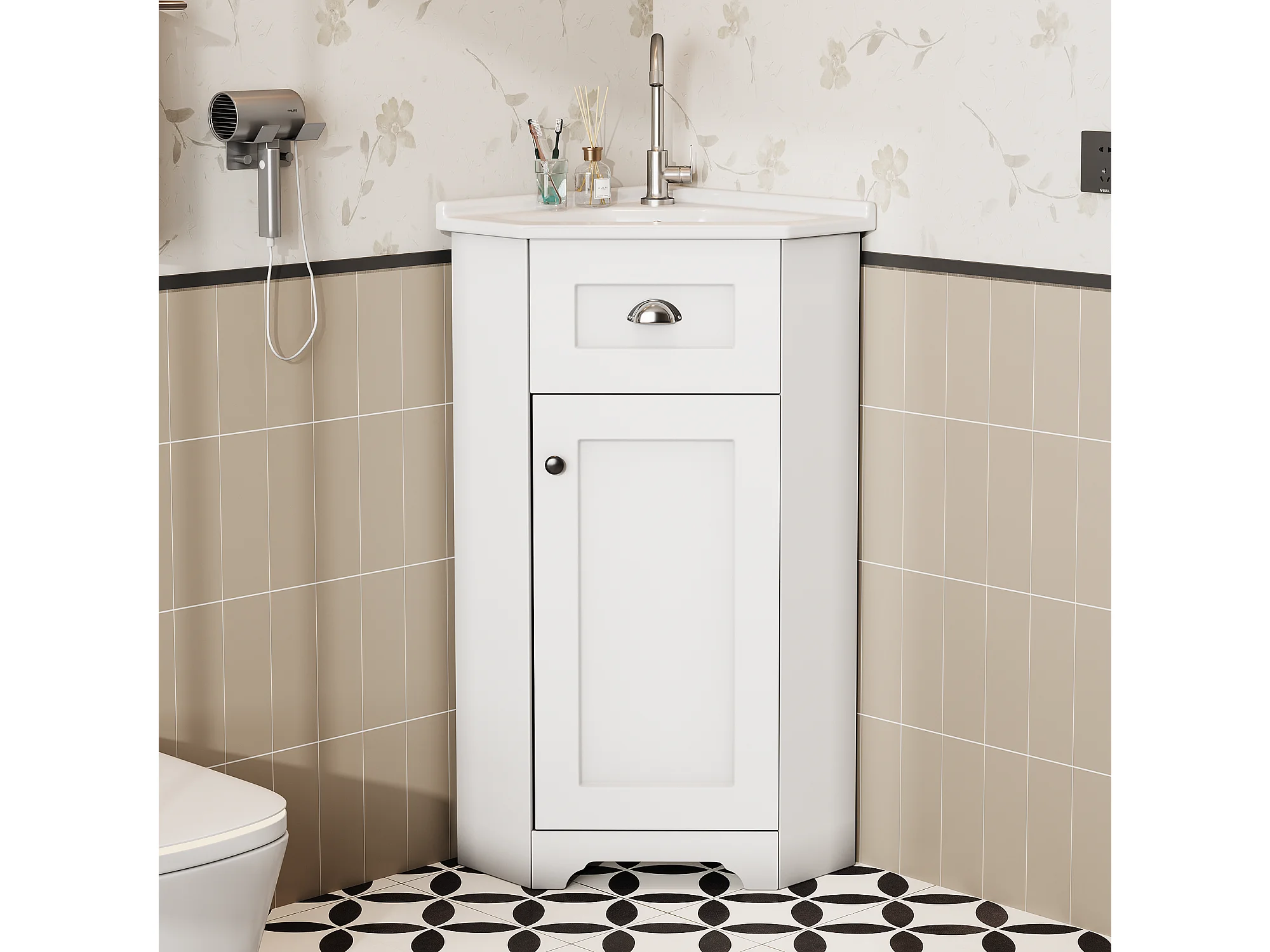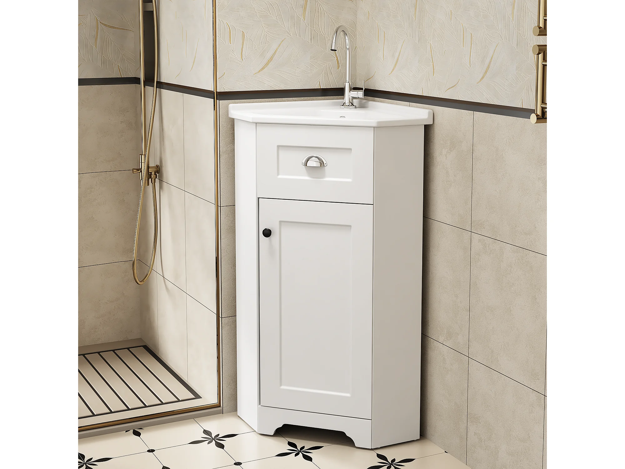 Meuble de salle de bain sur pied - avec une vasque en céramique - 1 porte et 1 tiroir - Blanc(robinet non inclus)