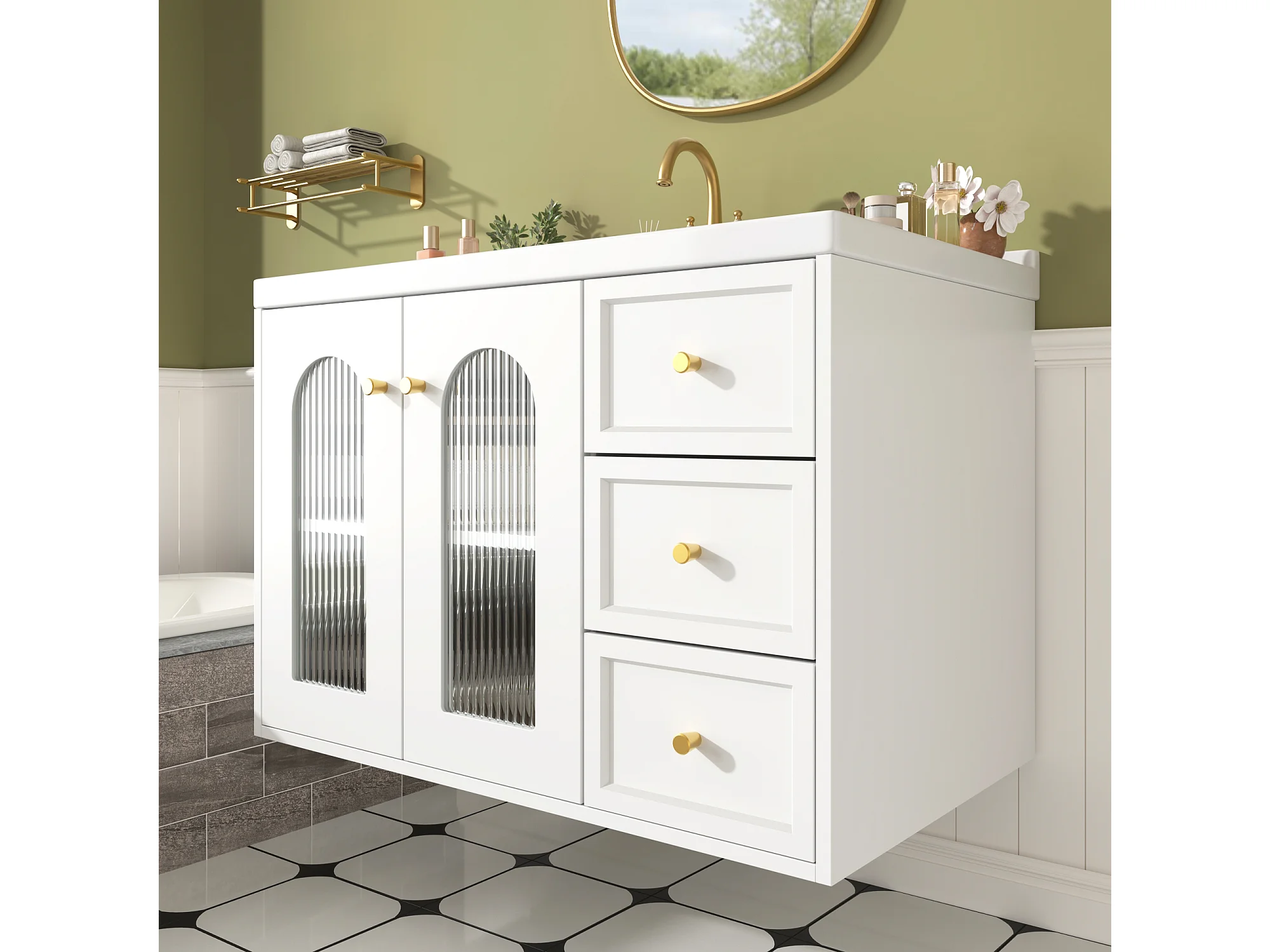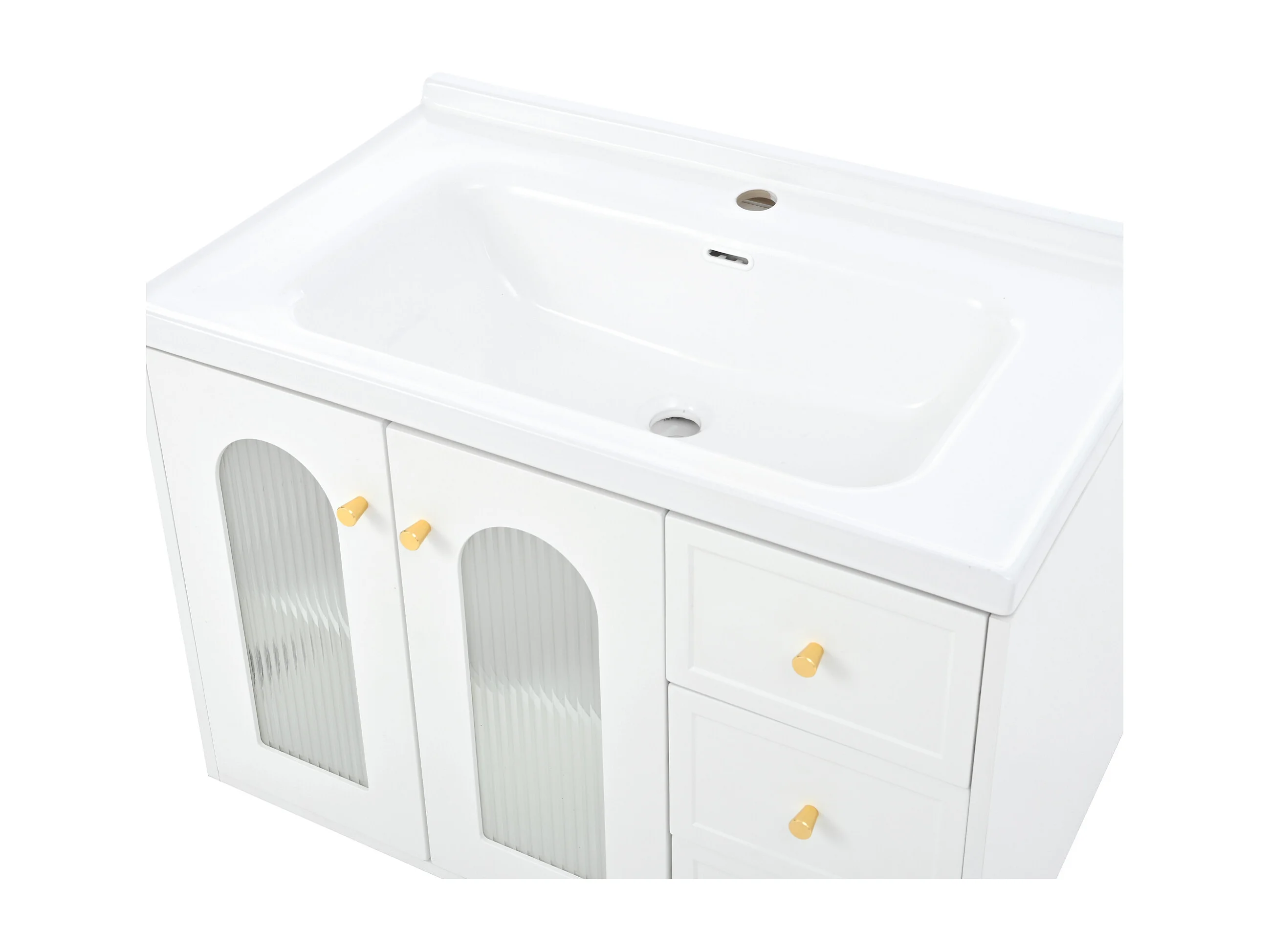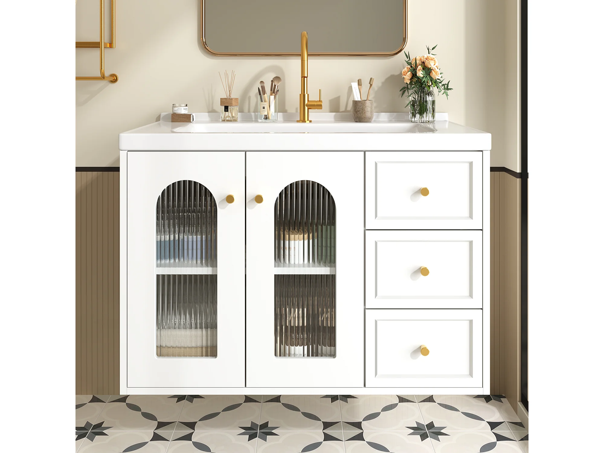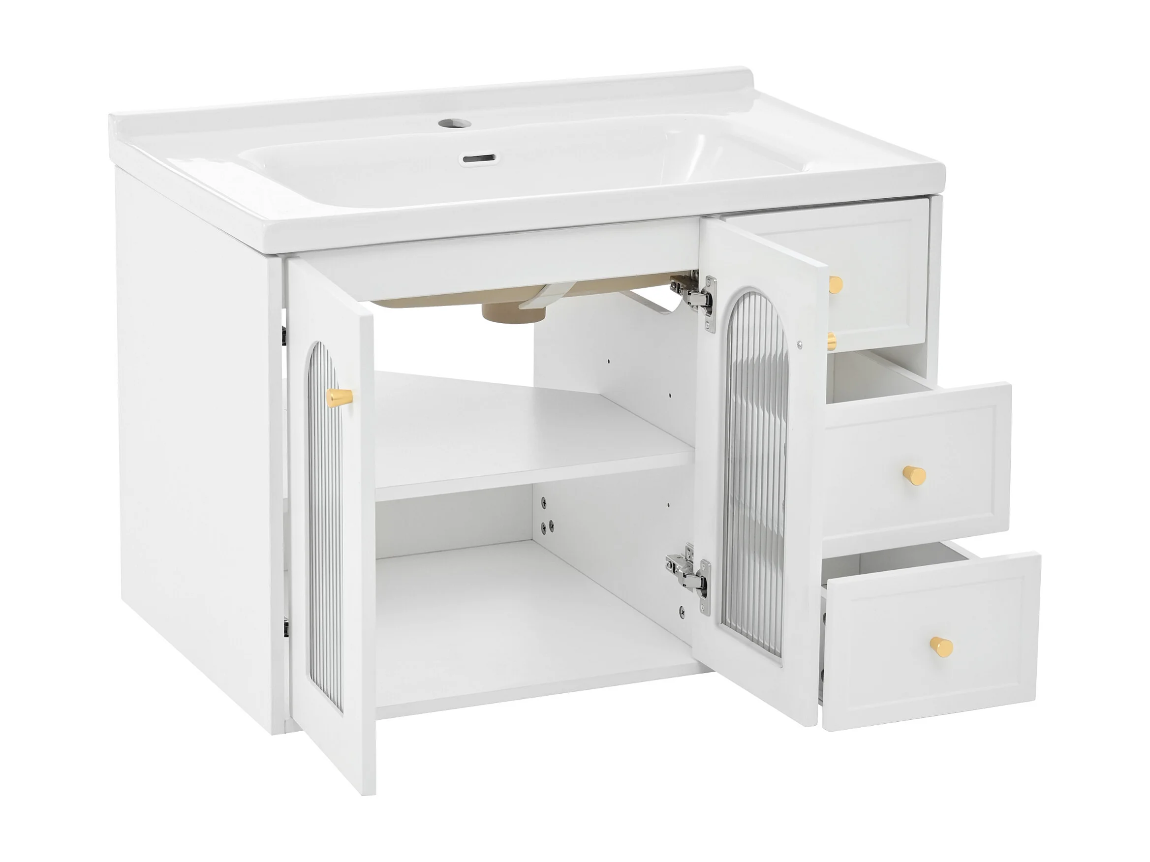 Meuble de salle de bain suspendu - avec une vasque en céramique - avec 2 tiroirs et 2 portes vitrées - blanc (robinet non inclus)