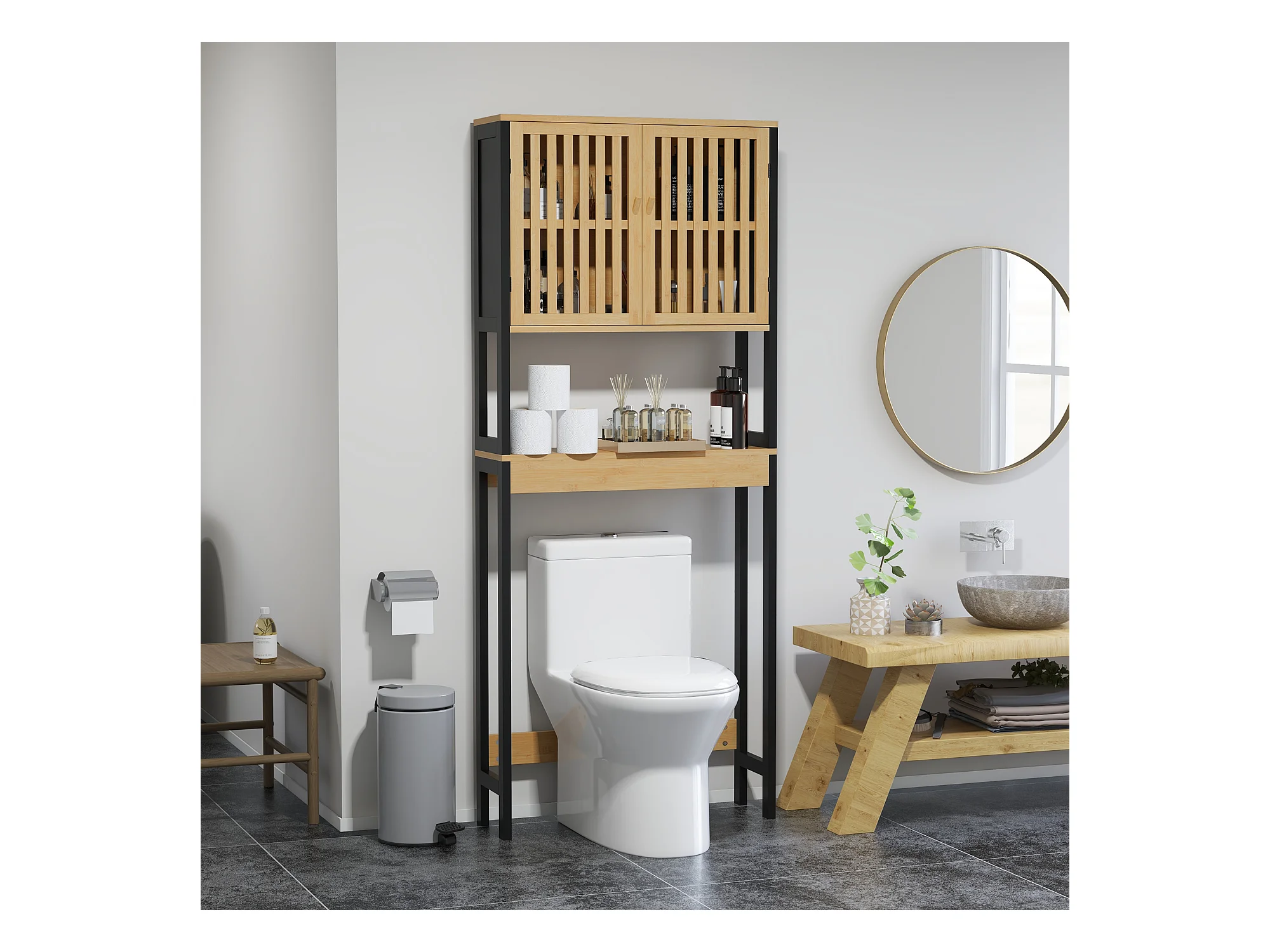 Meuble étagère dessus WC - 2 portes, 2 étagères - MDF noir bois bambou verni