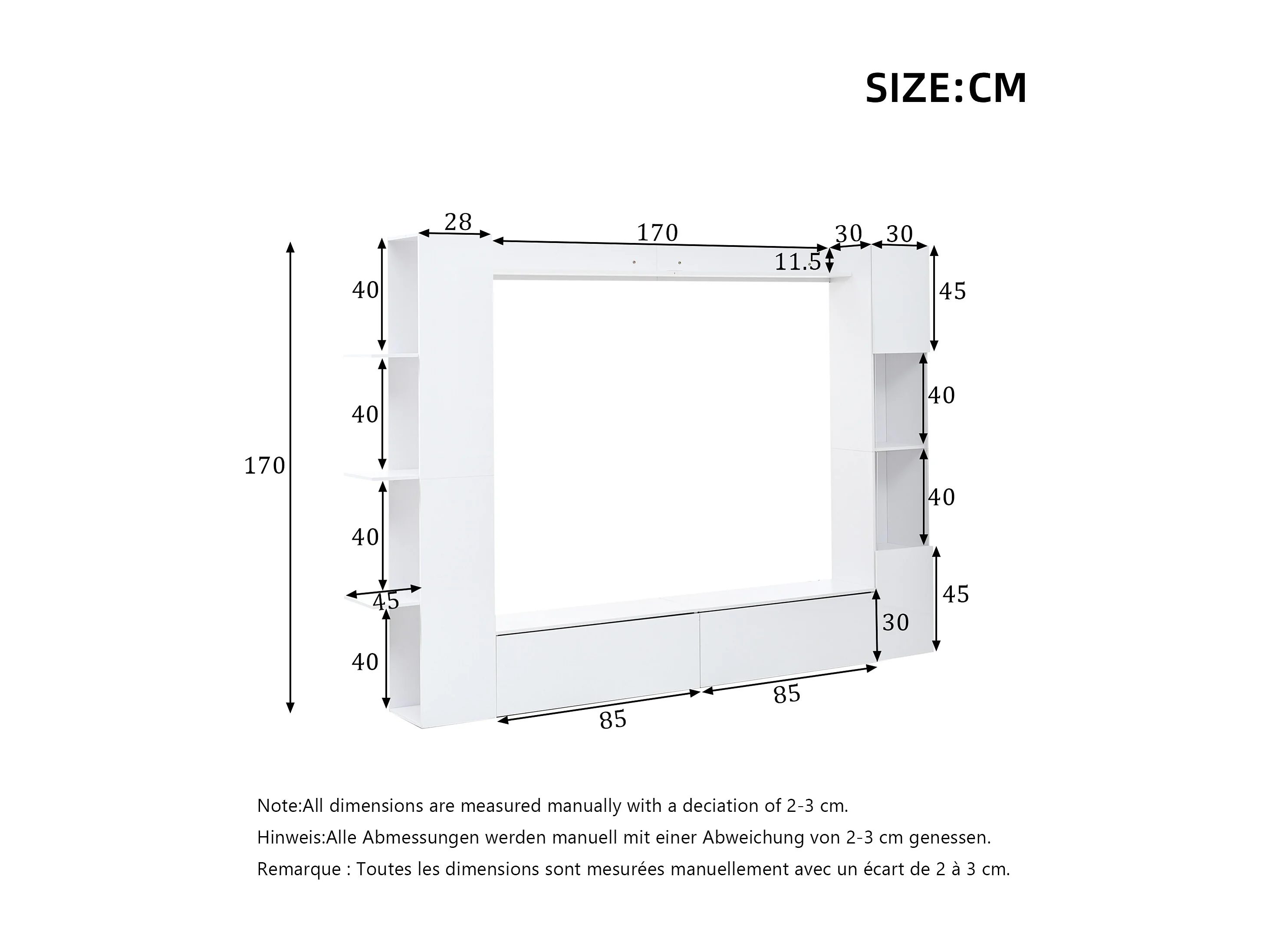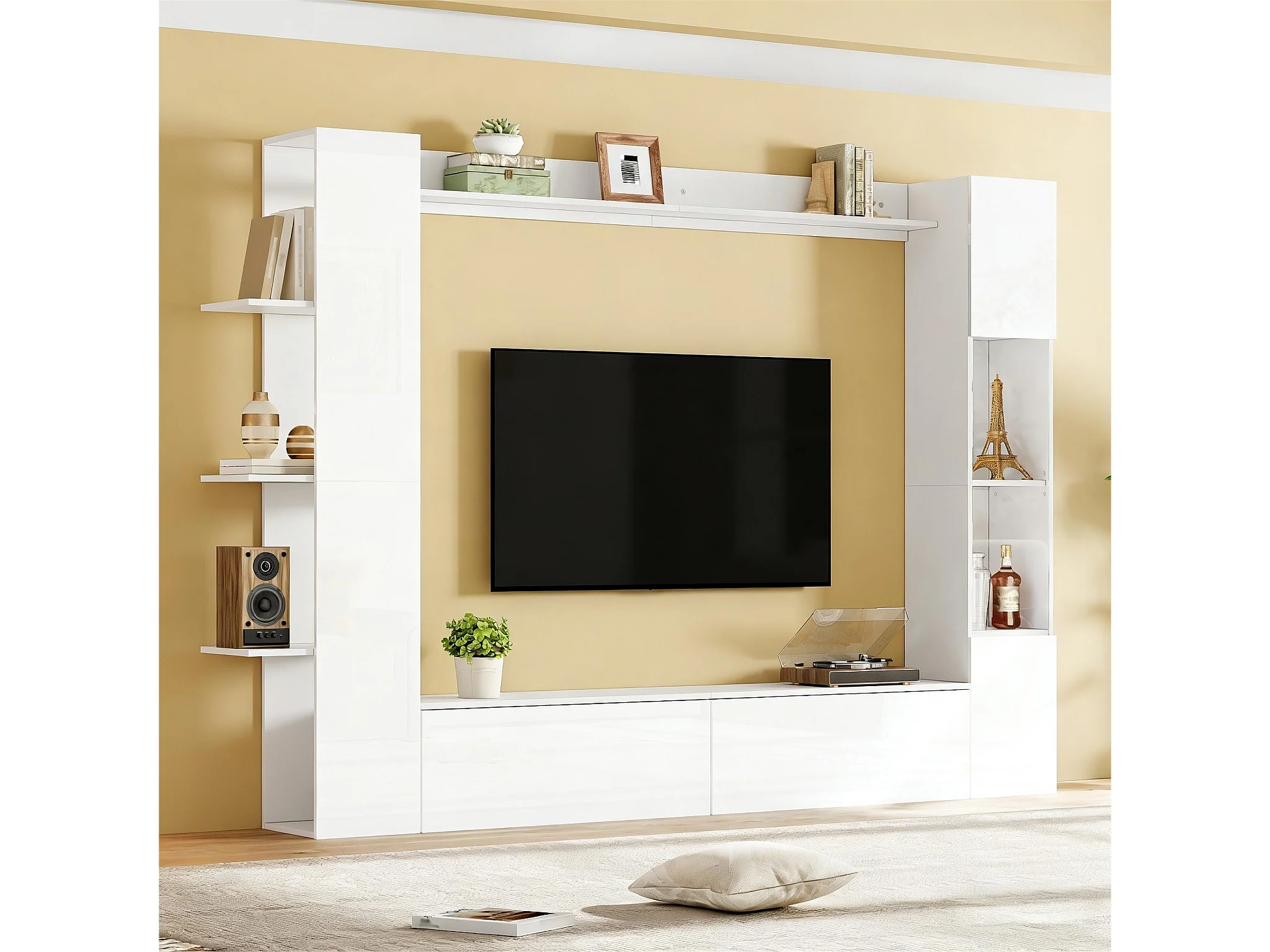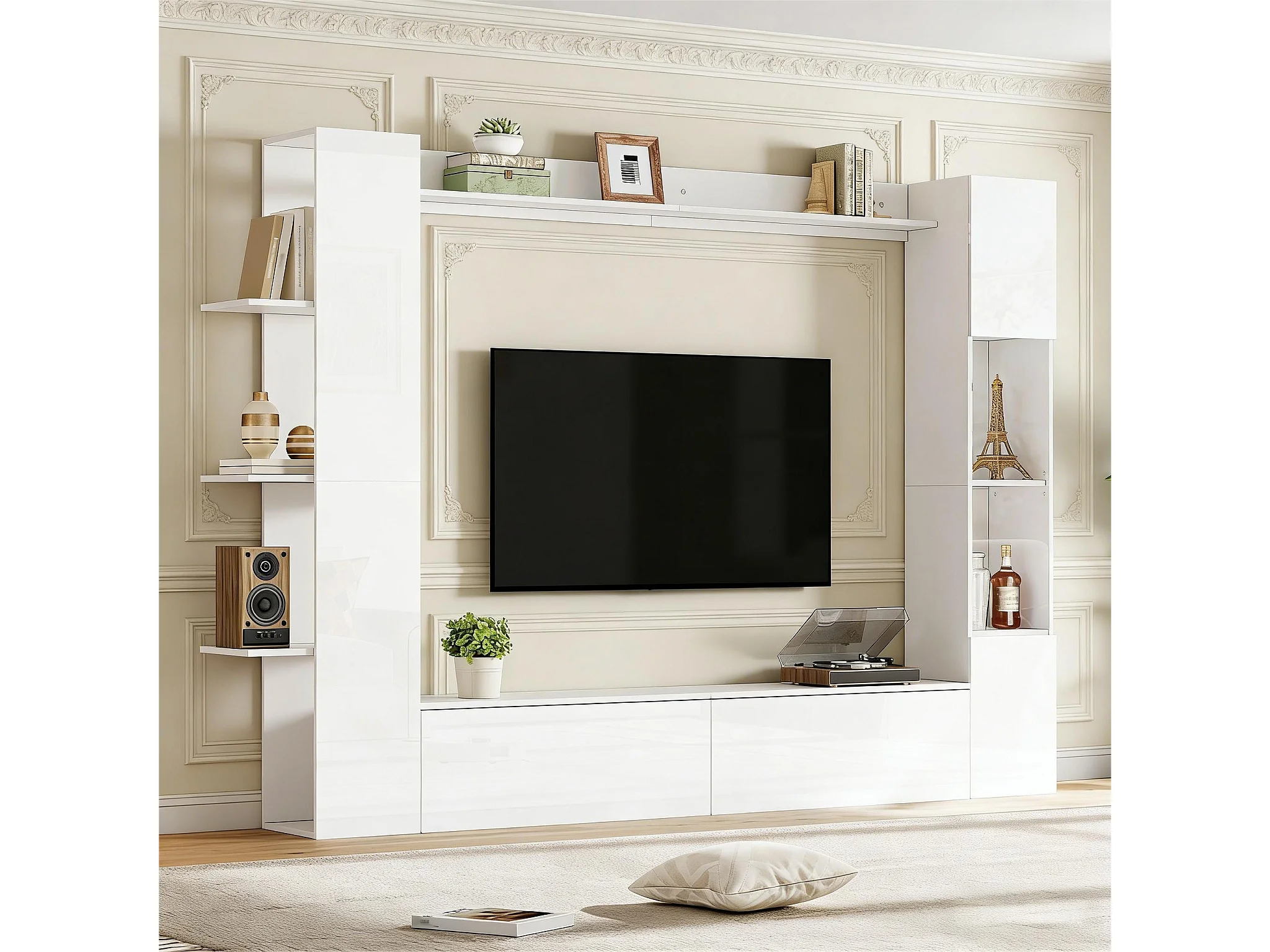 Meuble mural TV de salon(4 pièes) - 228 x 30 x 170 cm - avec meuble TV + vitrine + étagères de rangement - aggloméré - blanc