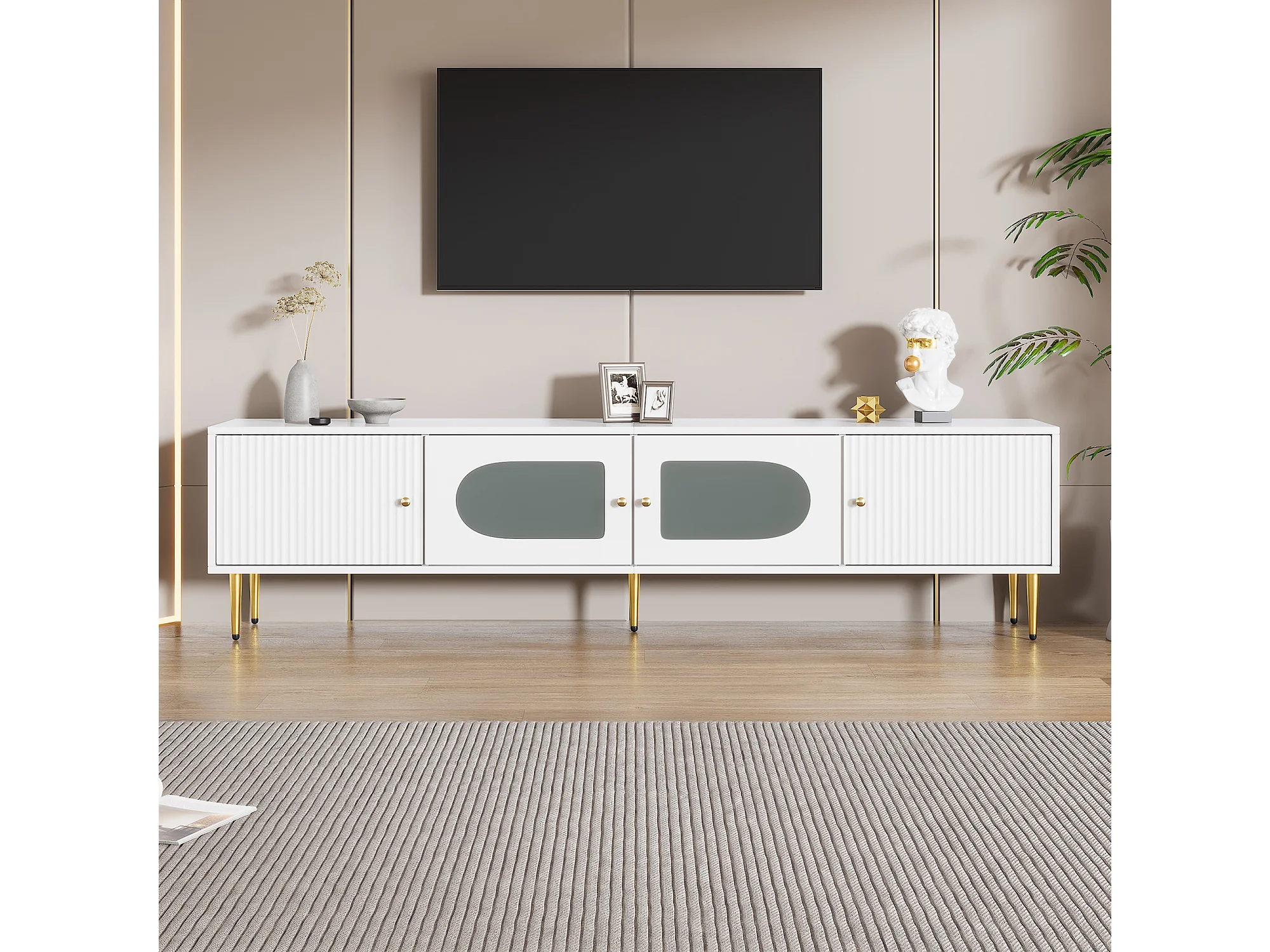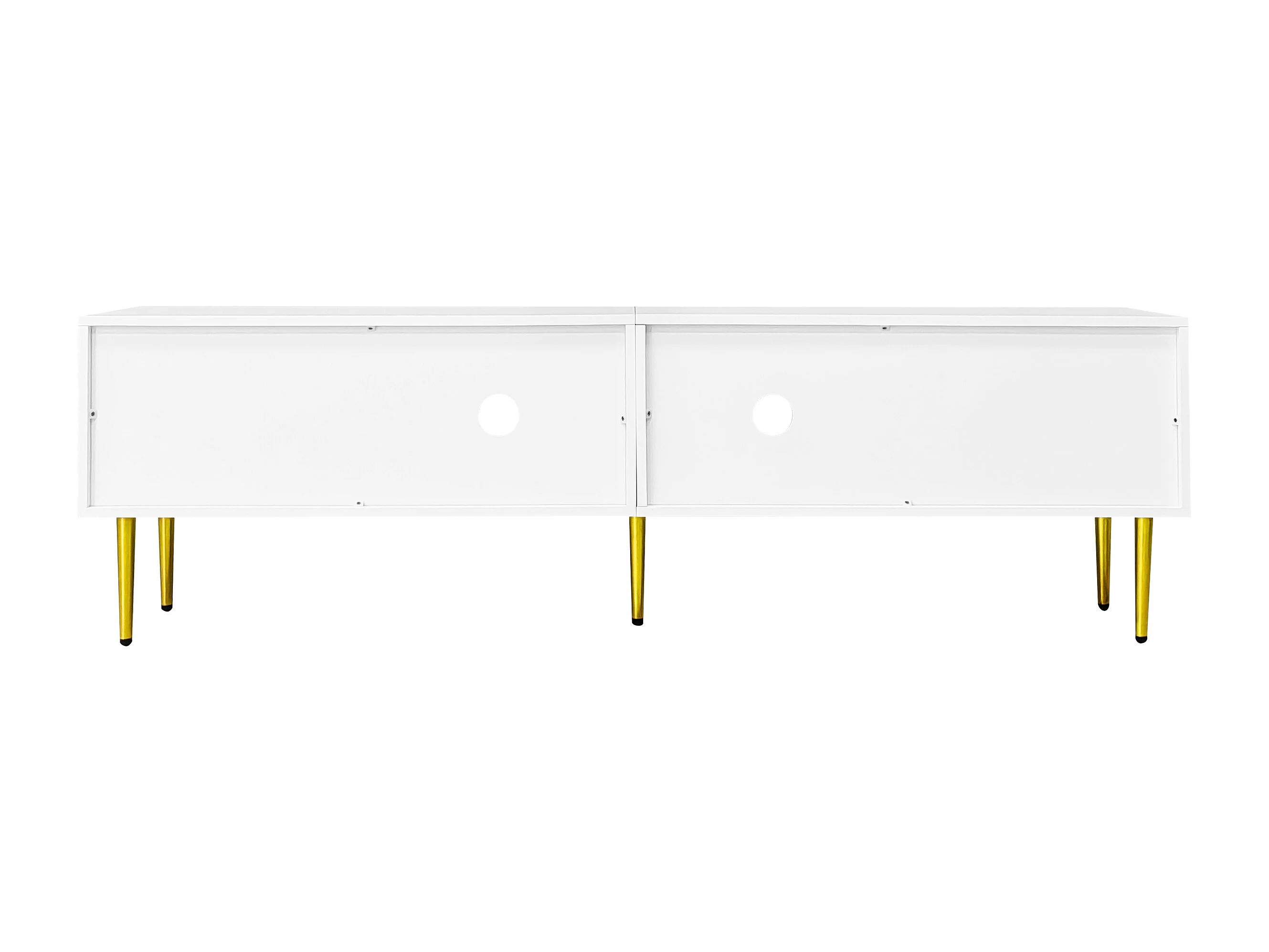 Meuble TV 170x35x50 cm 4 portes meuble de rangement en bois - poignées et pieds dorés - blanc
