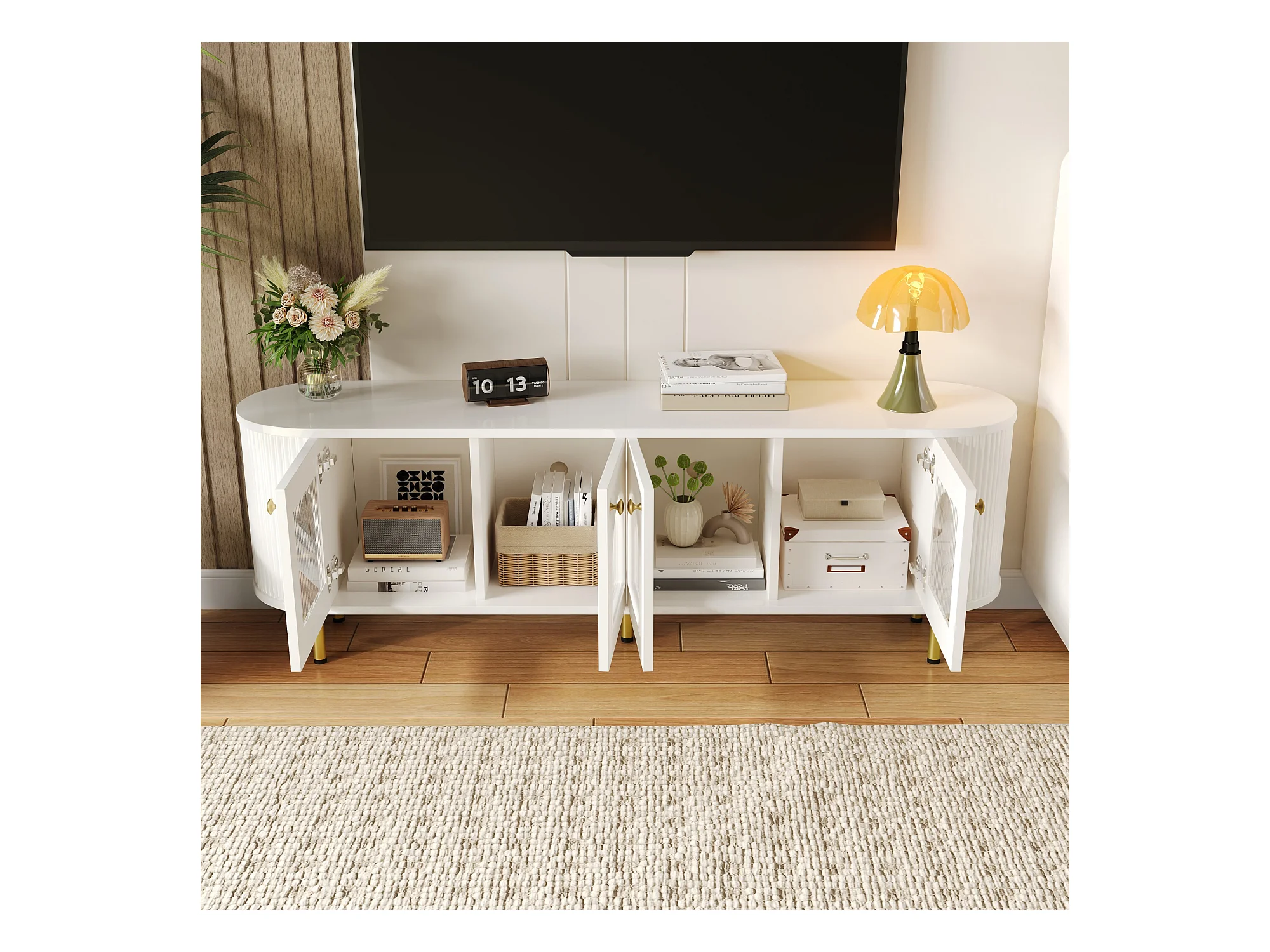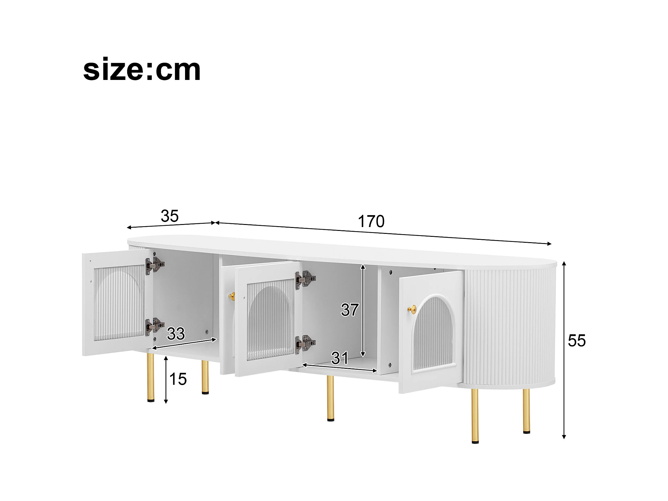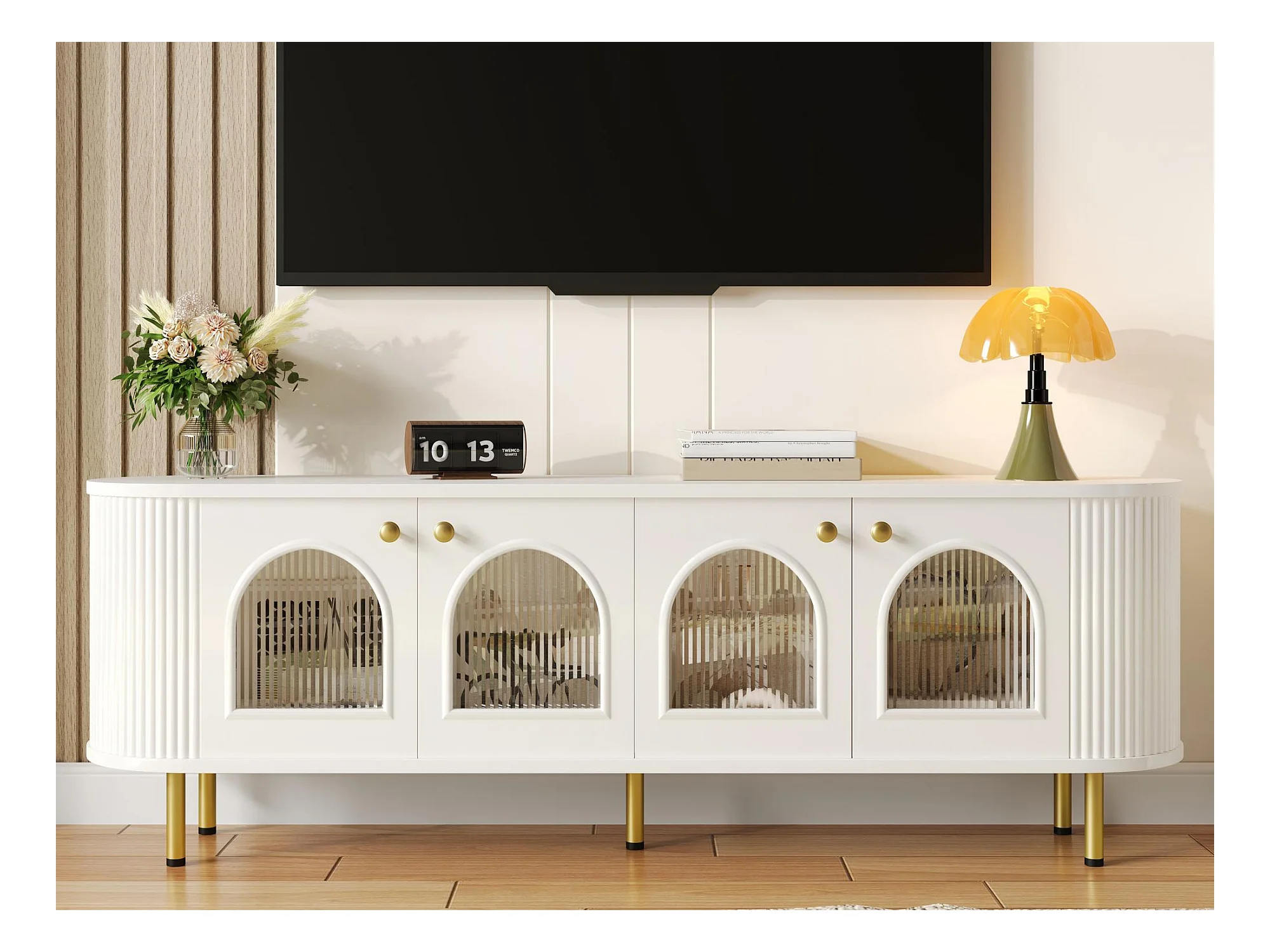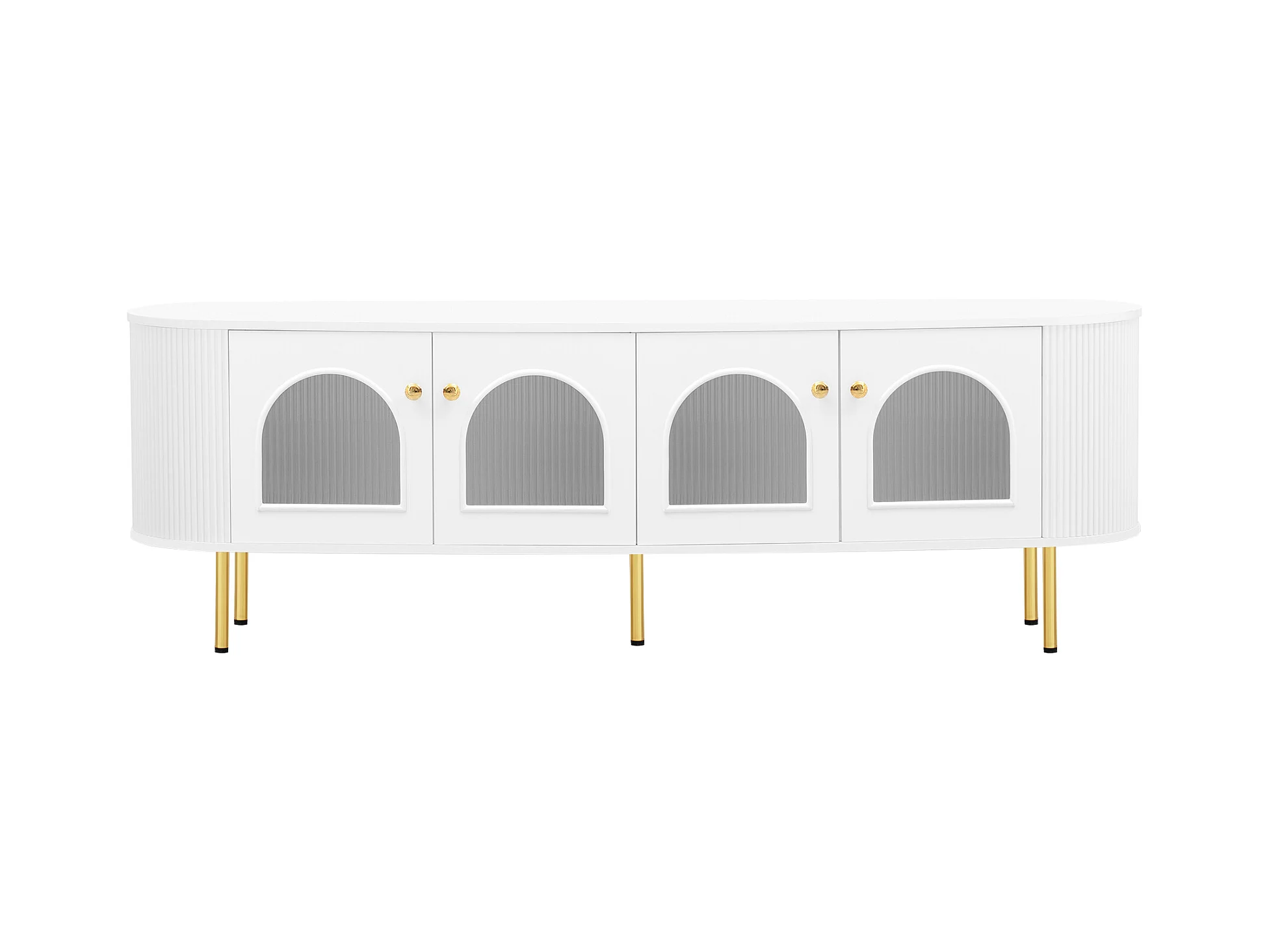 Meuble TV 170x35x55cm - avec 4 portes vitrées - poignées et pieds dorés - Blanc