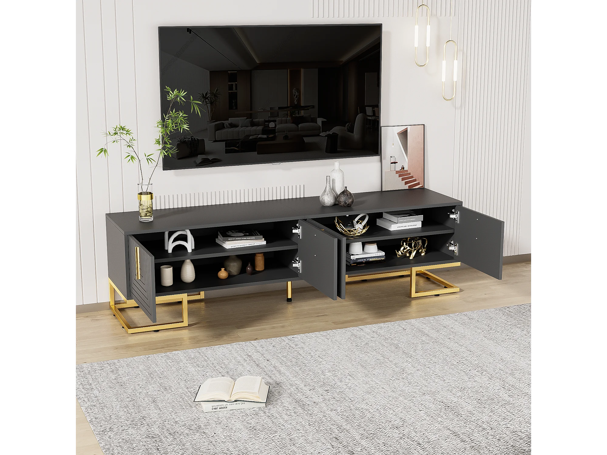 Meuble TV 170x40x45.5 cm avec support de rangement panneaux de particules en noir pour salon