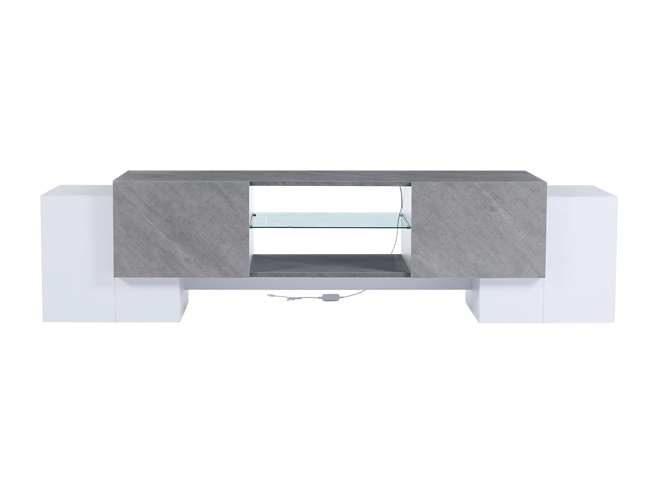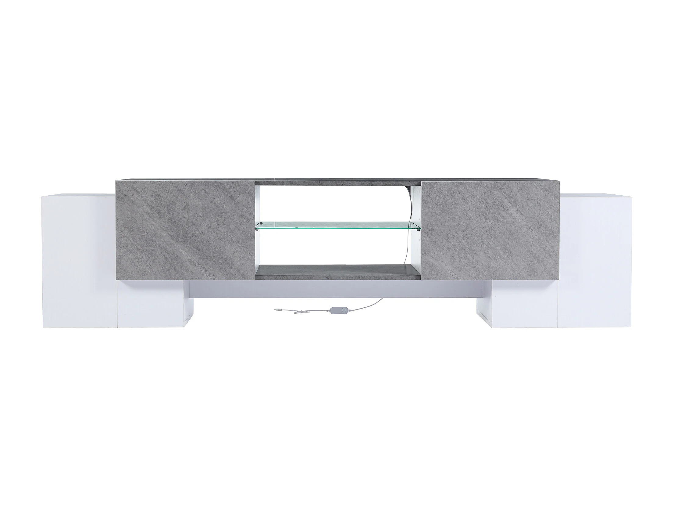 Meuble TV 180x40x46.5 cm LED salon avec 4 portes espace de rangement ouvert - verre décoratif - bois - blanc et gris