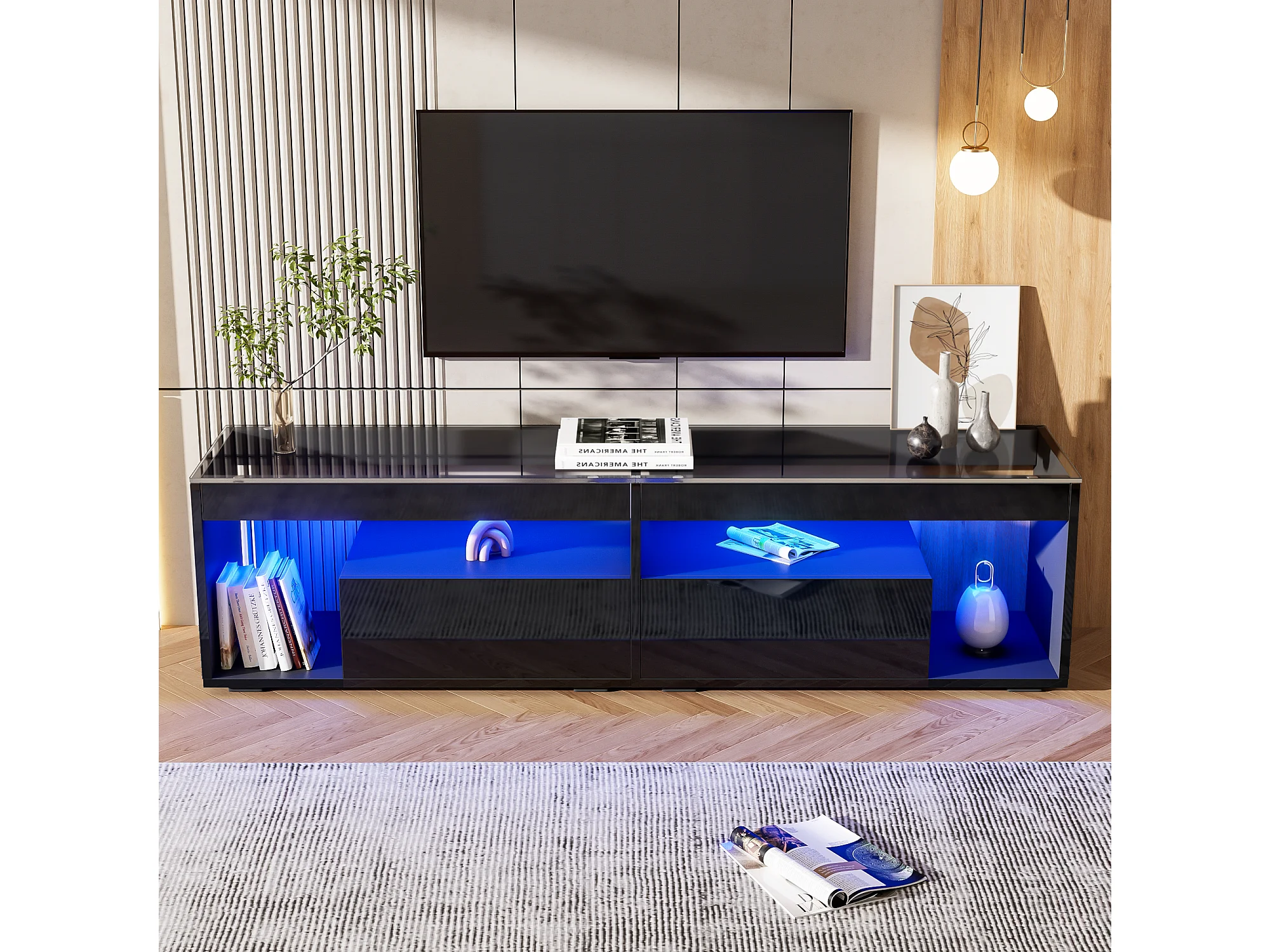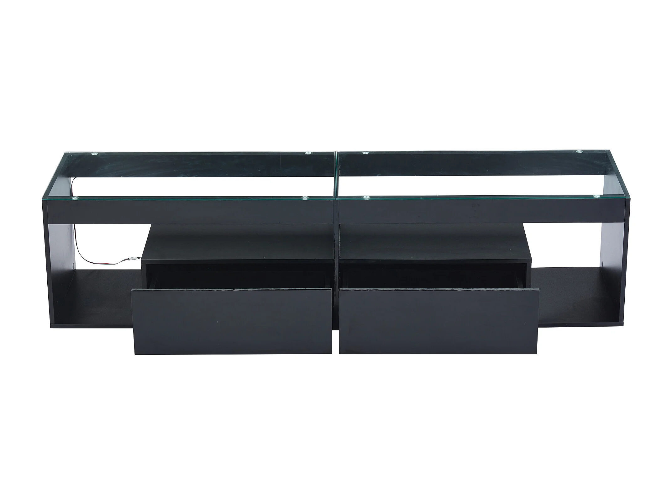 Meuble TV LED 180x40x46 cm, 2 tiroirs, verre trempé et panneaux de particules, noir