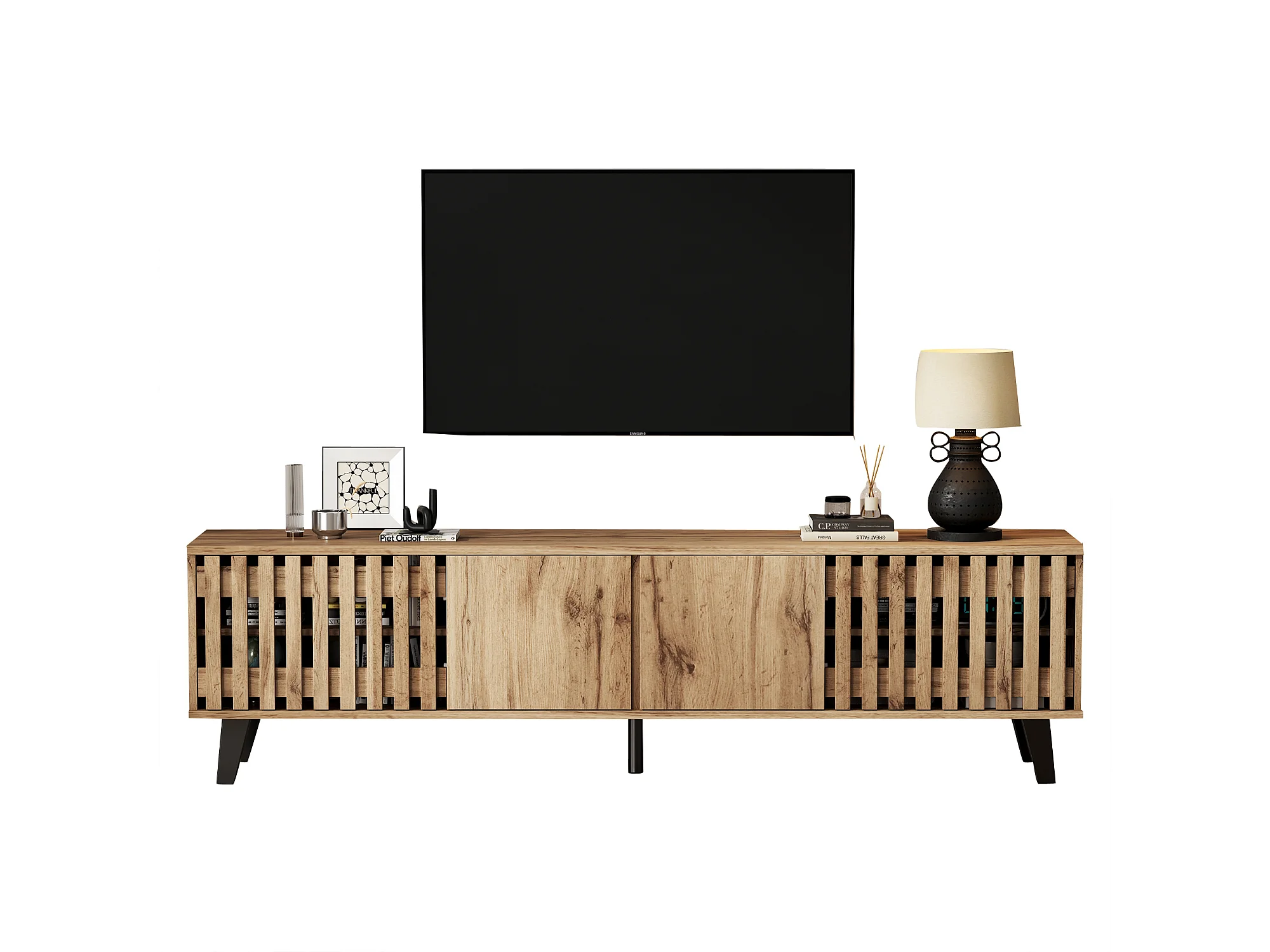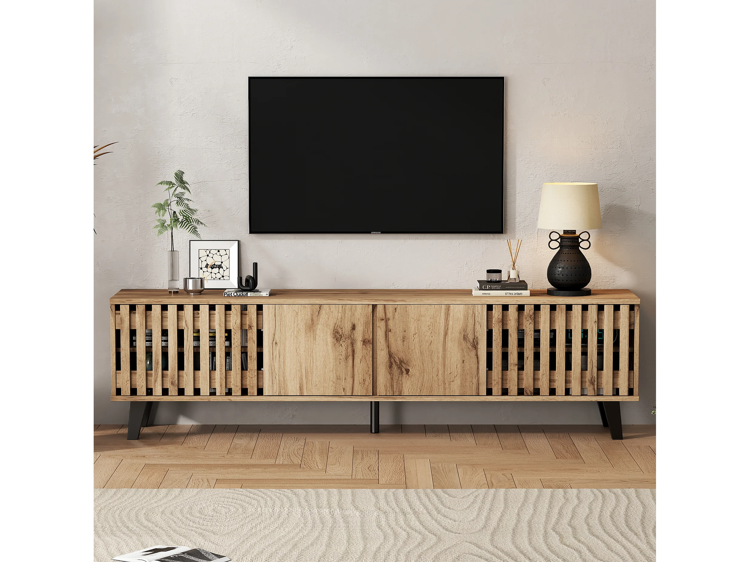 Meuble TV 180x40x55 cm, 8 compartiments et 4 portes, support 70 pouces, panneaux de particules, bois naturel