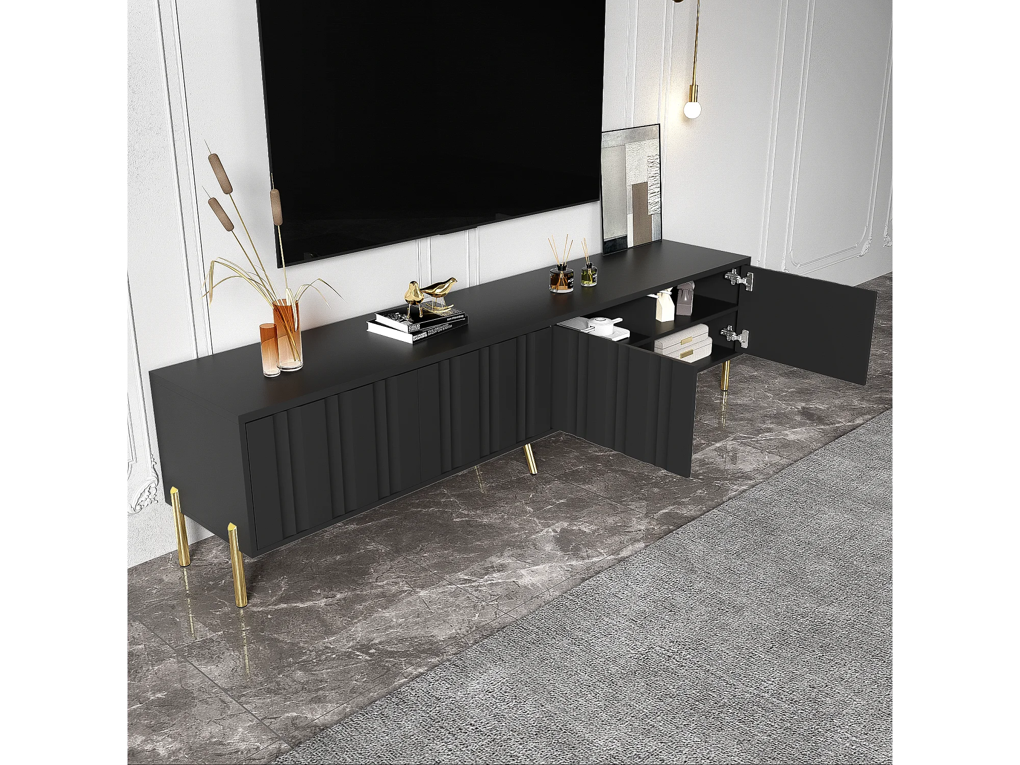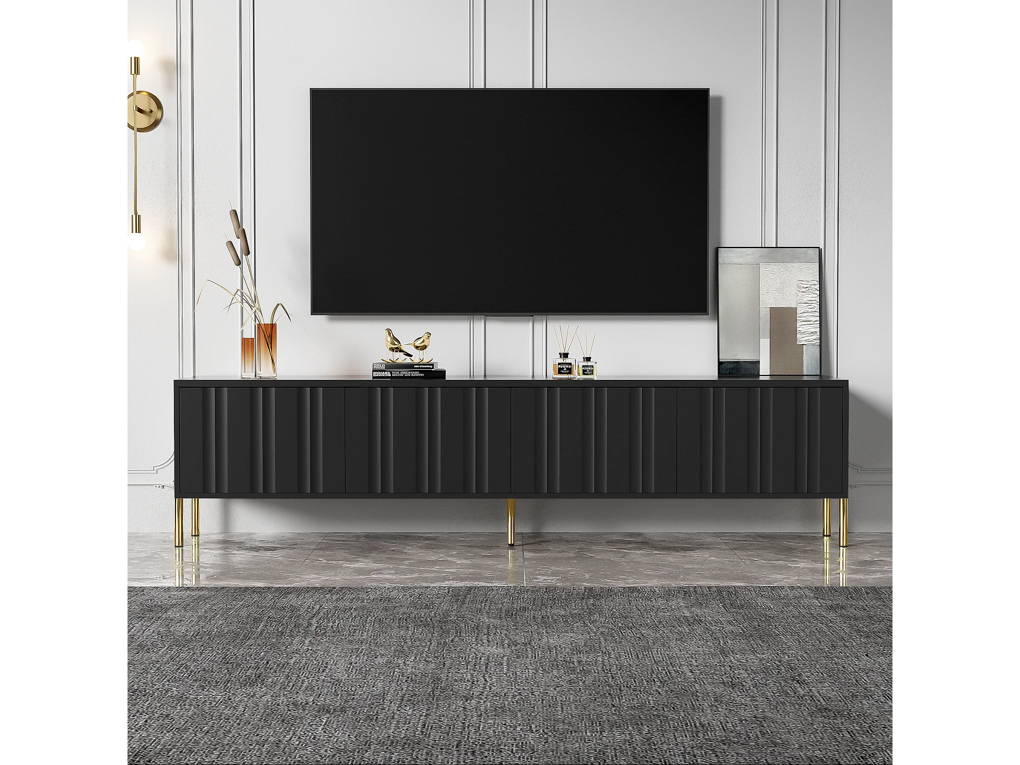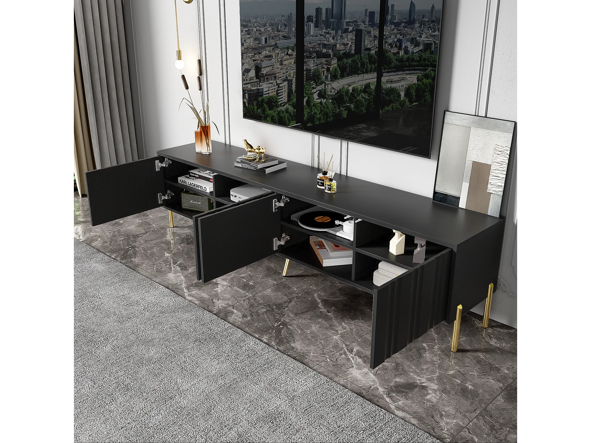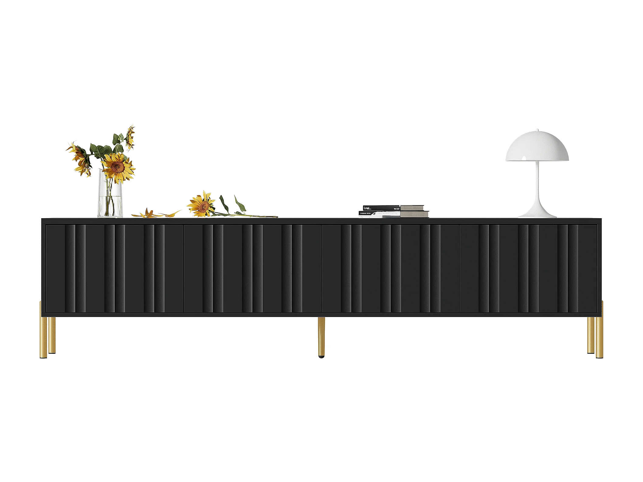 Meuble TV 190x38x48cm - Armoire avec 4 portes, pieds de table dorés, design de porte rainurée - Noir