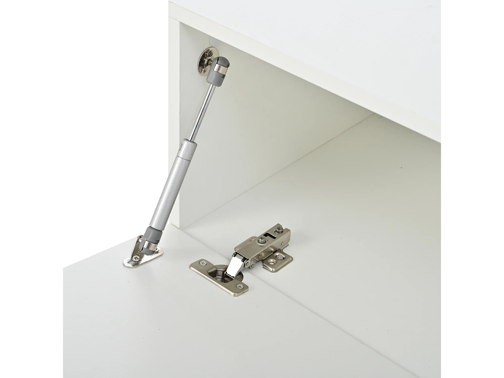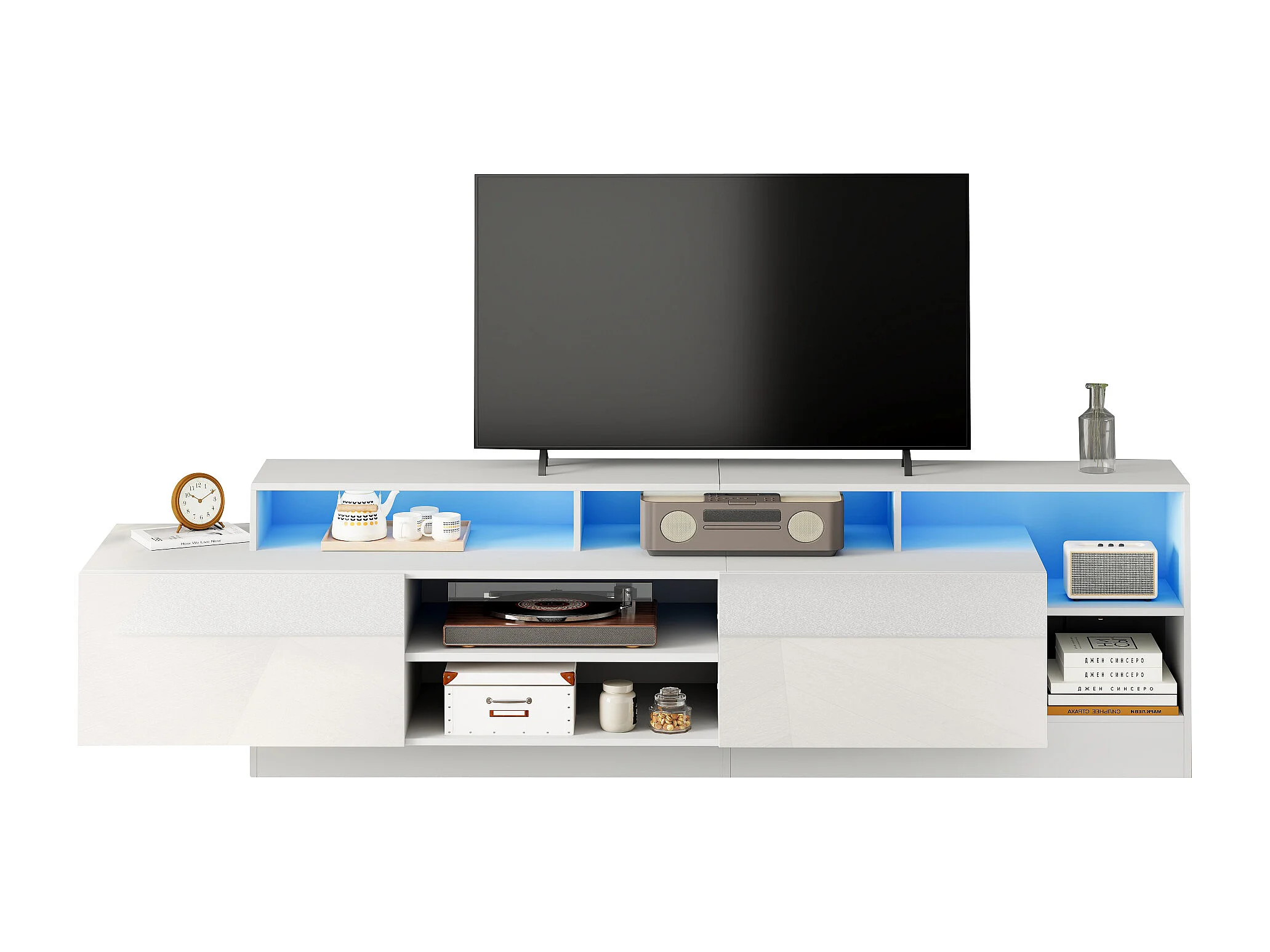Meuble TV 190x40x48,5 cm - avec éclairage LED - 2 portes abattantes - Espace de rangement ouvert - Finition brillante - Blanc