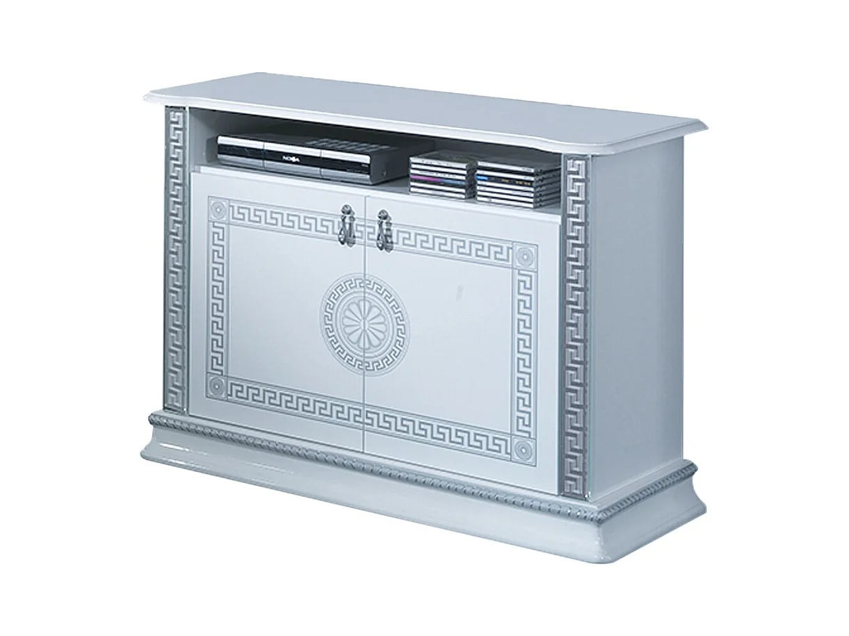Meuble TV 4 tiroirs 2 niches bois laqué blanc et argent Dannie