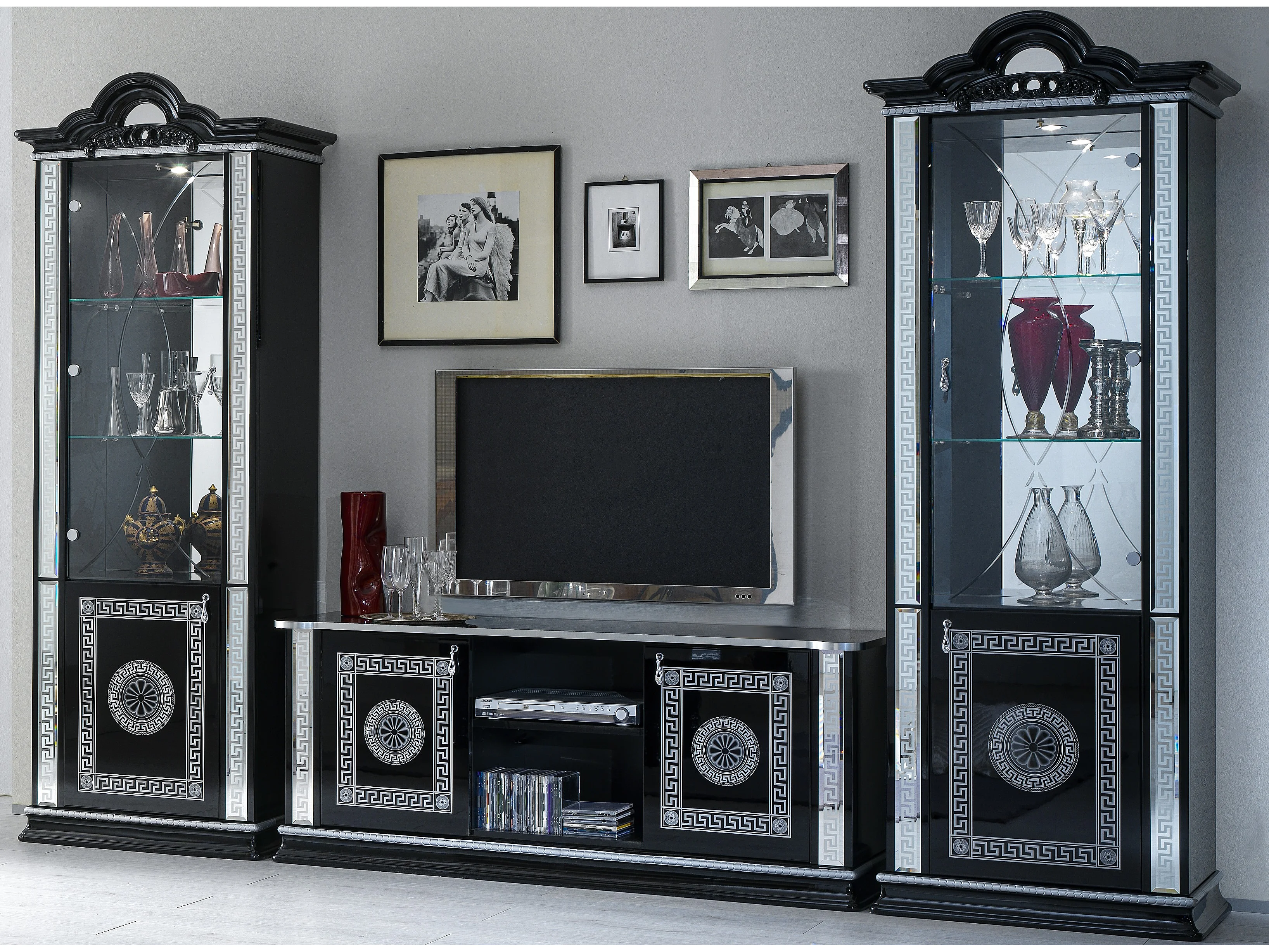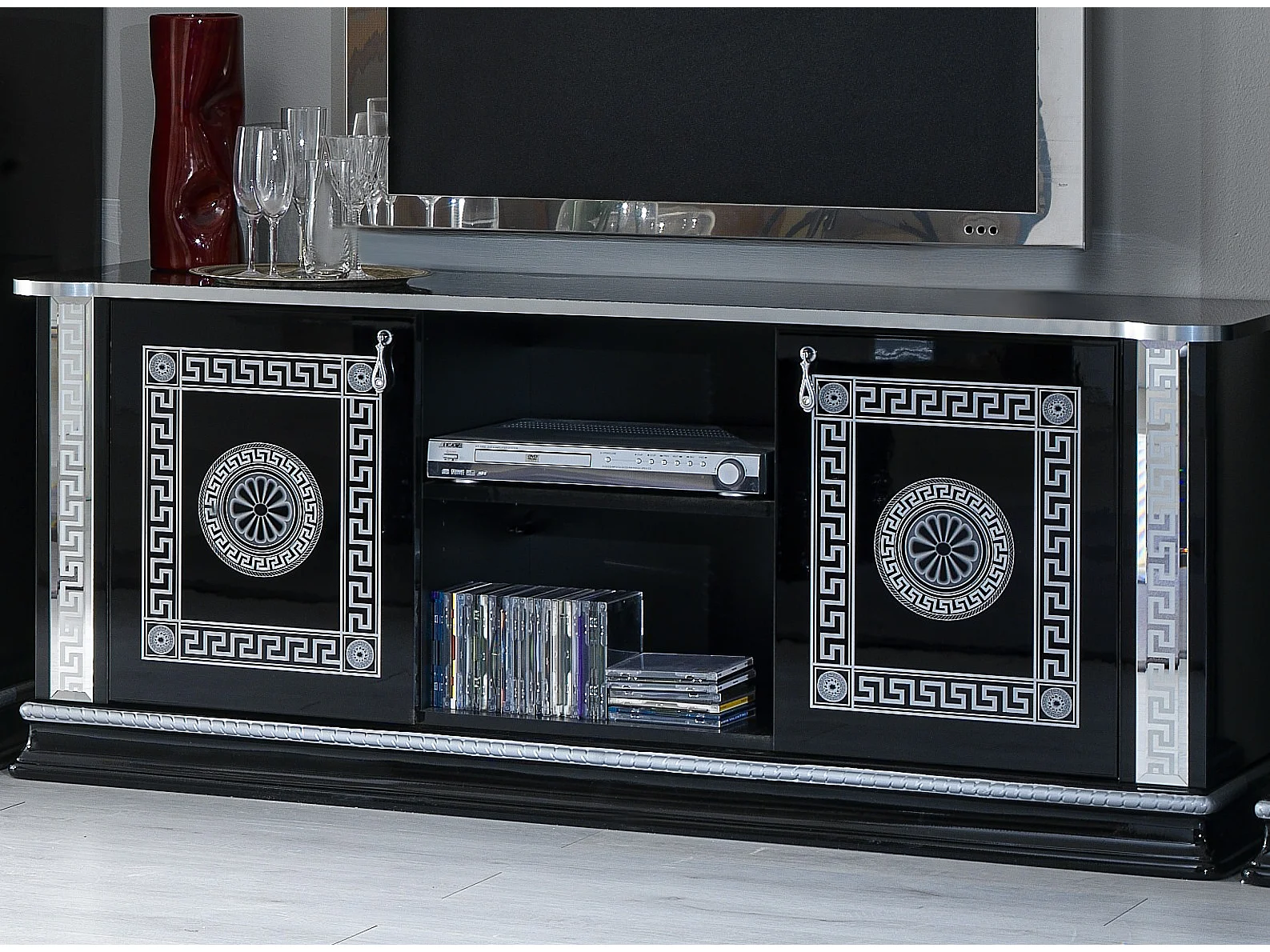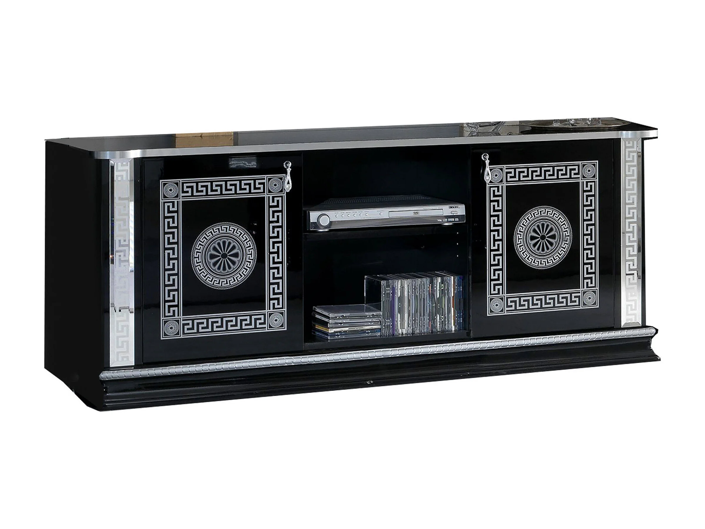 Meuble TV 180 cm - 3 portes et 3 niches - LEDs - laqué noir brillant