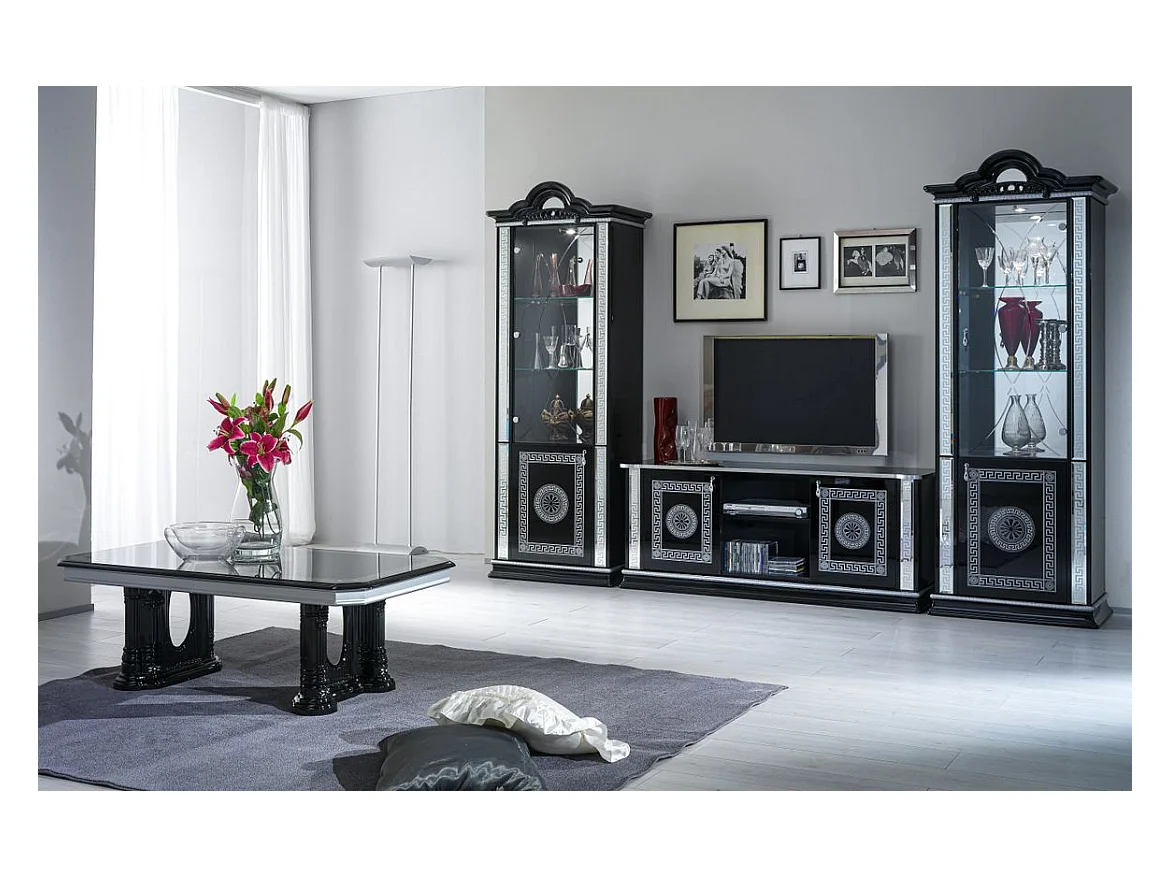 Meuble TV 2 portes 2 niches bois vernis laqué brillant noir et gris Venus 154cm