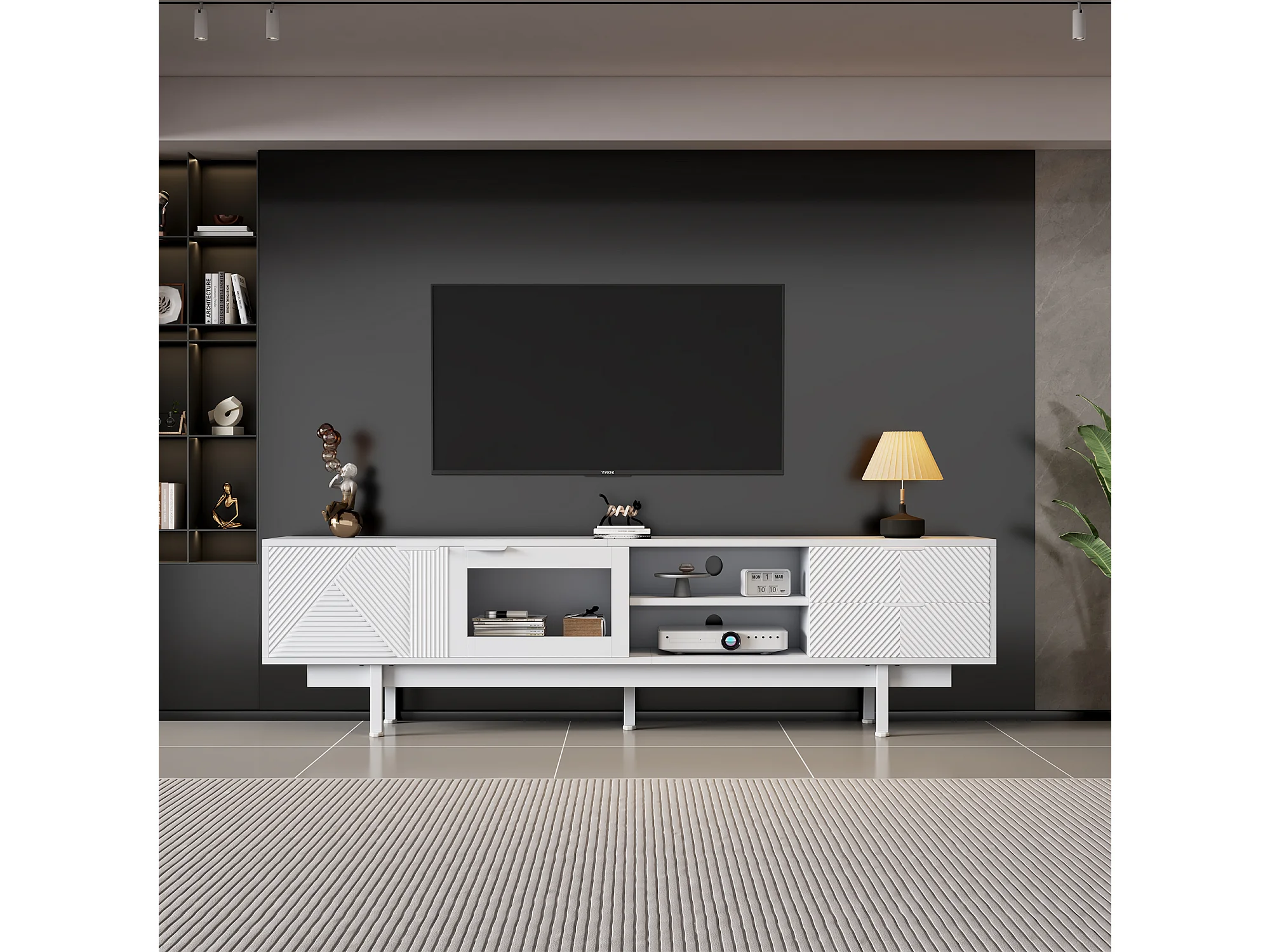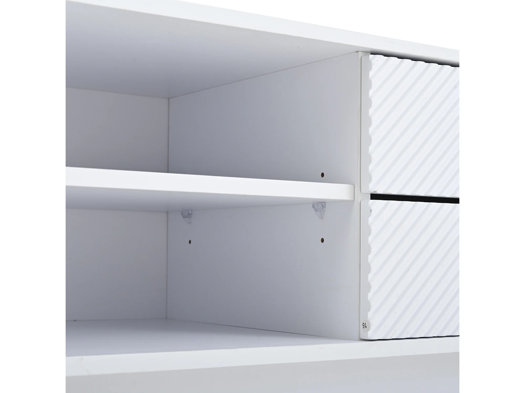 Meuble TV 200x40x50.5 cm avec 2 portes 2 tiroirs et rangement ouvert - verre décoratif - en bois - blanc