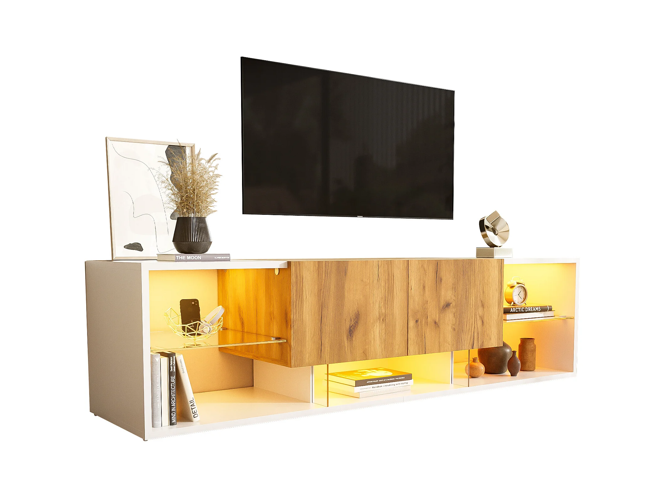 Buffet avec 2 portes et 4 tiroirs - étagère en verre - LEDs - coloris: blanc et chêne - 160x40x77cm