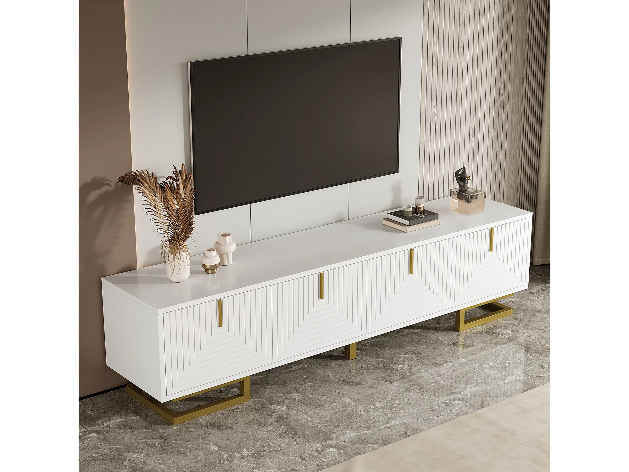Meuble TV avec portes structurées, 160 x 38 x 44,5 cm, meuble bas, avec tiroirs, pieds dorés, blanc