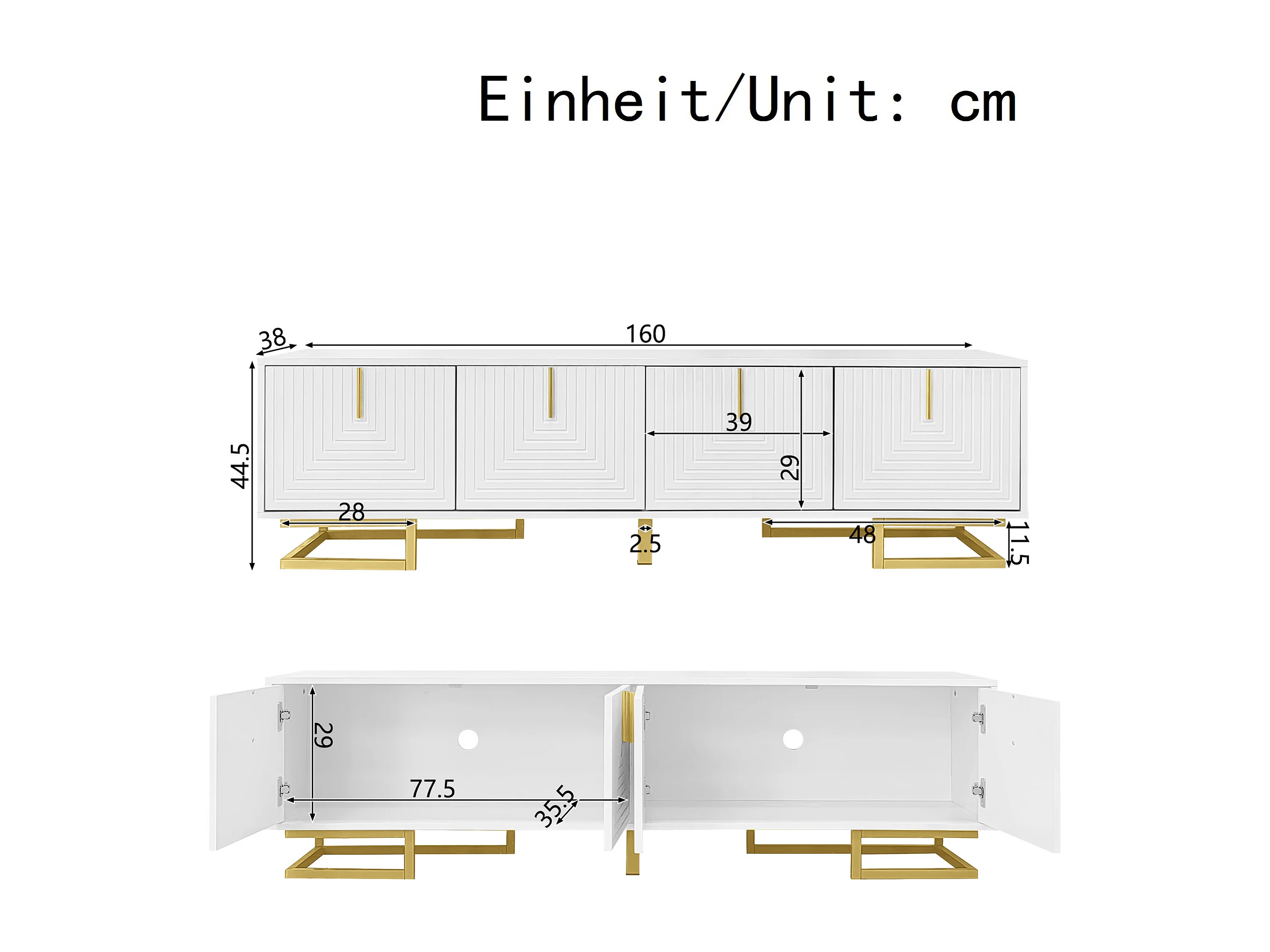 Meuble TV avec Portes Texturées, Meuble Bas avec Tiroirs Poignées Dorées et Pieds Dorés (Blanc)