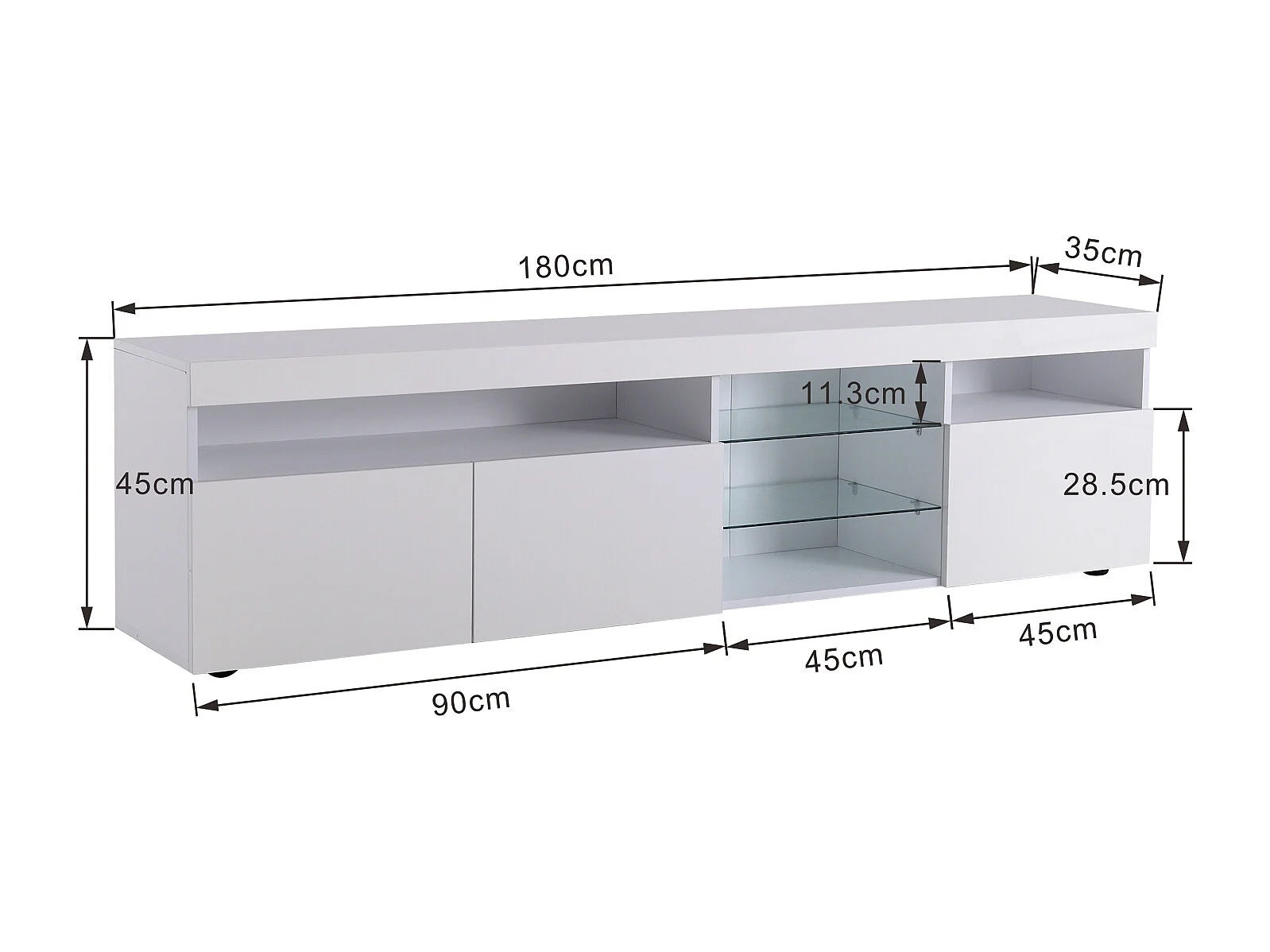 Meuble TV avec Rangement , 3 Portes et 2 étagères en Verre , Meuble TV avec LED Variable , Blanc